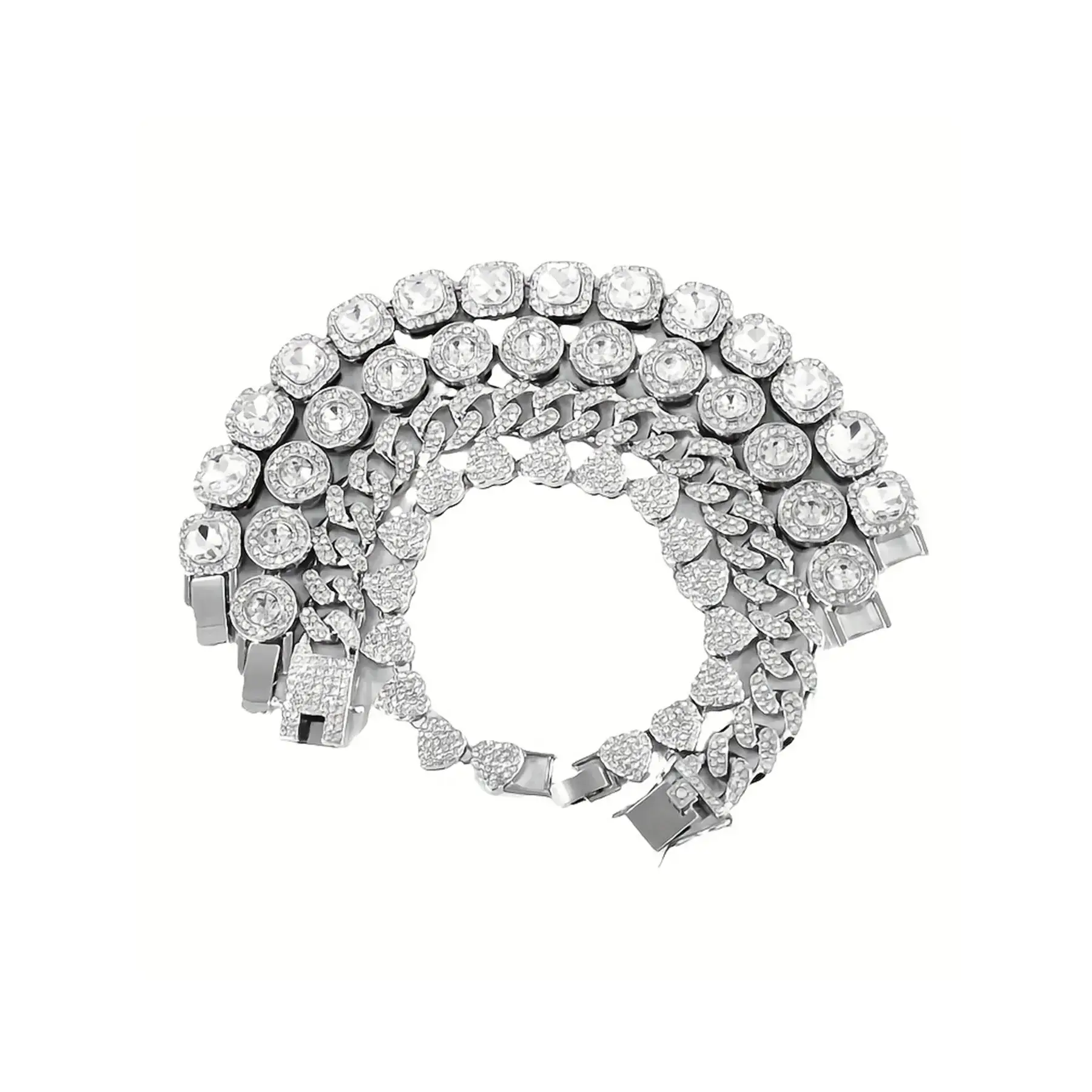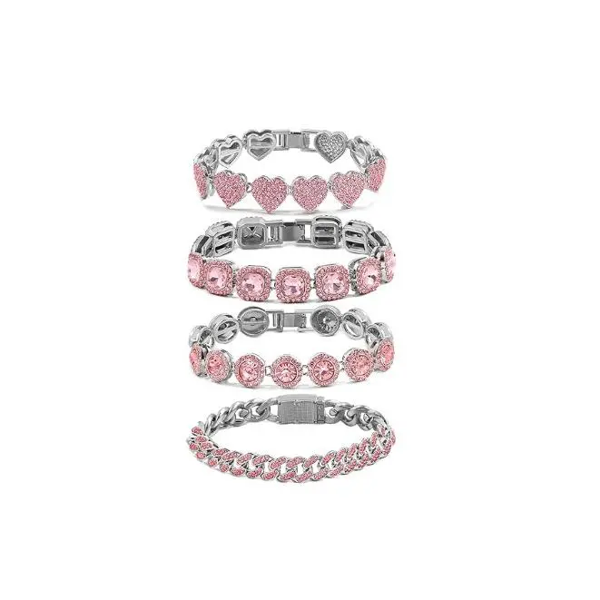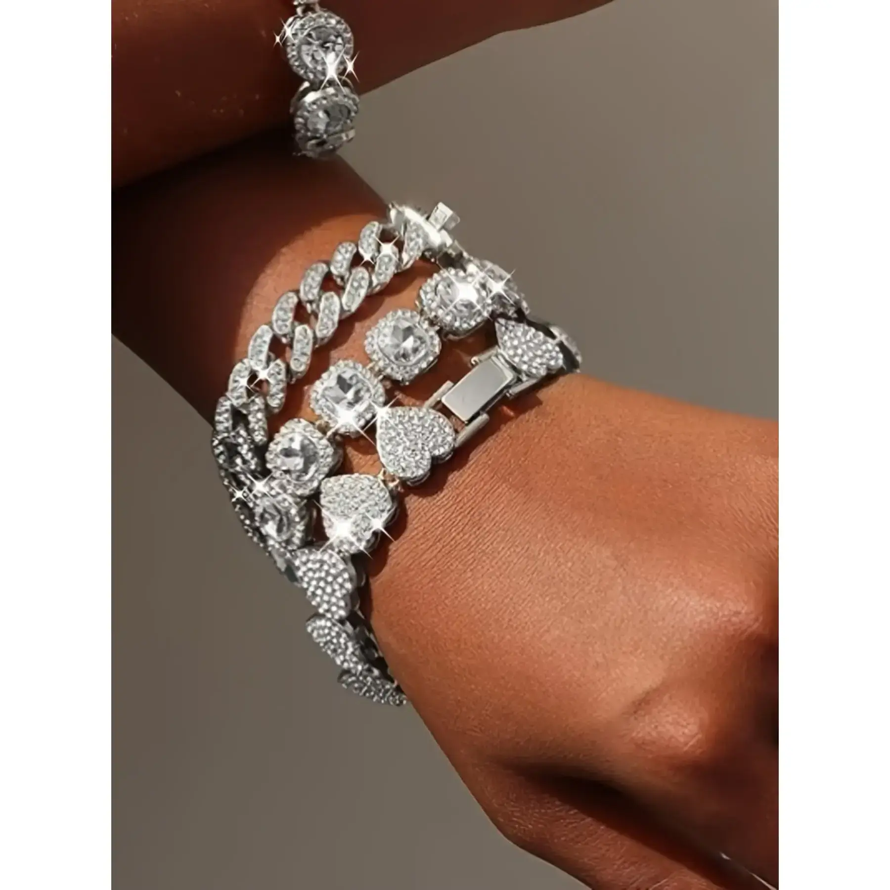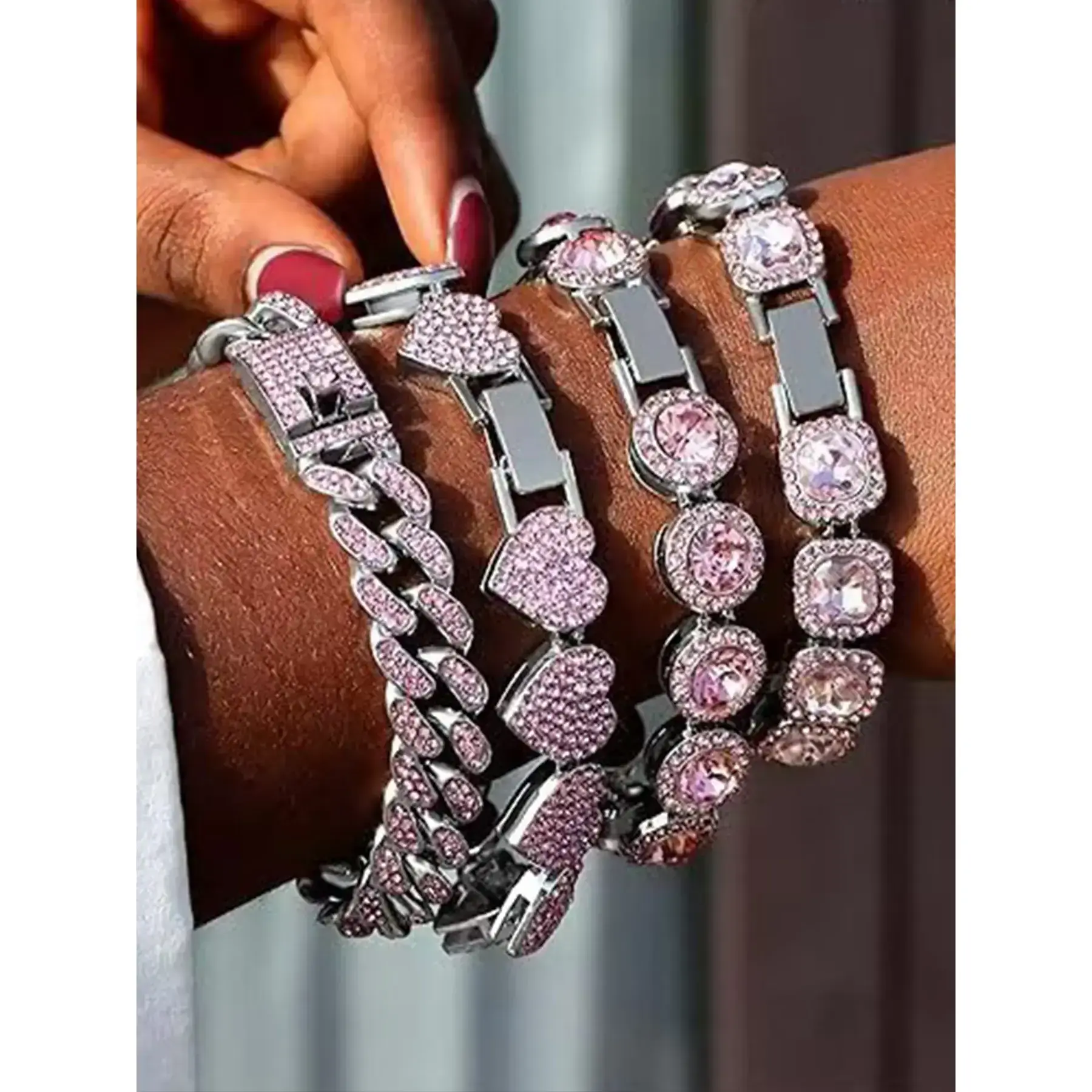 4 Piece Set Fashion Hip Hop Cuban Chain Luxury Full Rhinestone Polygon Bracelets, Exquisite Trendy Bracelet, New Round Square Bracelet Set, Casual Style