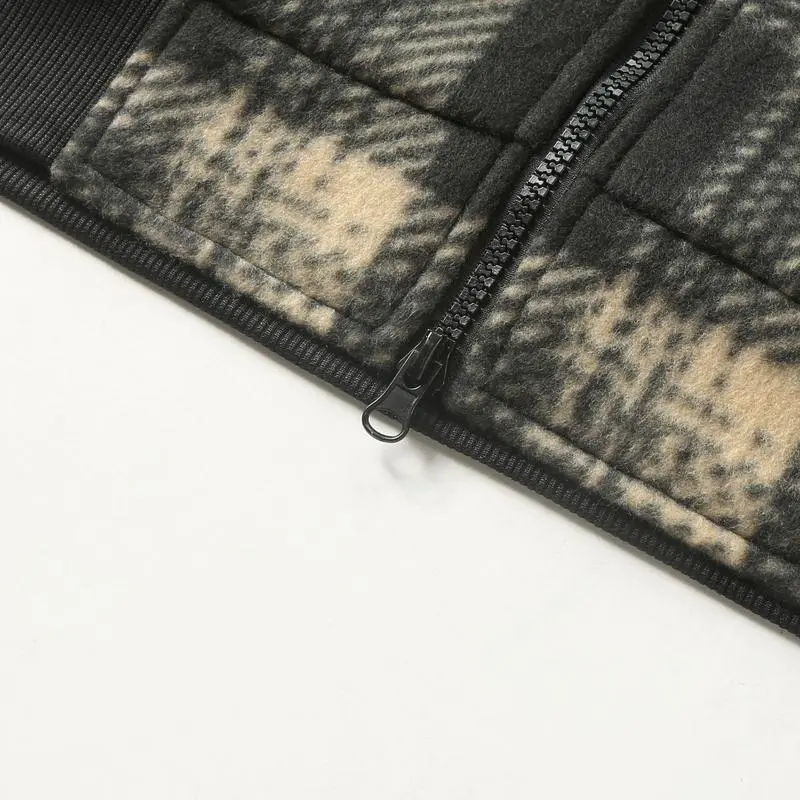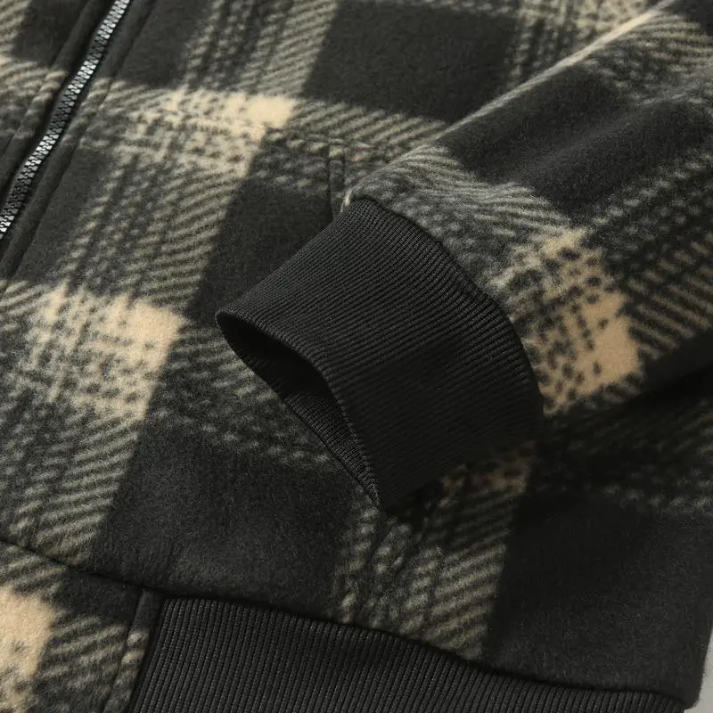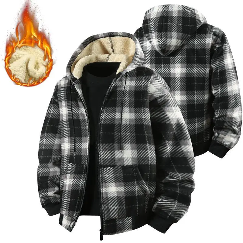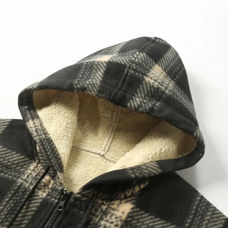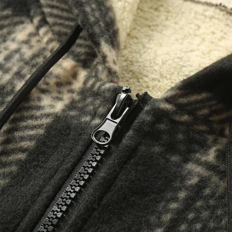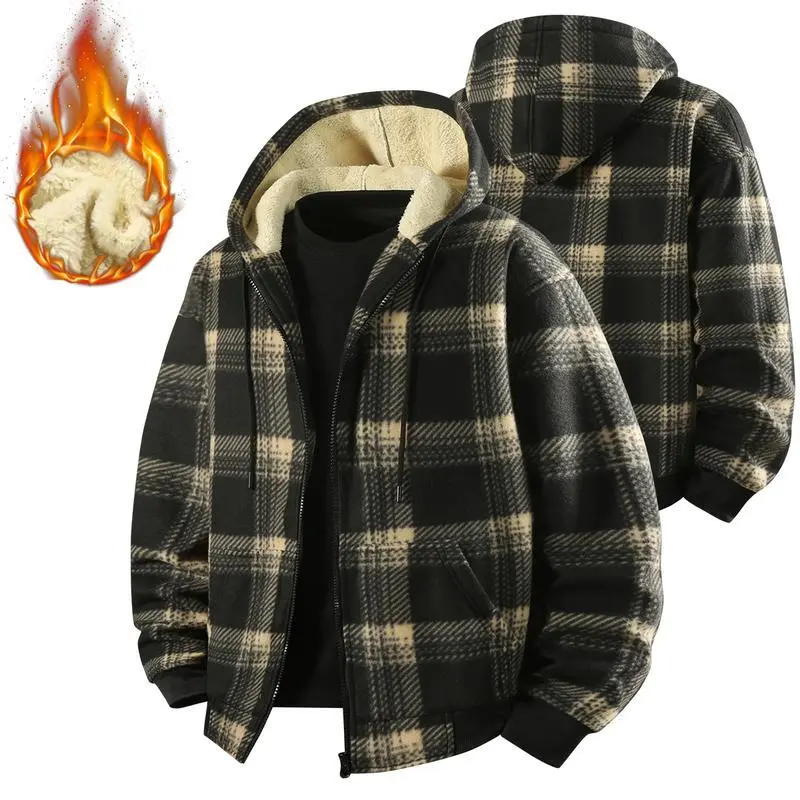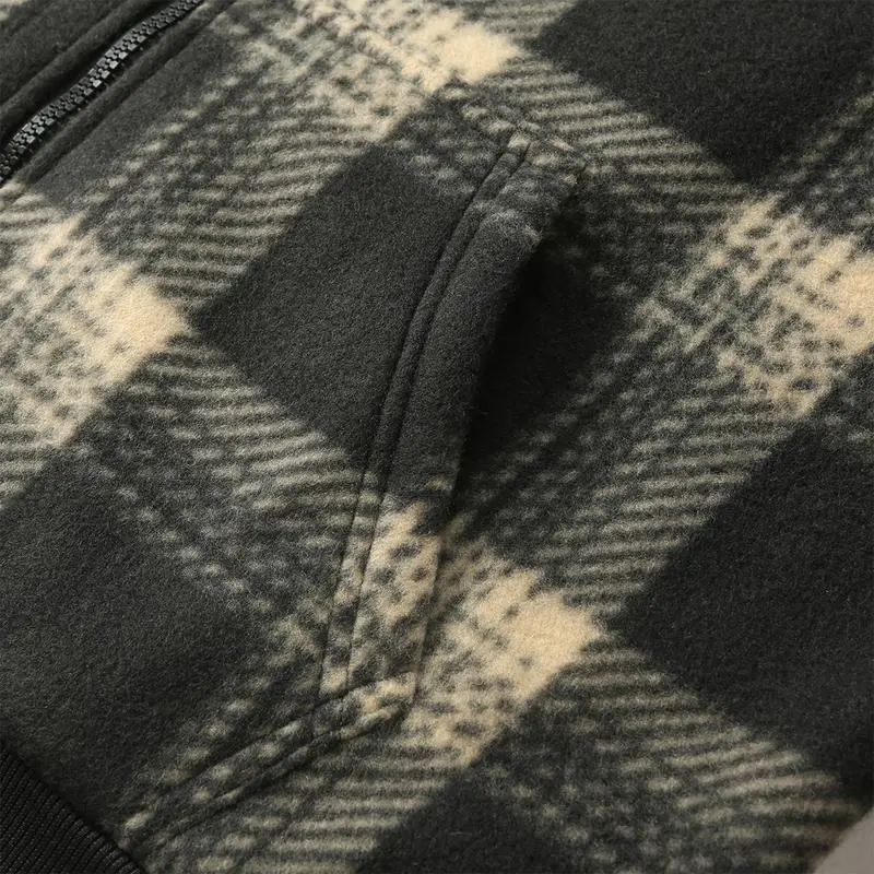 Men's Retro Fleece Jacket with Motorcycle Embroidered Stand Collar Hooded Sweatshirt Stylish Plaid Shirt Versatile Warm Top for Spring and Autumn