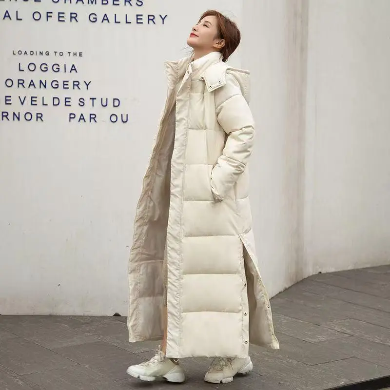 Extra Long Double Zipper Hooded Down Cotton Jacket for Women, Thickened and Warm Winter Coat, Waterproof Casual Fabric