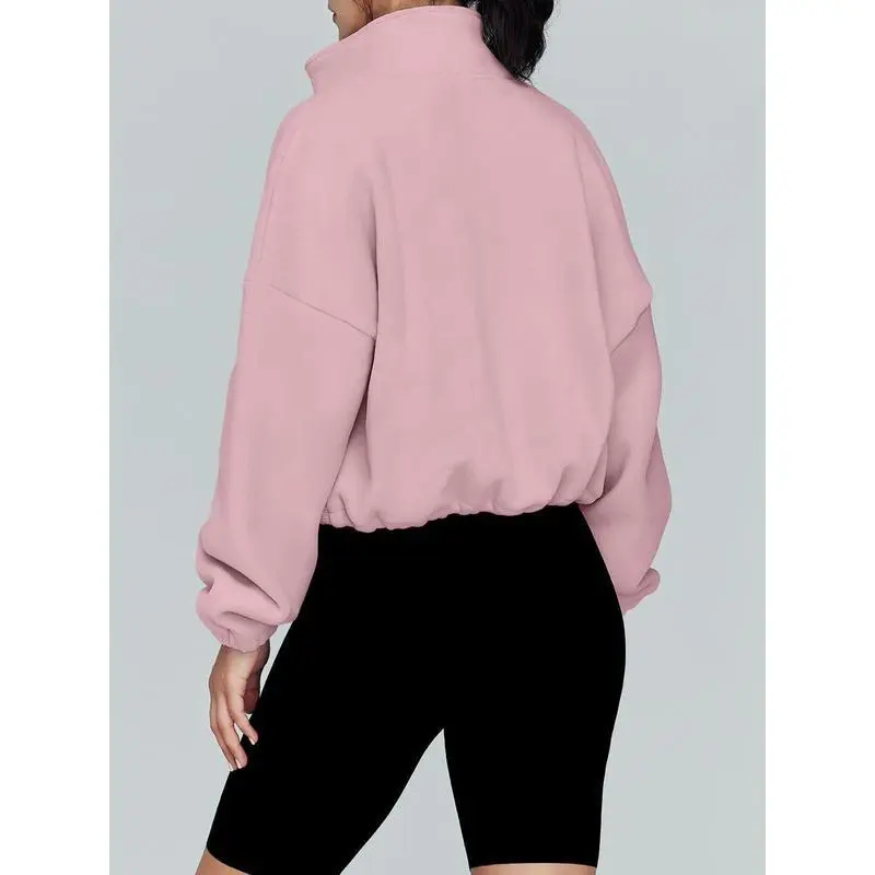 Details:Drawstring, Pocket, Zipper Neckline:Funnel Neck Sleeve Type:Drop Shoulder Style:Casual Type:Zip Up Hem Shaped:Tight Hem Color:Pink Pattern Type:Plain Sleeve Length:Three Quarter Length Sleeve Length:Regular Fit Type:Oversized Fabric:Medium Stretch Material:Knitted Fabric Composition:100% Polyester Care Instructions:Machine wash or professional dry clean Temperature:Spring/Fall (18-25℃/63-77℉) Sheer:No