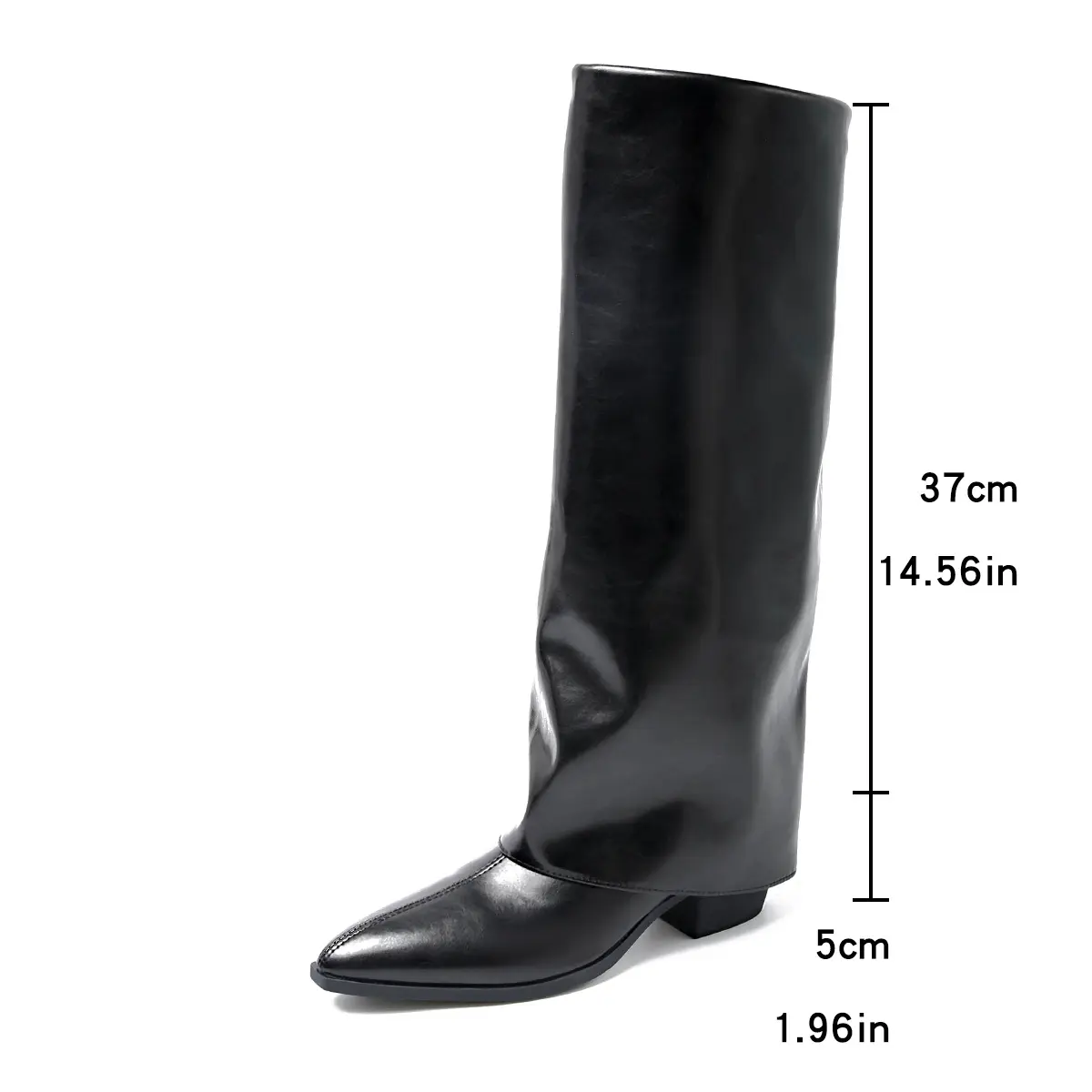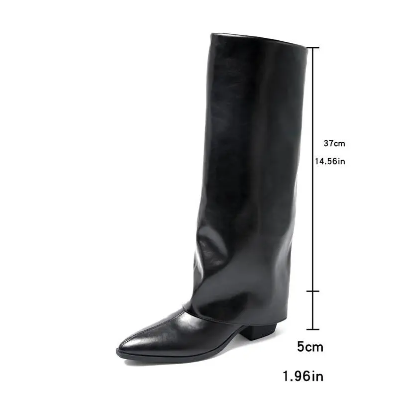 【Knee-height Boots】: These knee-high boots provide a refined look that enhances any outfit while offering additional leg coverage. 【Pointed Toe】: The pointed toe shape adds sophistication to the overall appearance, making these boots suitable for various settings. 【Foldable Feature】: The foldable design allows for easy storage and adds a unique aspect to the functionality of these attractive boots. 【Durable Materials】: Crafted from high-quality PU leather upper and rubber sole materials for increased longevity and wear resistance. 【Sturdy Block Heel】: Equipped with a solid block heel, these boots provide reliable stability and support for everyday wear.