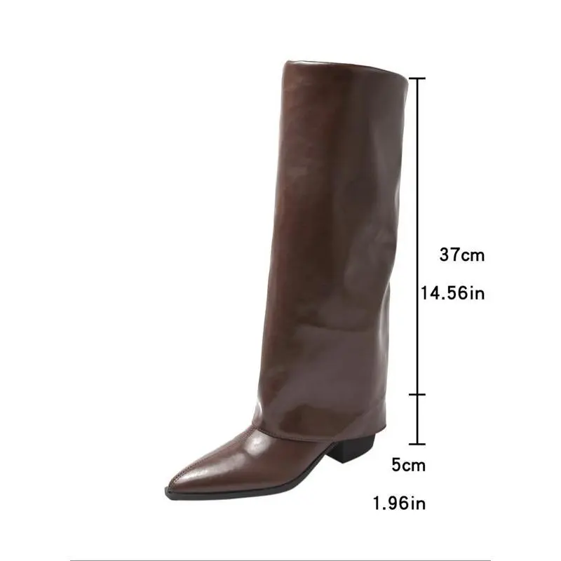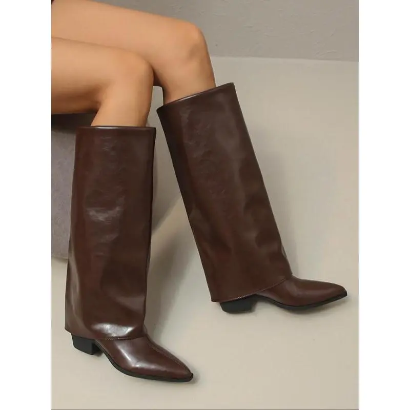 2025 new autumn and winter fashion pointed-toe women's boots, high-quality PU upper, long-tube style, stable thick heel, folding double-layer design fashion women's boots