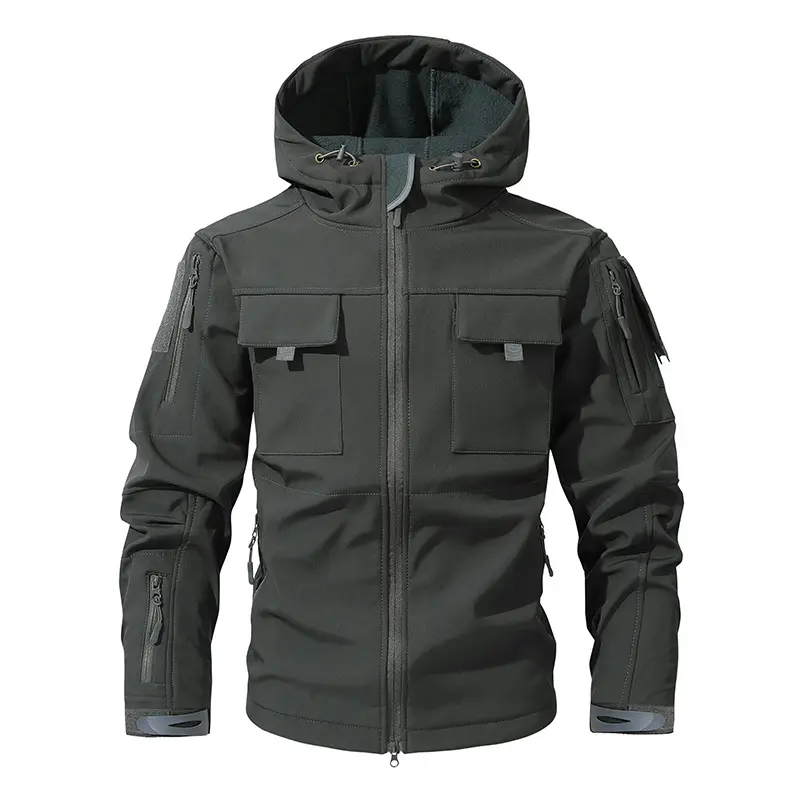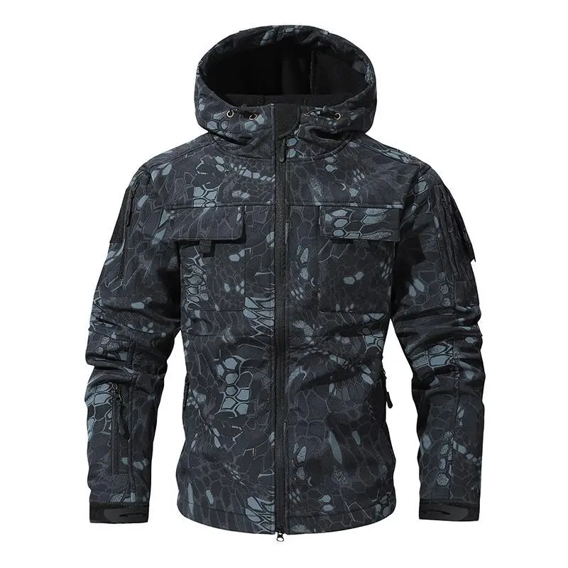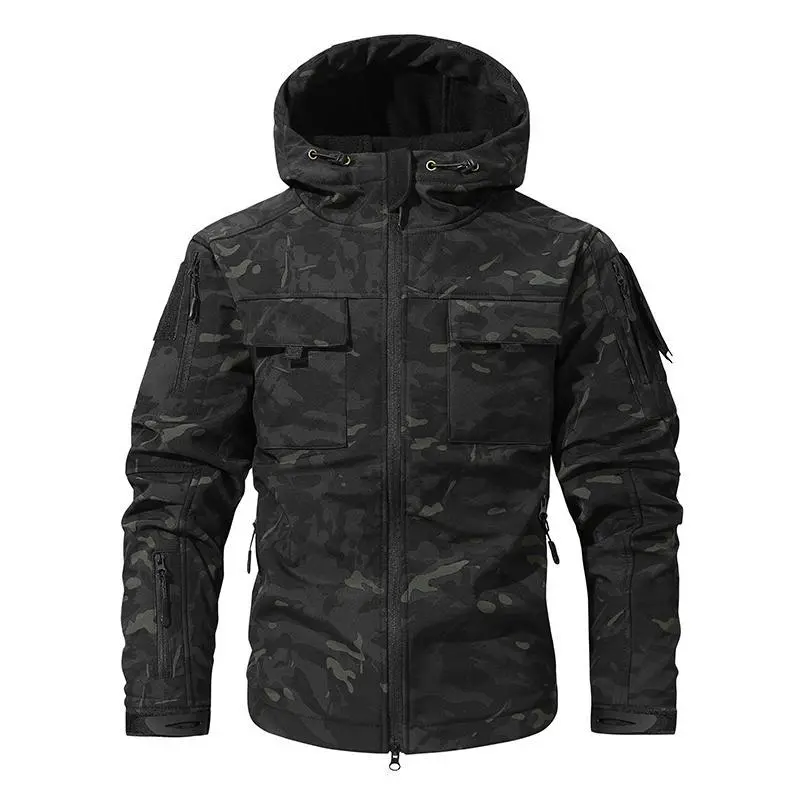 Men's Multi-Pocket Workwear Hooded Jacket, Camouflage Military Jungle Tactical Fleece Waterproof Jacket with Wool Lining, Windproof Cold-Resistant Softshell Winter Coat, Men's Long-Sleeve Top Outerwear casual
