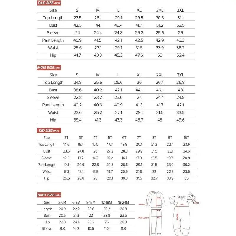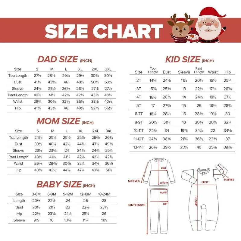 Whimsical Holiday Designs & Cherished Moments Create unforgettable memories with our Christmas-themed family pajama set, featuring playful prints like Santa Claus, reindeers, and snowflakes. Perfect for decorating the tree, sipping hot cocoa by the fire, or opening gifts on Christmas morning, these coordinating pajamas turn every holiday moment into a photo-worthy celebration . The vibrant, fade-resistant patterns capture the spirit of the season while ensuring your family stands out in festive photos. Complete Family Sizing for Every Member Available in sizes from newborn to adult, our matching sets include options for mom, dad, kids, and toddlers. The stretchy fabric accommodates growing children and provides a relaxed fit for adults, ensuring everyone feels comfortable and festive . Mix and match styles or opt for identical designs—the choice is yours to create a unified holiday look.
