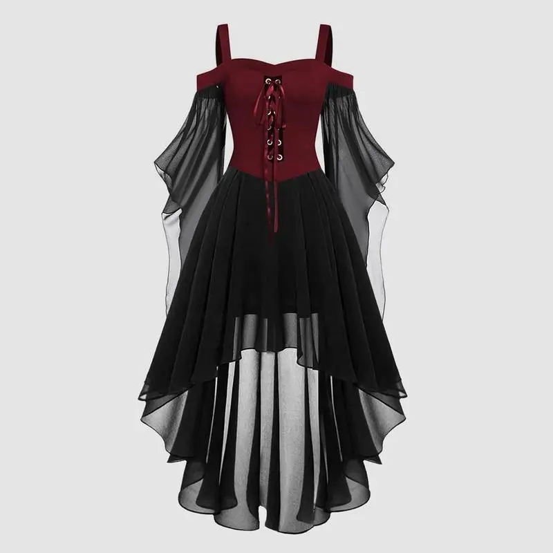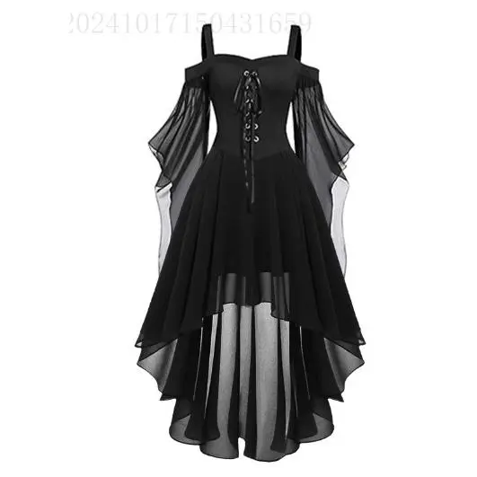 Material:Crafted from high-quality polyester blend with delicate lace and mesh overlays, this witch dress combines durability with haunting elegance.The breathable fabric features a soft lining for comfort during extended wear, while the structured bodice offers flattering silhouette shapingDesign:Exquisite details include a square neckline with corset lace-up front, dramatic bell sleeves with lace cuffs, and a flowing A-line skirt.Available in classic gothic colors (black, burgundy) with ornate silver-toned trims for authentic vintage appealMatch:Pair with fishnet gloves and platform boots for witchy vibes, or layer over a poet blouse for Renaissance fair elegance.Accessorize with pentagram necklaces or crystal brooches to complete different looks - from vampire queen to mystical sorceressOccasion:Ideal for witch balls, vampire masquerades, or haunted castle events. Equally stunning for cosplay conventions, gothic weddings, or Halloween stage performancesMachine washable, hand washes cold water. Do not bleach.