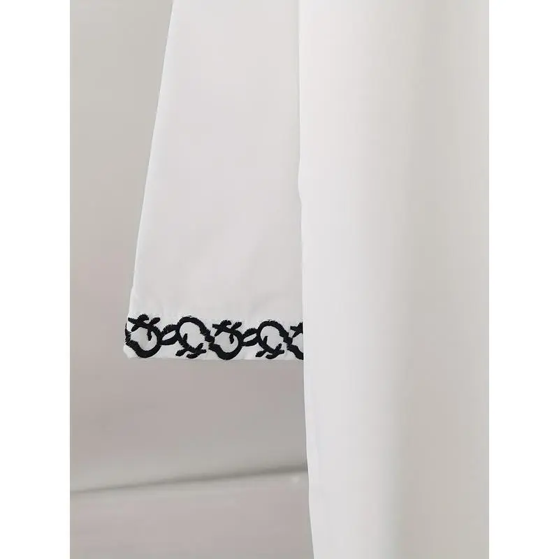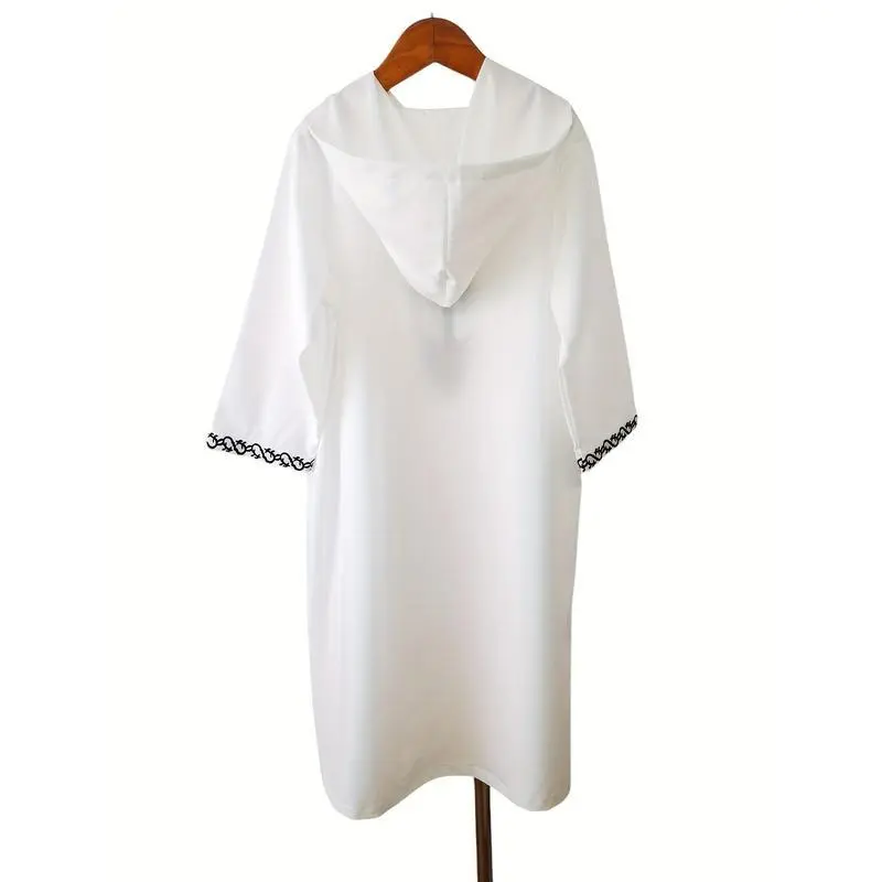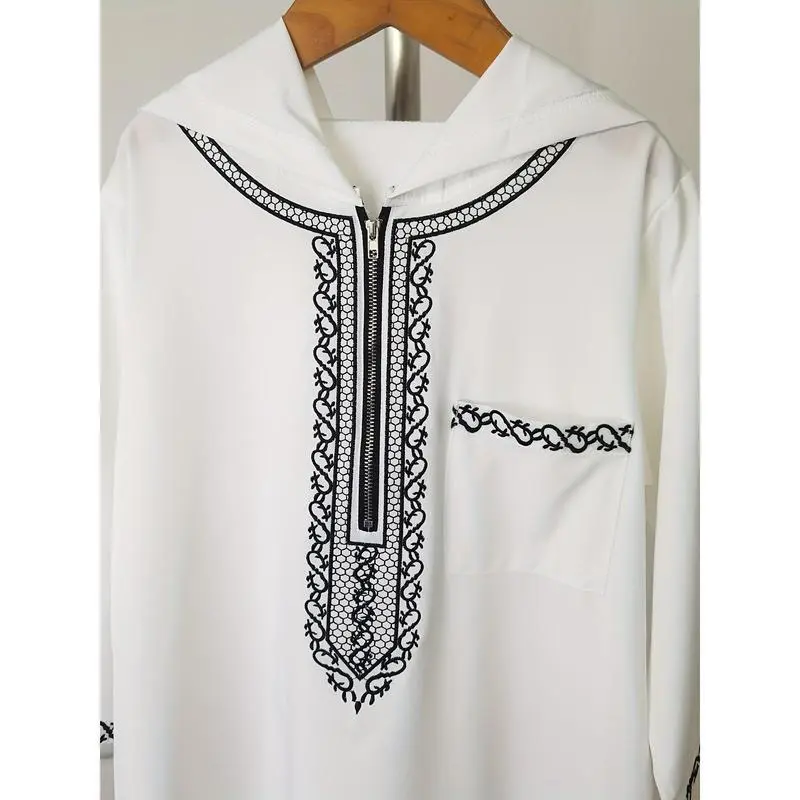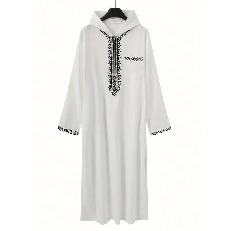 Adha Thobe - White Blend Traditional Arabic Cultural Robe with Black Embroidery, Round Neck, Hand Washable, All-Season Wear for Festive Occasions