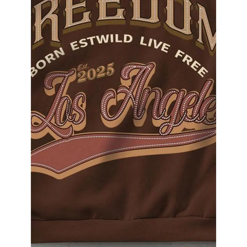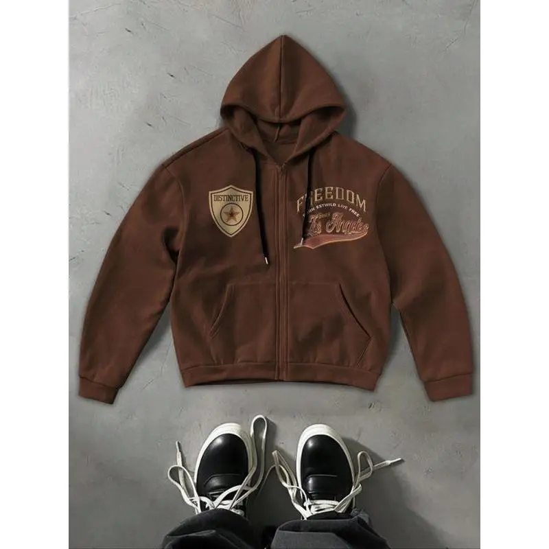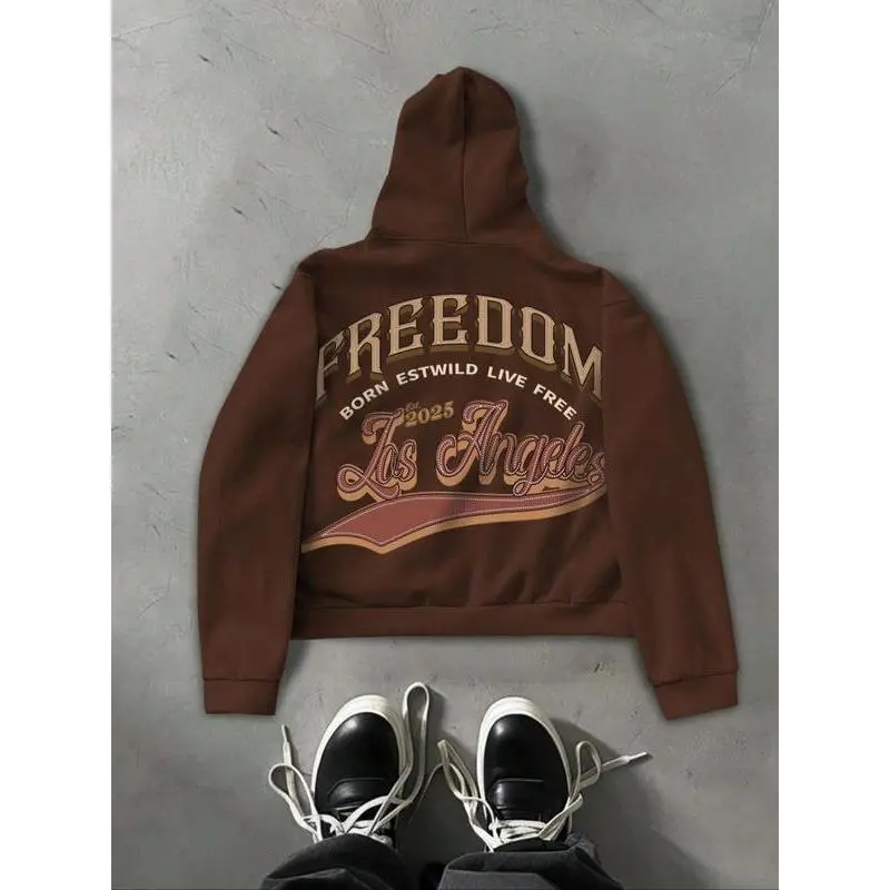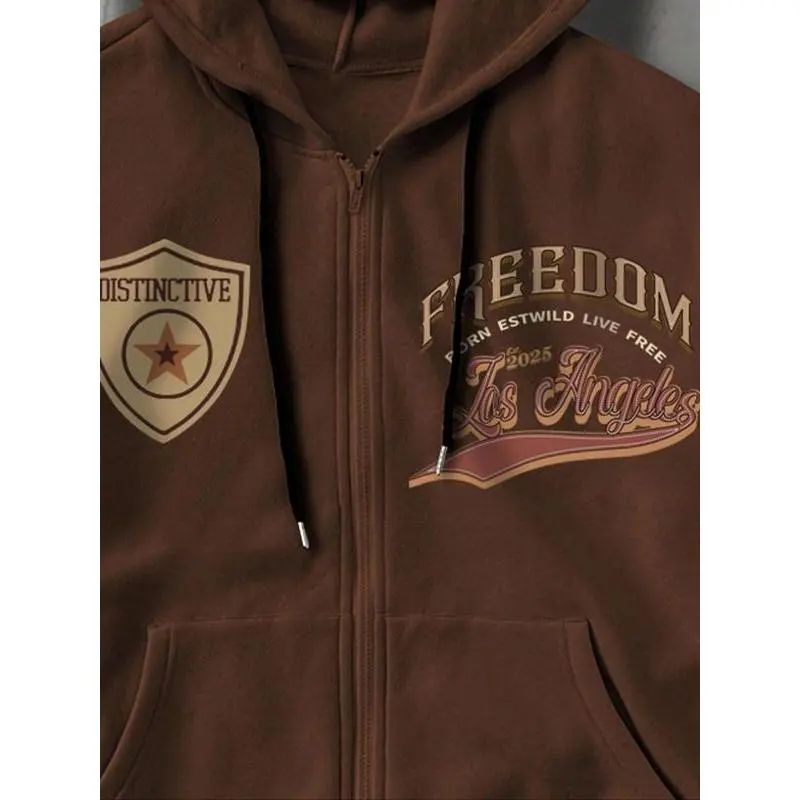 Brown zip up hoodie with "freedom", "Los Angeles", and "unique" prints, perfect for retro and urban styles