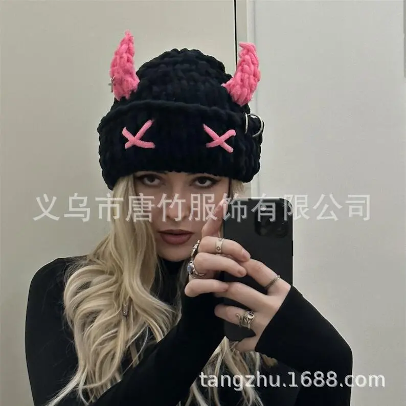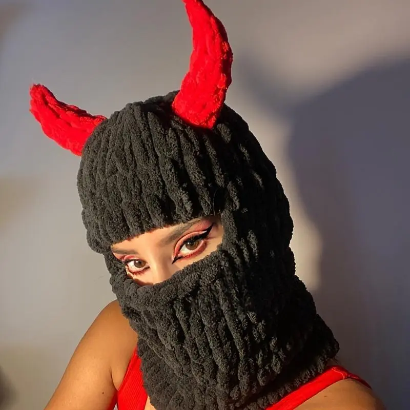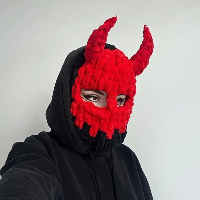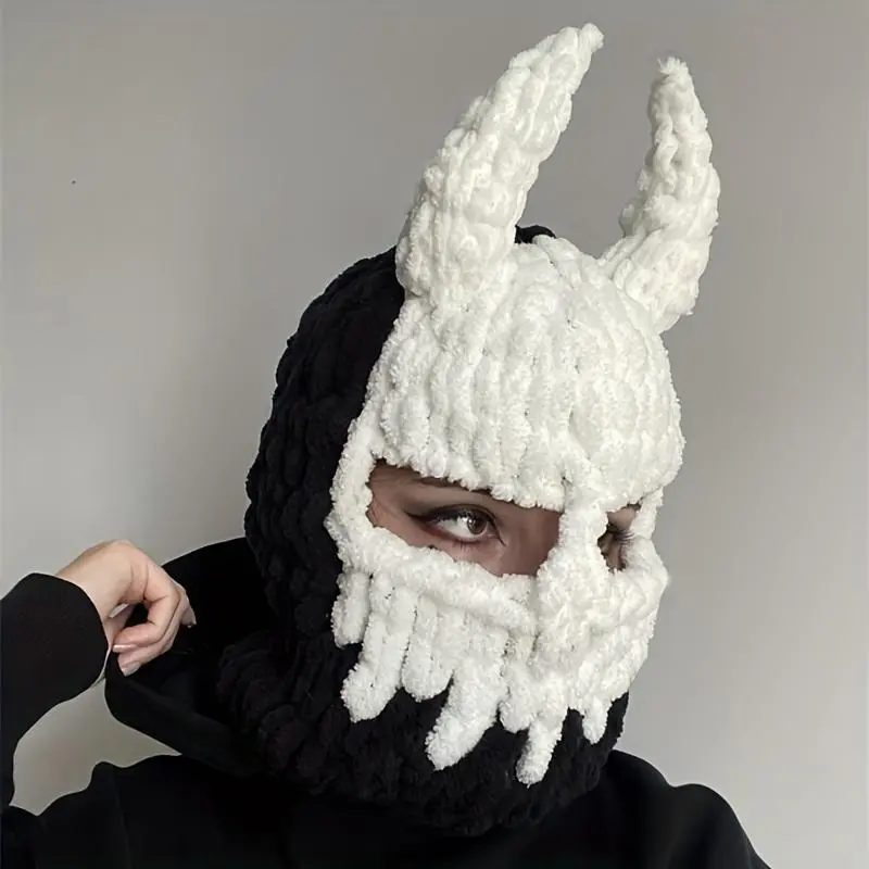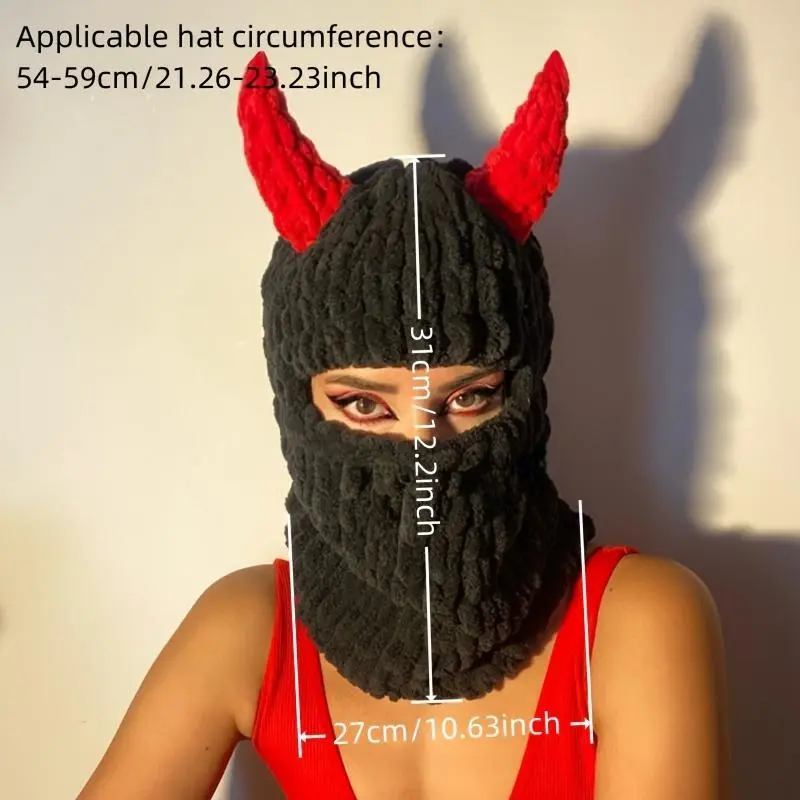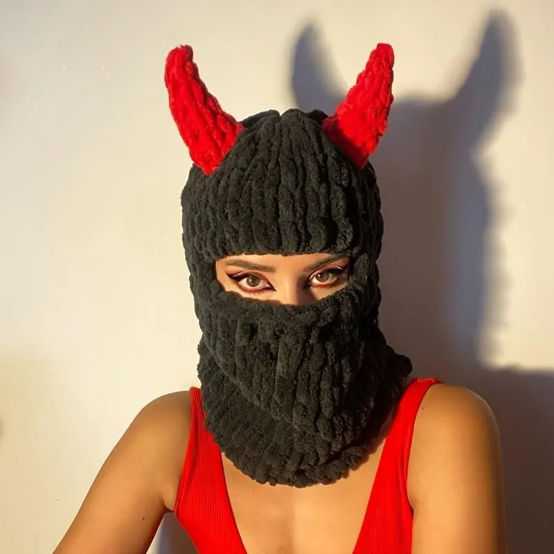HandsomeHornFashionCoolHeadgearHandmadeKnittedPlushHatAutumnWinterWarmPlusVelvetPartyHalloweenFunnyBlackSkeletonOutdoorBandanaMaskRealisticSunAdjustableLatexHorrorSnapback
