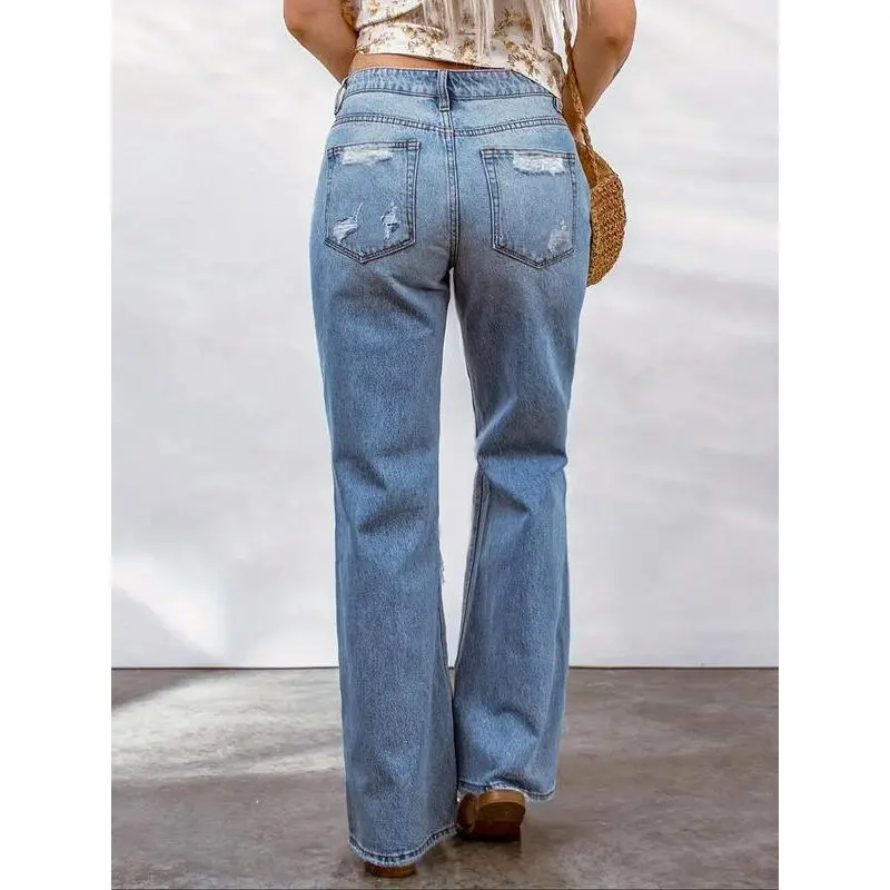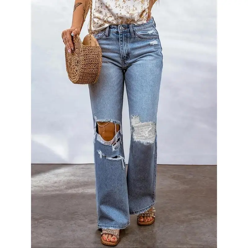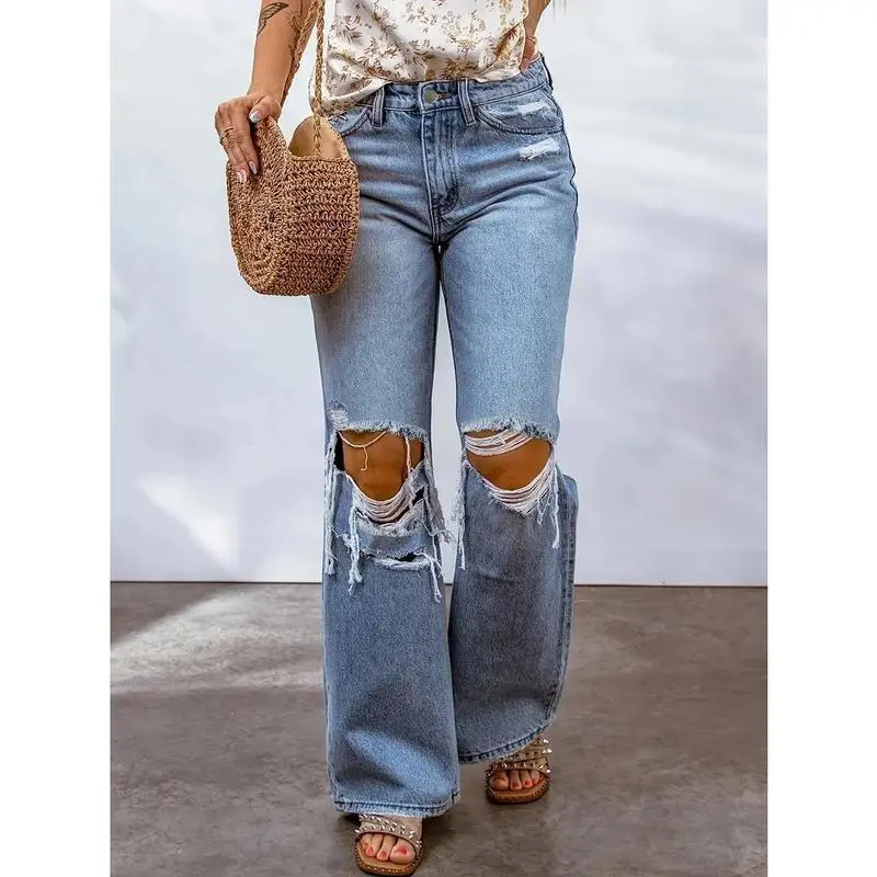��Retro Distressing��: Featuring stylish distressed detailing, these jeans elevate your outfit with a touch of vintage flair. ��Loosely Fitting��: The loose-fitting style offers a casual vibe while ensuring ease of movement and freedom in your daily activities. ��Mid-Waist Cut��: The mid-waist design provides a flattering silhouette, suitable for various body shapes and ensuring a secure fit. ��Durable Denim��: Crafted from moderate thickness denim, these pants promise long-lasting wear while maintaining their attractive look. ��Summer Ready��: Designed for summer wear, these wide-leg jeans promote breathability to keep you cool in warmer weather.