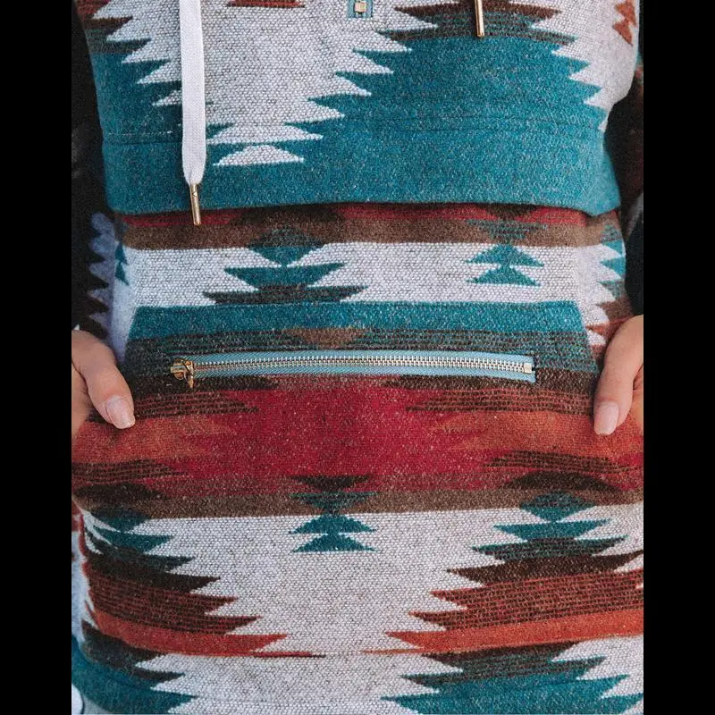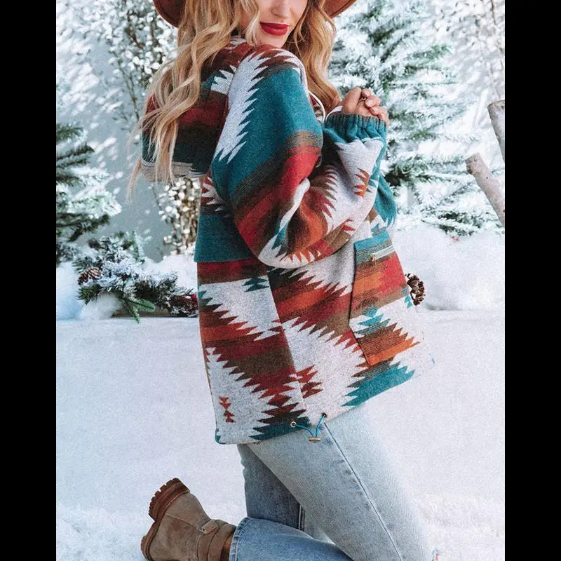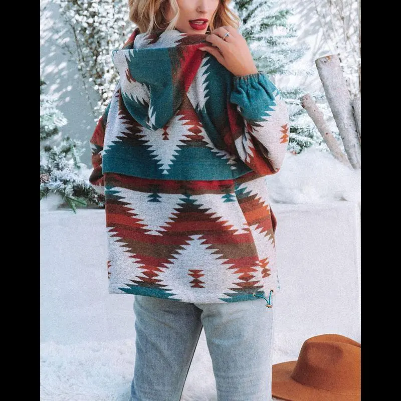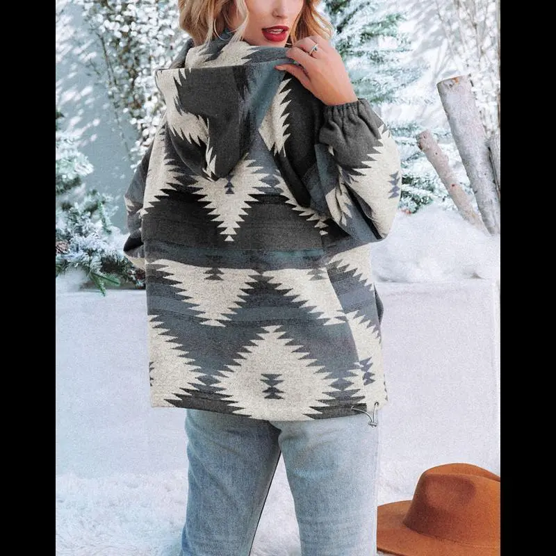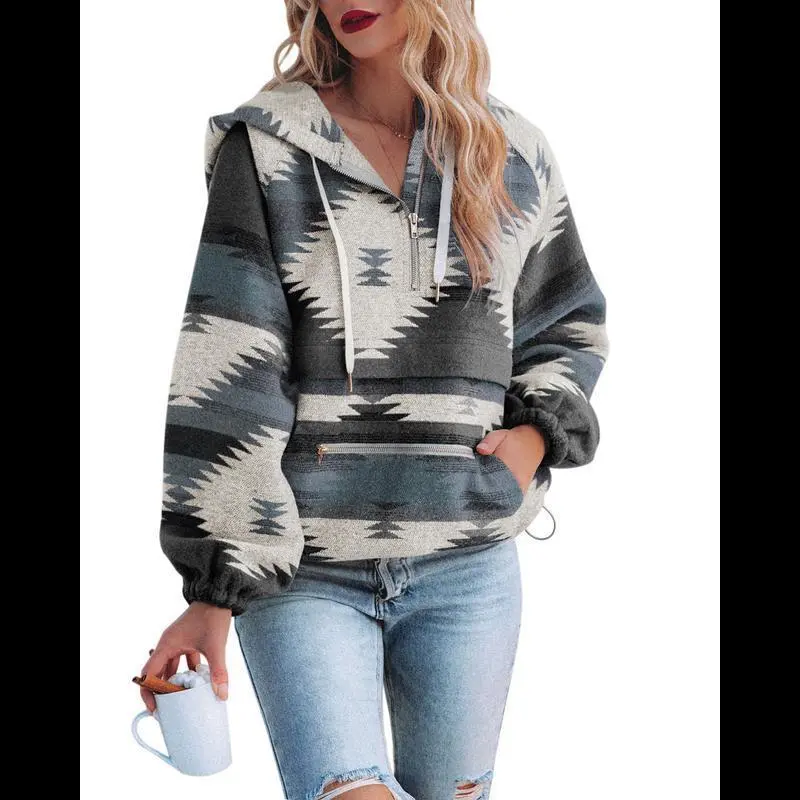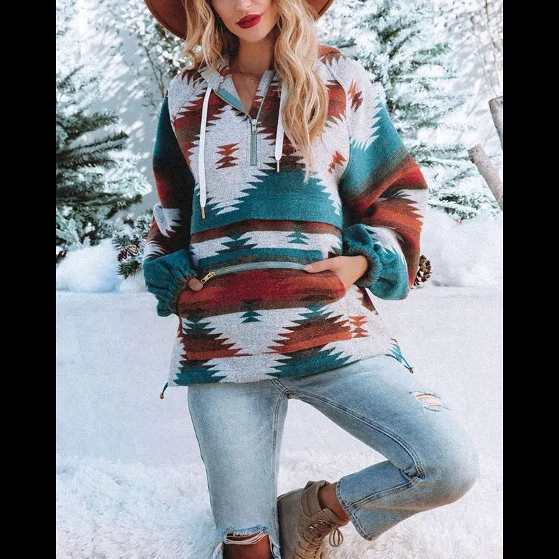 Womens Aztec Half Zip Up Hoodies Sweatshirt Casual Long Sleeve Oversized Ethnic Tribal Hooded Pullover Shirt Top Winter Womenswear
