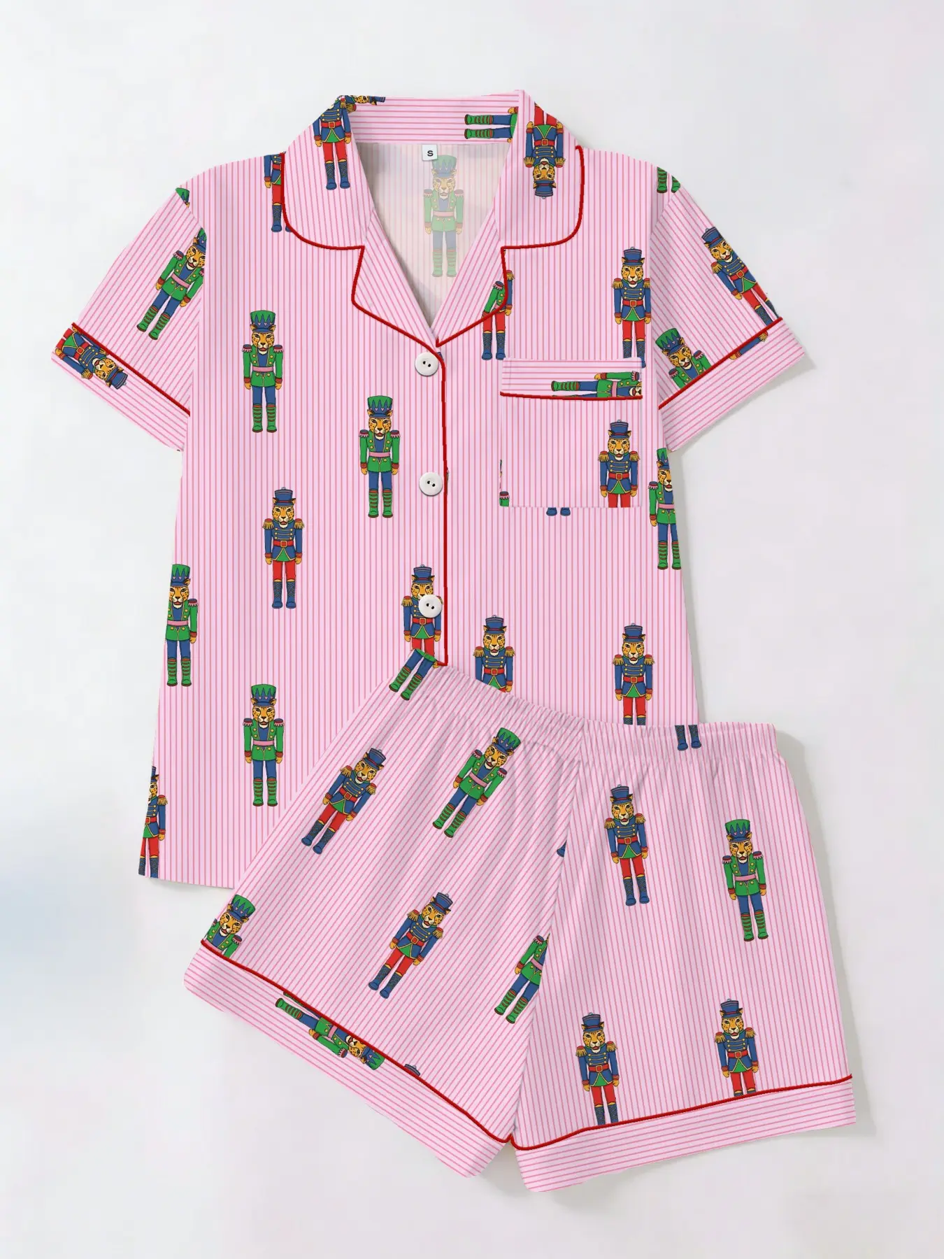 Women's Short Sleeve Button Down Top and Shorts Pajama Set, Spring Summer Wear, For Nutcracker Fairy Tale Lovers, Pink Stripe Colorful Nutcracker Soldier Print, Classic Lapel Collar, Loose Fit, Comfortable For Home & Holiday Gatherings