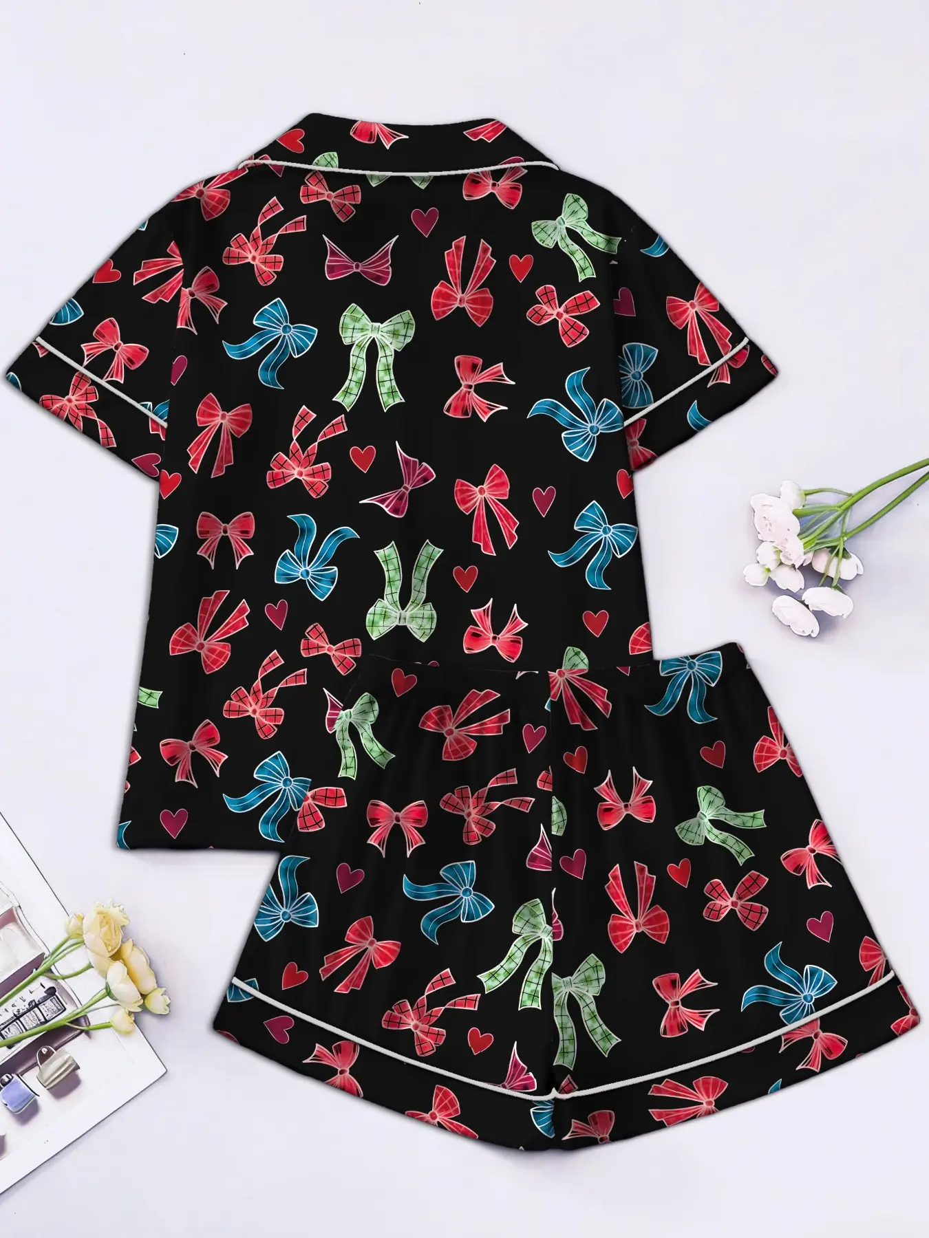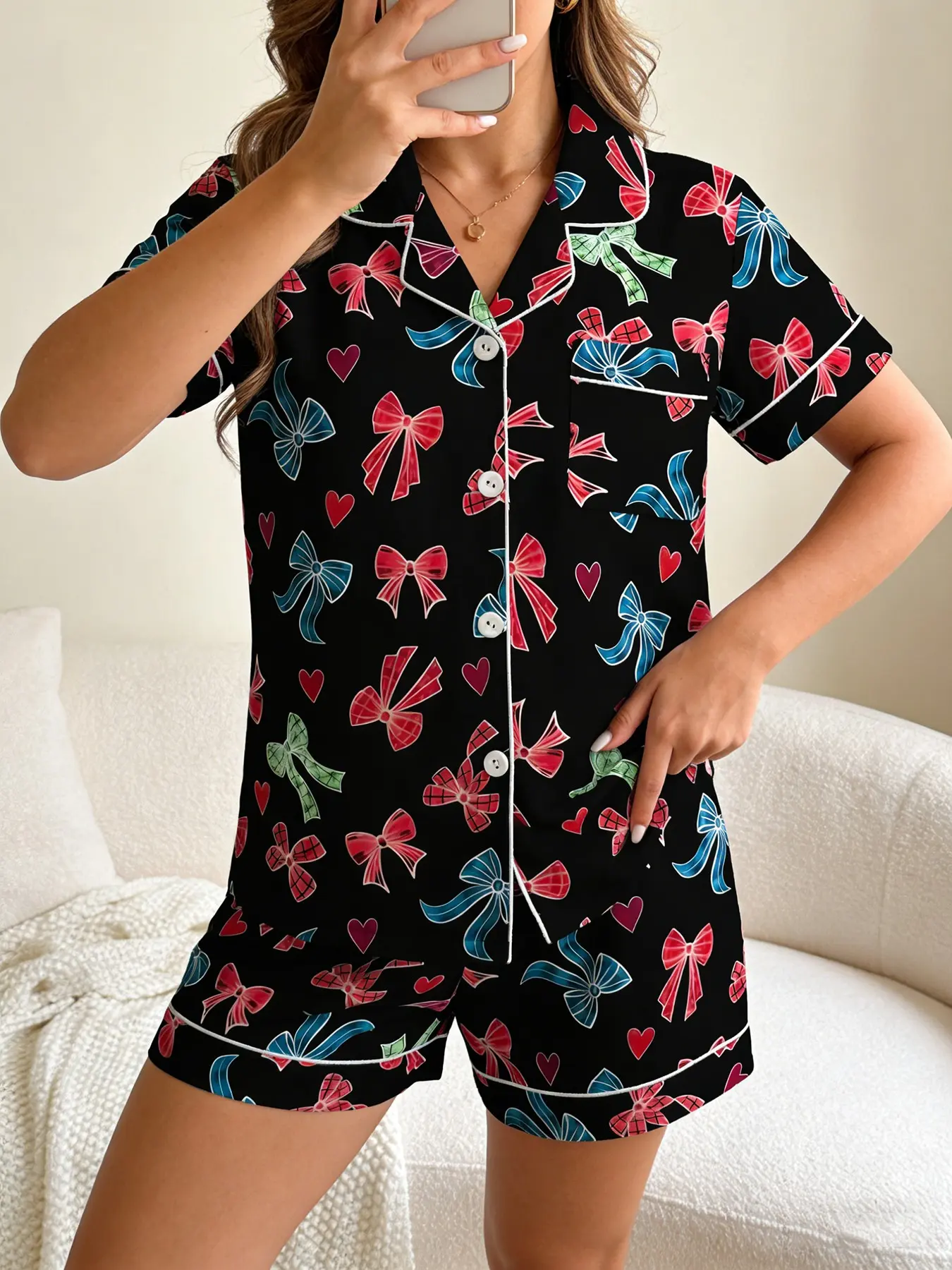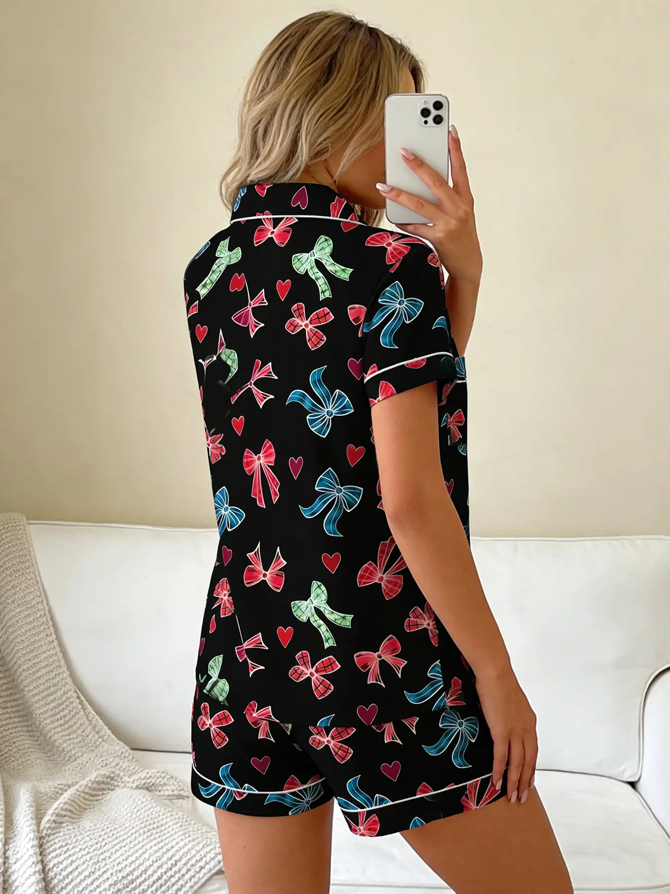 Women's Short Sleeve Button Down Top and Shorts Pajama Set, Spring Summer Wear, For American Retro Sweet Cool Girls, Black Base Vintage Bow Heart Print, Classic Lapel Collar, Loose Straight Fit, Comfortable For Home & Outings