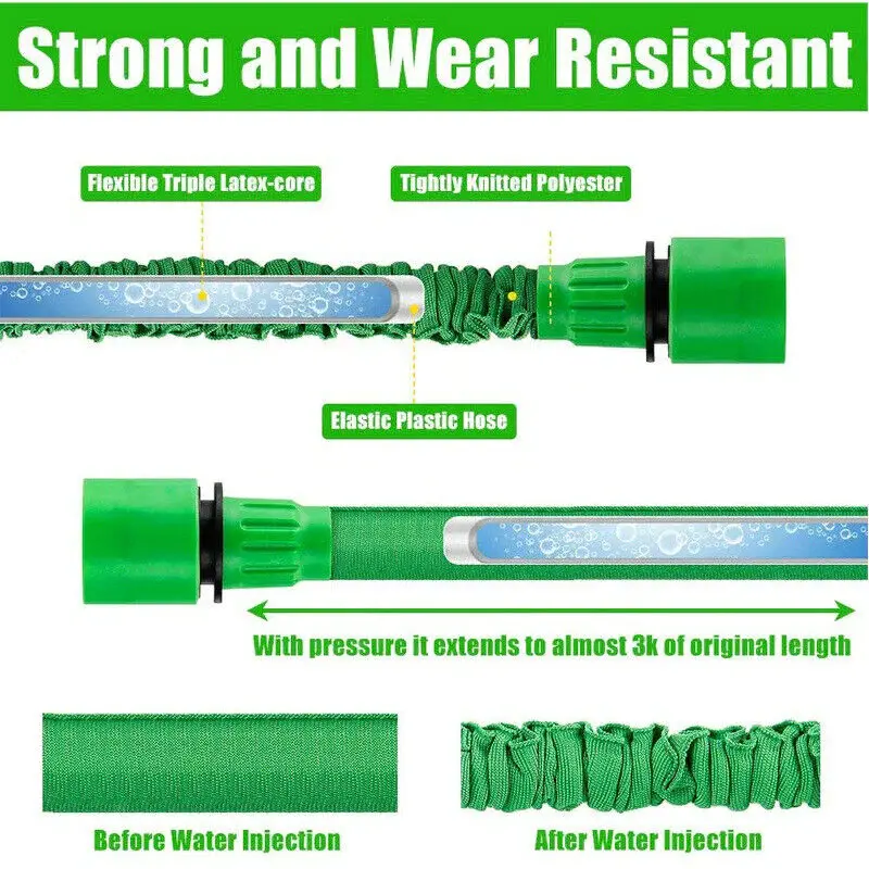 ·【Expandable Hose】: The hose can expand up to 3 times its original length. When the water is released it contracts to its original size. Retractable, lightweight, flexible garden water hose for easy storage.