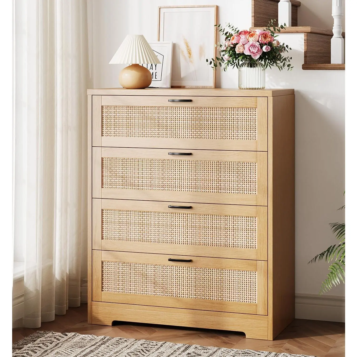 Offering ample storage space this tall rattan wooden dresser features four large drawers perfect for organizing clothes accessories and everyday essentials while maintaining a compact footprint ideal for any room in your home