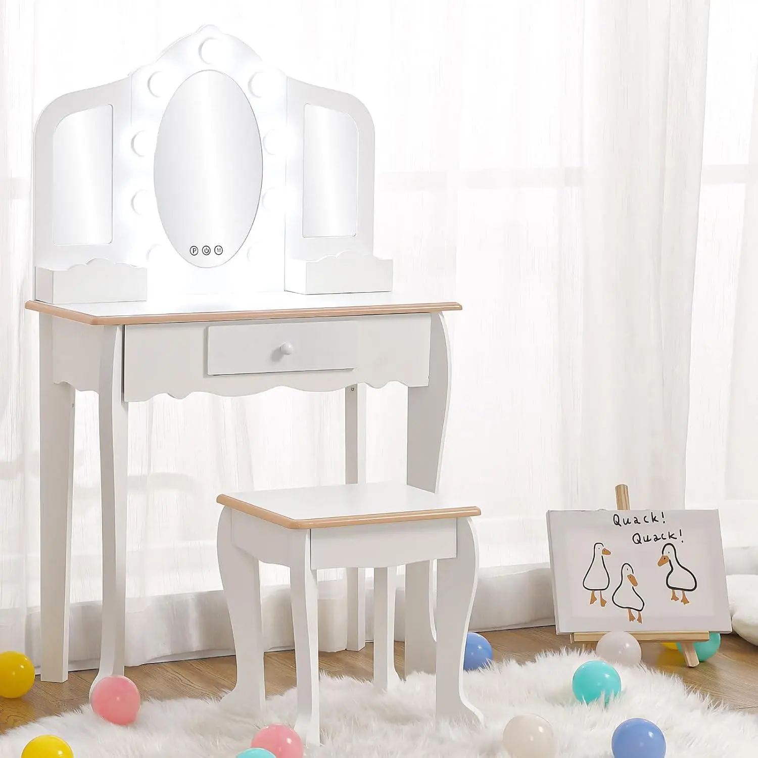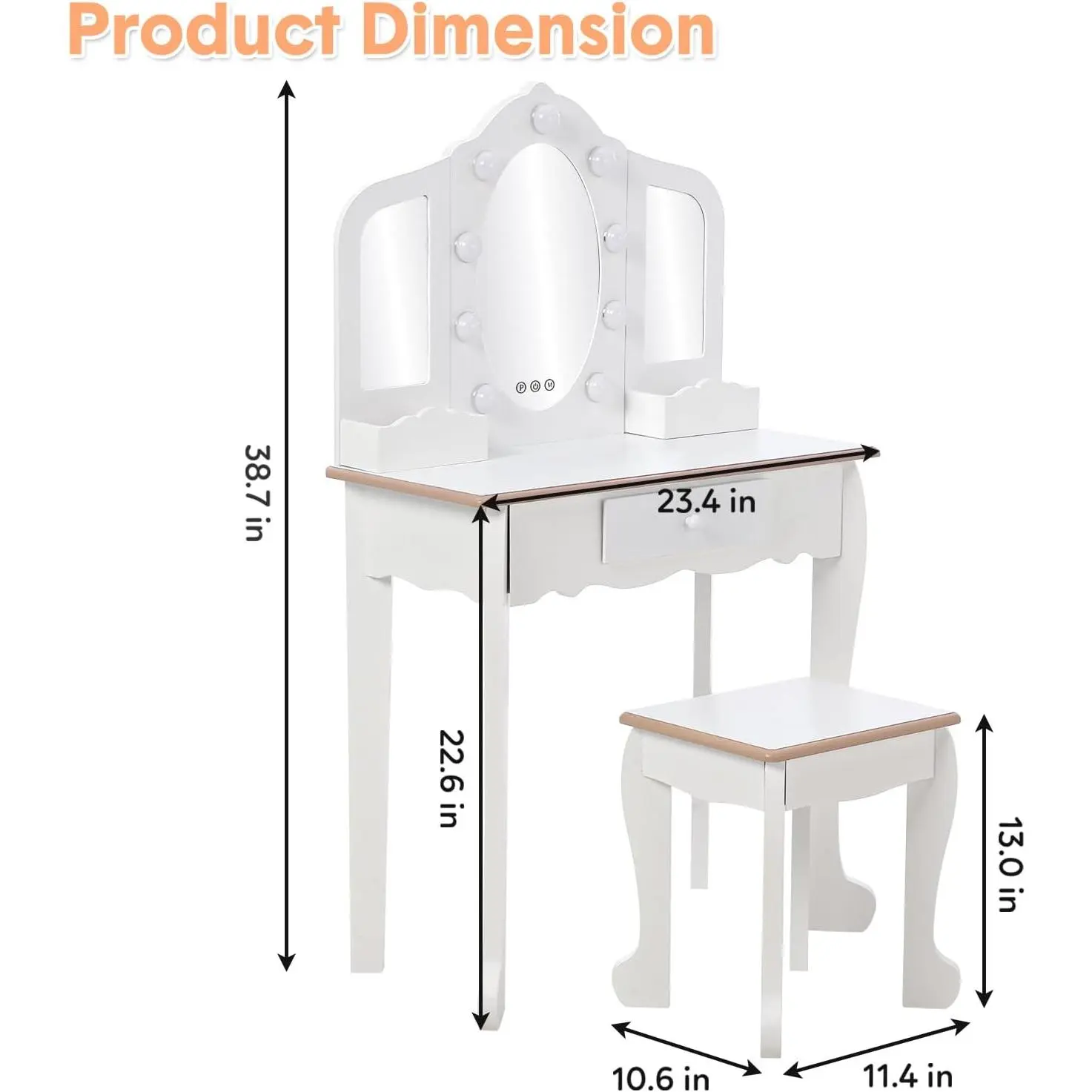 ·Tri-Fold Mirror with LED Modes: This vanity features a lighted tri-fold mirror with 3 LED modes. The touch switch toggles between daylight, warm, and cool light. Perfect for creating the right ambiance for makeup and play.