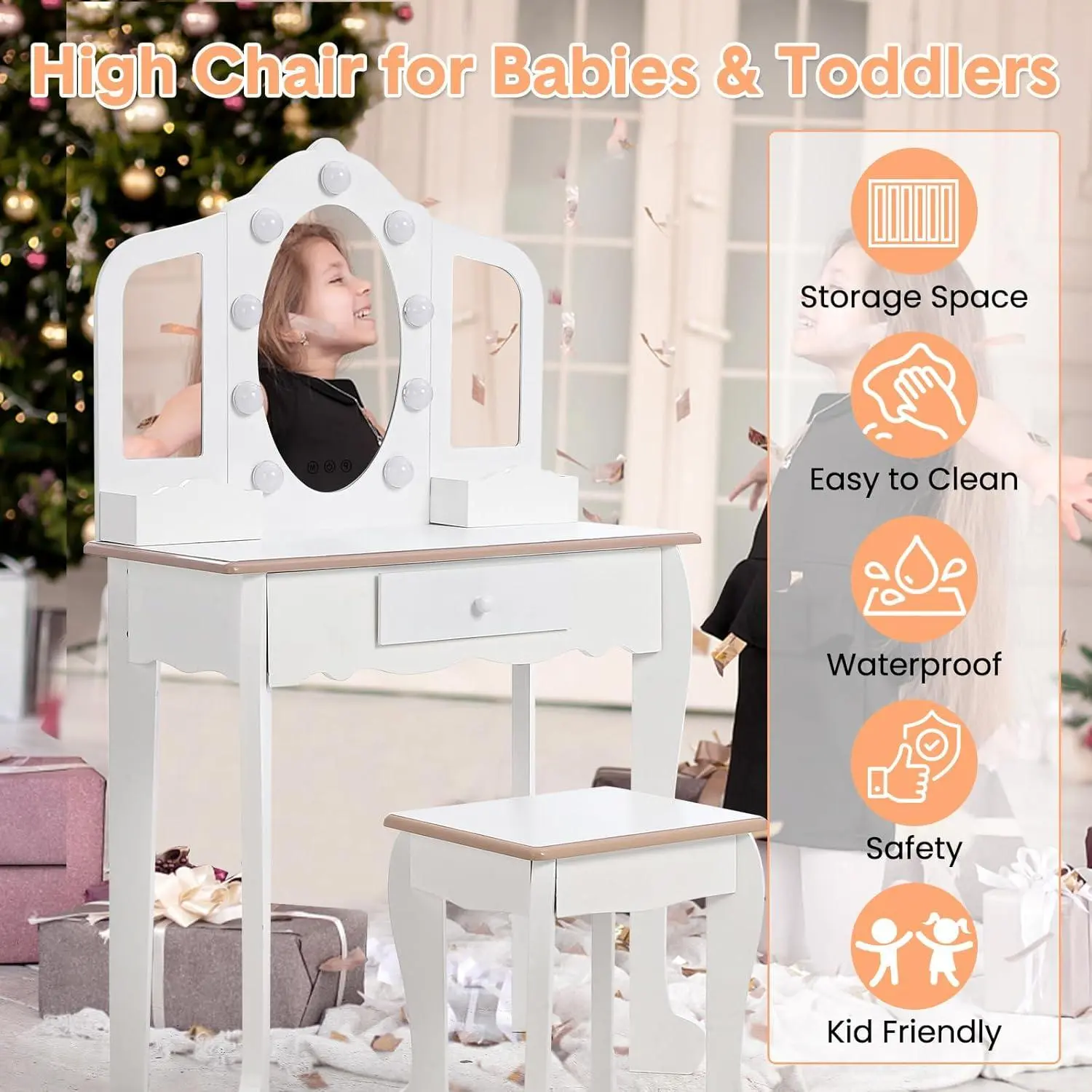·Storage Drawer & Grids: The vanity includes a storage drawer and grids, holding makeup, toys, and books. It keeps the tabletop neat and organized. The MDF is safe and durable with round edges, ASTM & CPSIA certified for child safety.