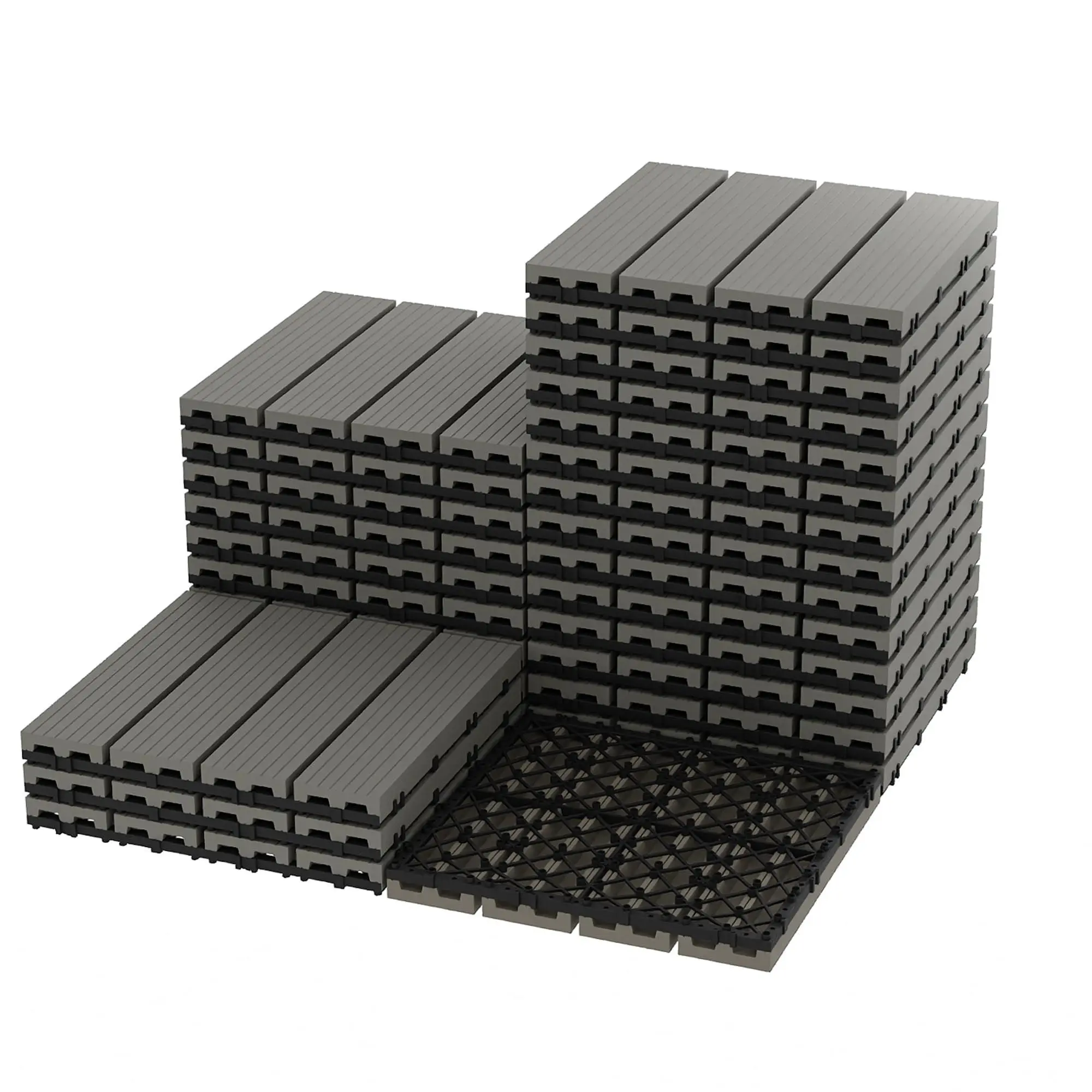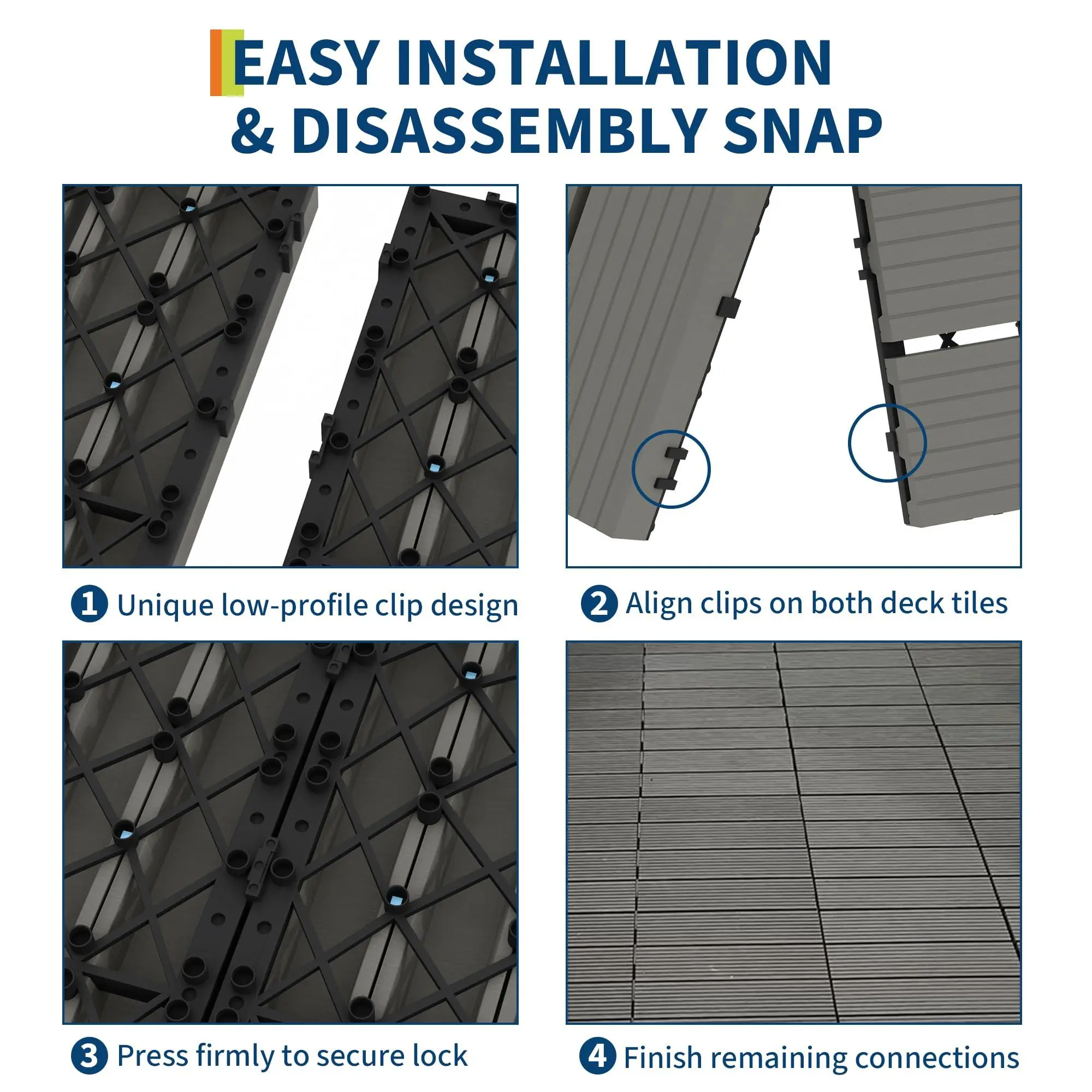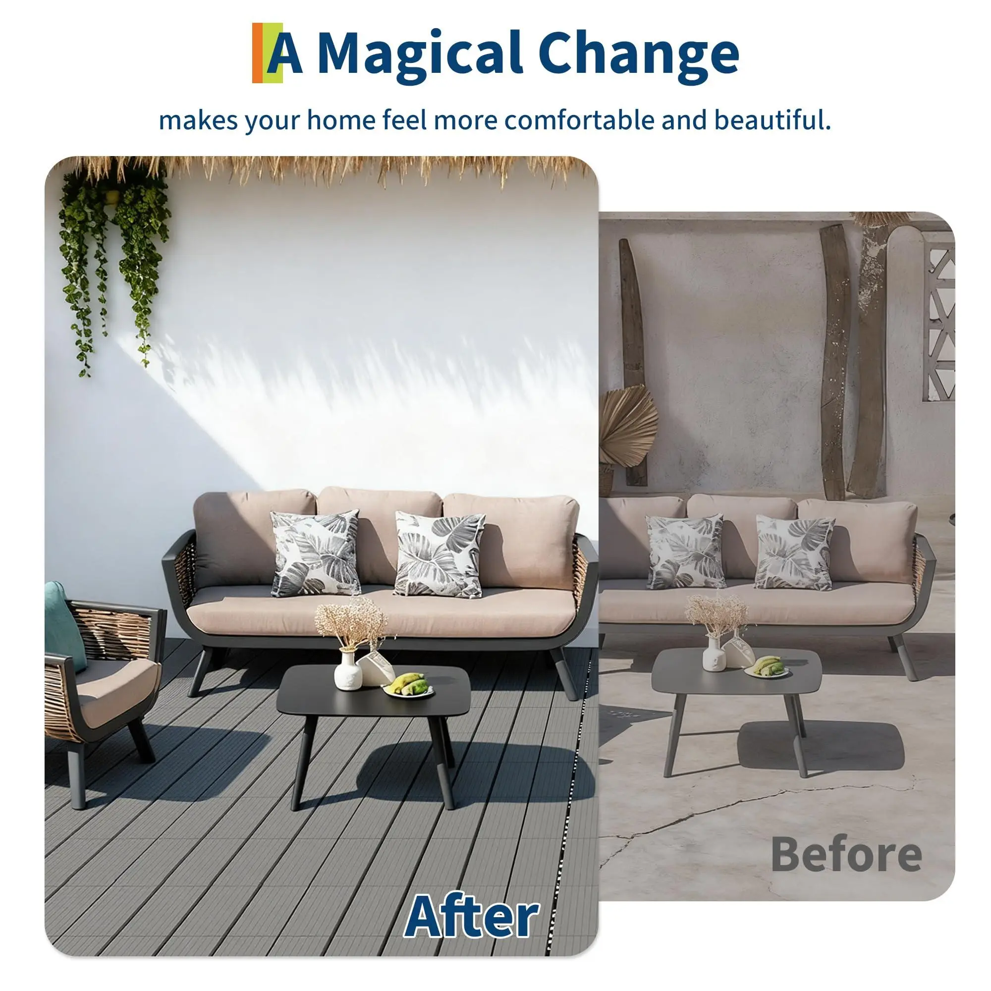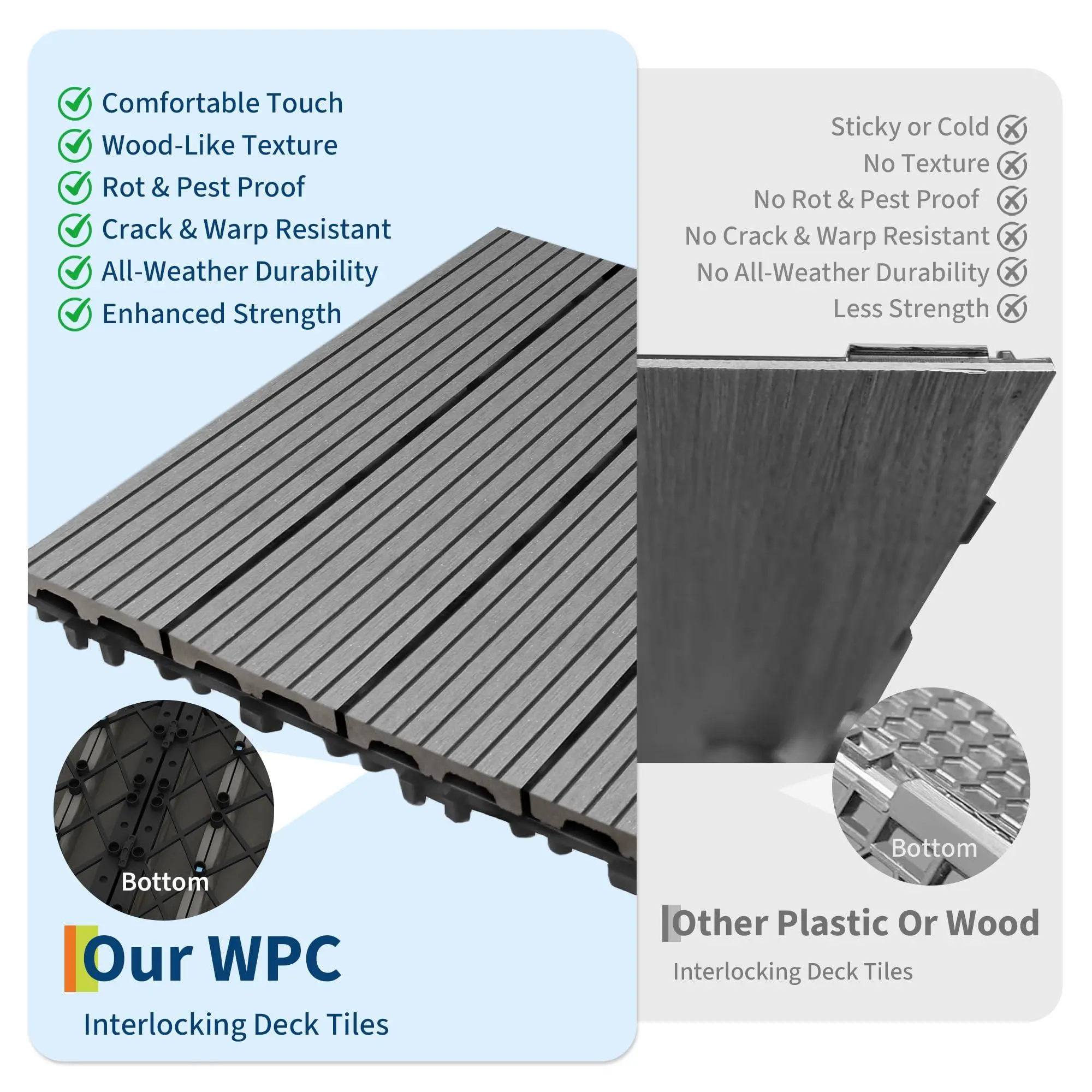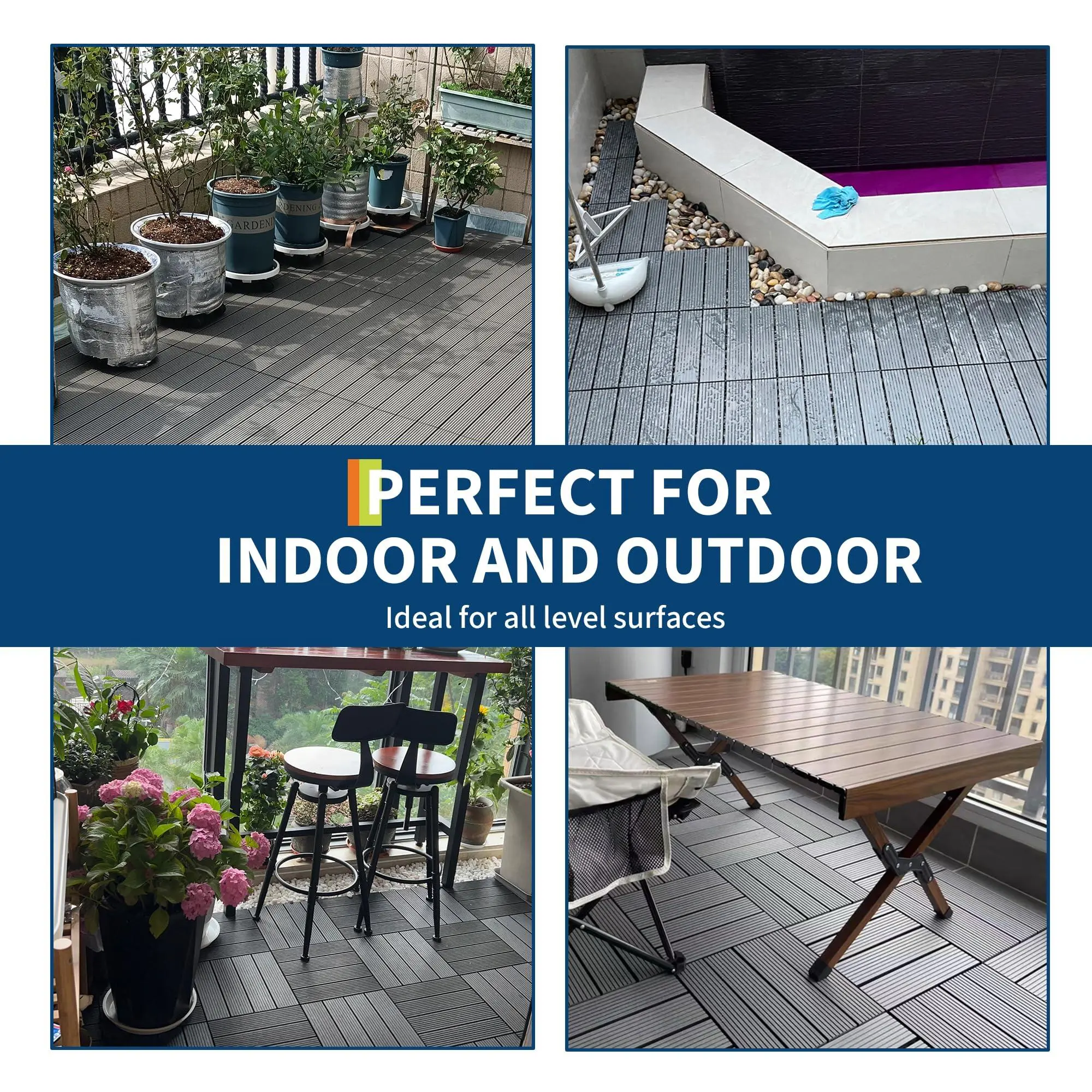5. 27-Pack 12"X12" Composite Deck Tiles – Waterproof Interlocking Patio Flooring for Indoor & Outdoor Use, All-Weather Plastic Wood-Grain Tiles for Patio, Balcony, Porch, Poolside (Grey, 27 Sq ft)
