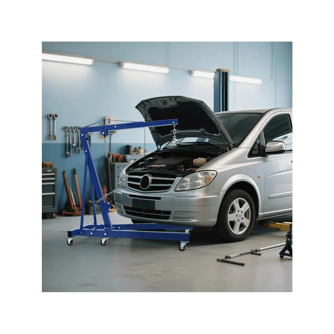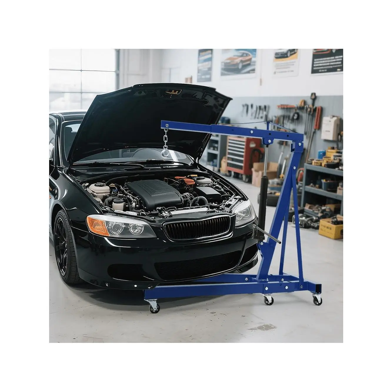 Heavy-Duty 2 Ton Engine Hoist: This folding 2 ton engine hoist features a powerful 8-ton hydraulic pump and four adjustable load arms (0.5T, 1T, 1.5T, 2T) designed for lifting engines, transmissions, and heavy parts with ease and precision in any workshop or garage