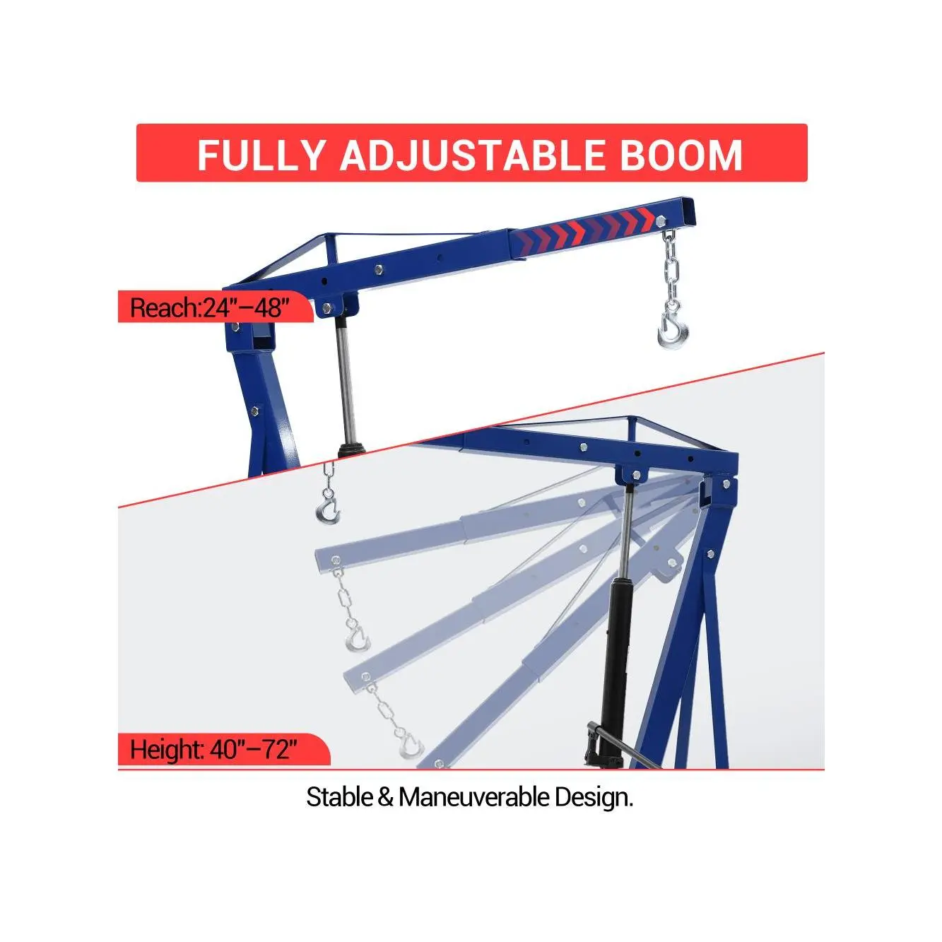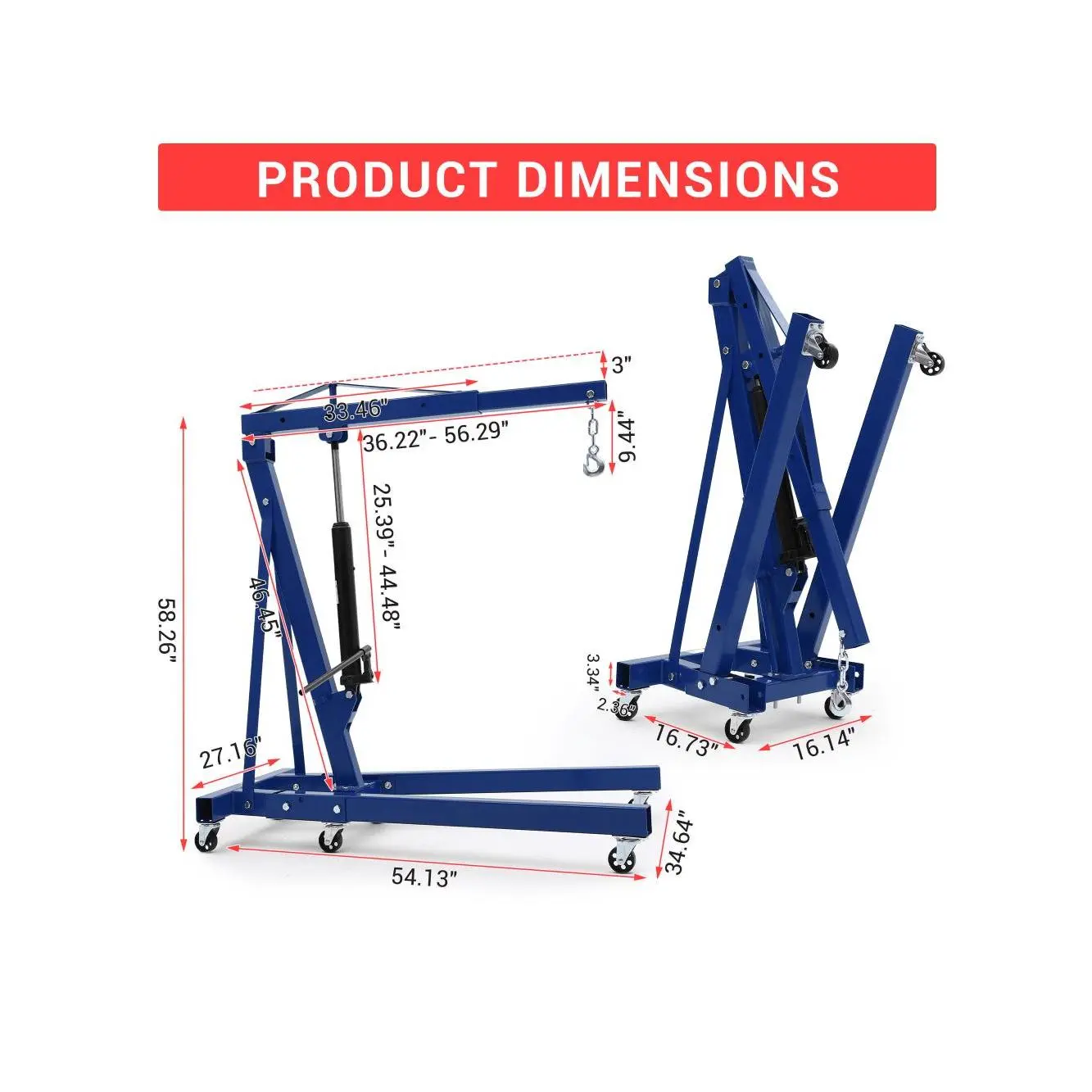 Durable & Rust-Resistant Build: Crafted from high-strength carbon steel with an anti-rust coating, this hydraulic engine crane offers exceptional durability and corrosion resistance, ensuring your heavy-duty hydraulic shop crane performs reliably indoors or outdoors for years