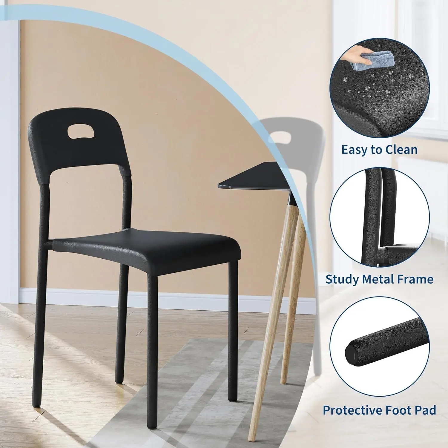 Modern Versatile Dining Chairs Elevate your space with these sleek stackable dining chairs featuring matte-textured plastic seats and minimalist metal legs Their neutral black finish blends effortlessly with modern farmhouse or contemporary décor making them ideal for kitchens dining rooms offices living rooms or even outdoor patios These chairs are a perfect choice to add timeless elegance while complementing any setting