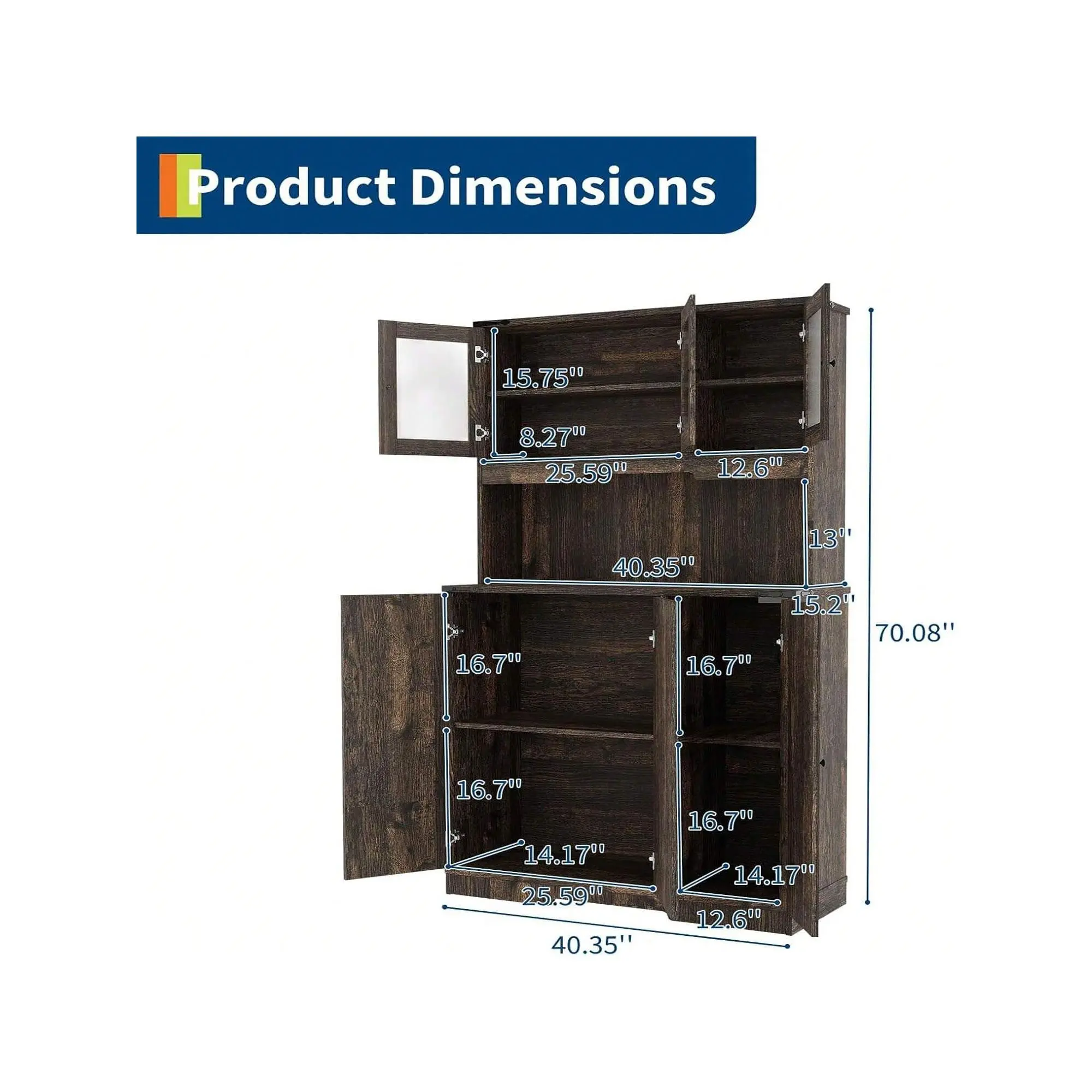 [ Large Storage Space & Countertop ] 70-inch Pantry cabinet - Vertical structure (40.35" wide *15.2" deep) offers a vertical storage solution. The spacious middle countertop can accommodate small appliances such as coffee machines and bread machines. Top and bottom multi-layered compartments, suitable for items of different sizes, make it more efficient to take ingredients while preparing meals