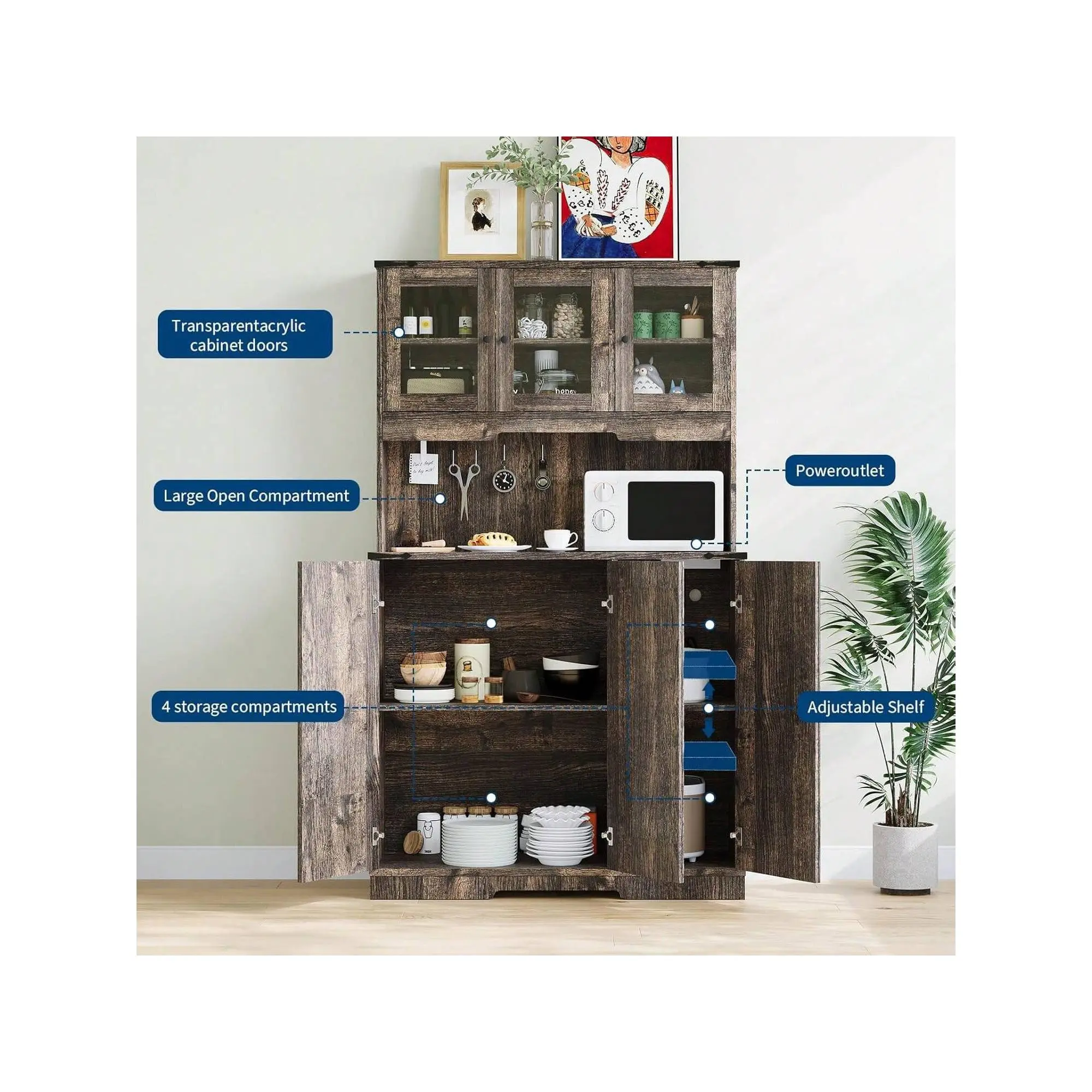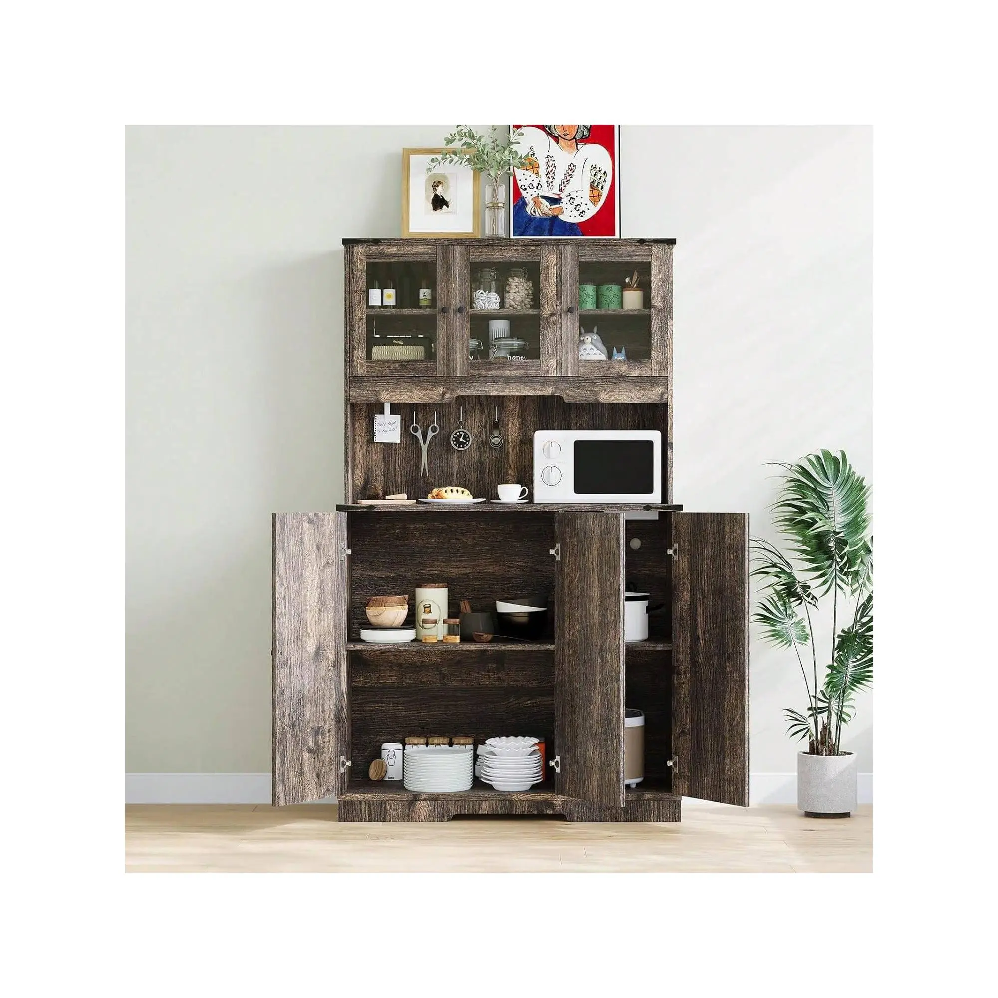 [ Thickened and stable structure, Load-bearing and pressure-resistant ] This Kitchen Hutch is made of high-density -friendly boards and thickened bases. Through mechanical structure, the supporting force is strengthened, and the load-bearing capacity of the cabinet body is increased by 30%. The 70-inch height design ensures stability and no shaking, providing greater peace of mind when storing heavy household appliances