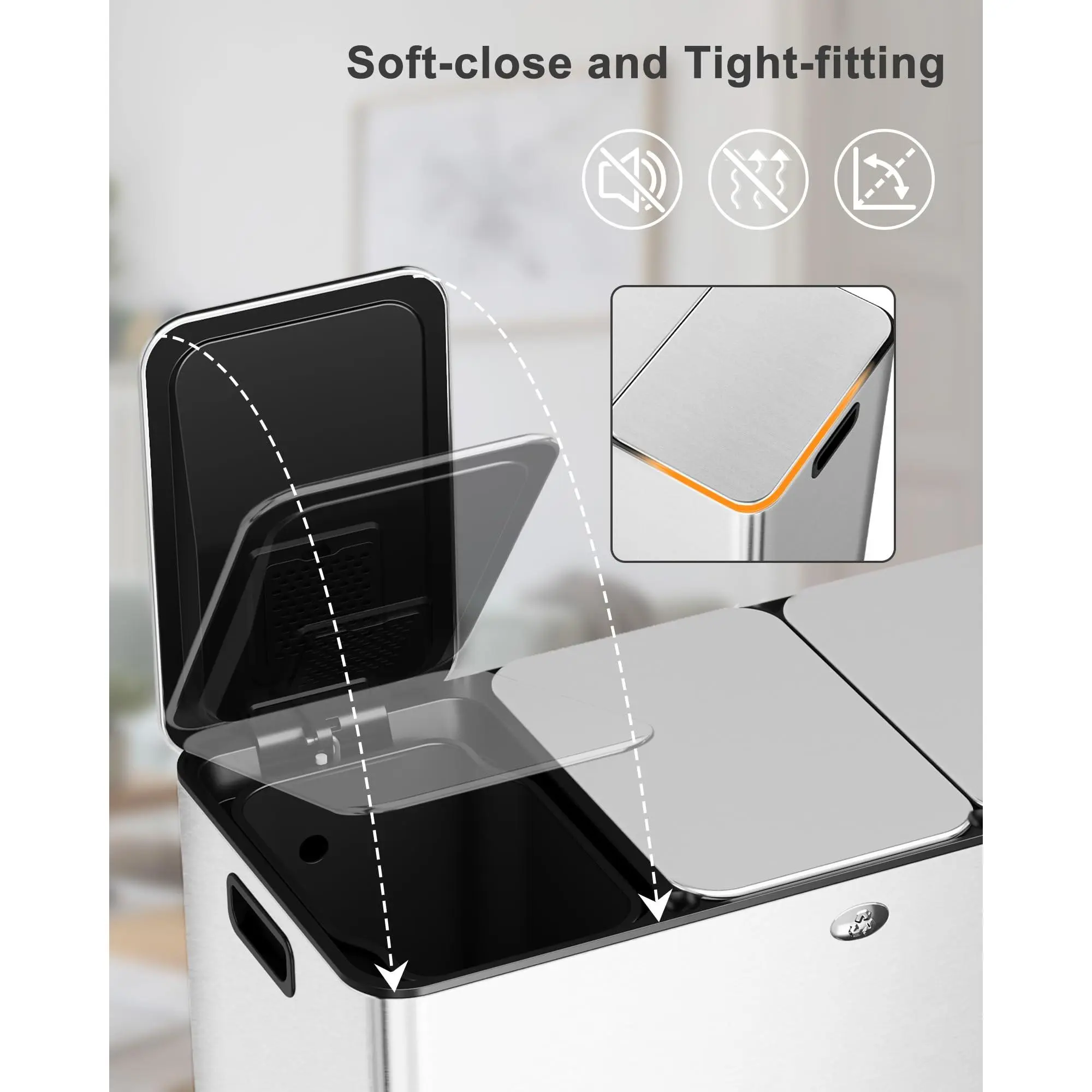 Dual Compartments: This trash can features a double inner barrel design that allows for effective separation of dry and wet waste, as well as recyclable and non-recyclable items. Each barrel has a capacity of 24 gallons (90 liters), making it easy to accommodate kitchen waste efficiently.