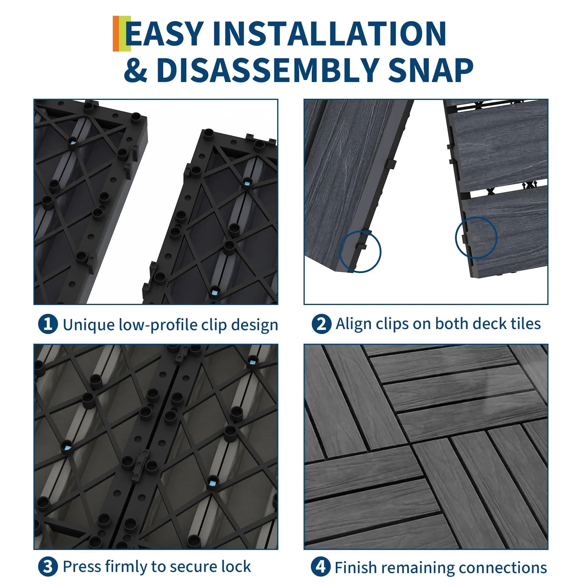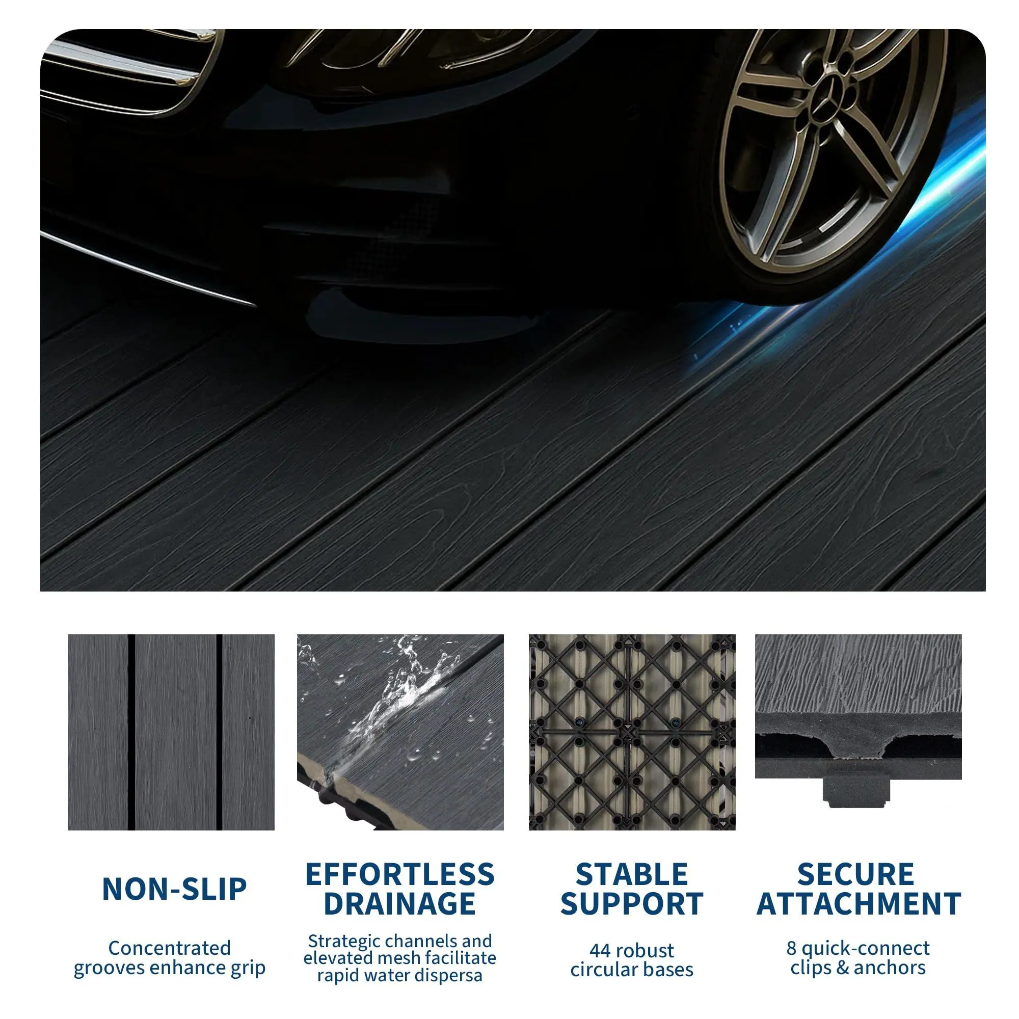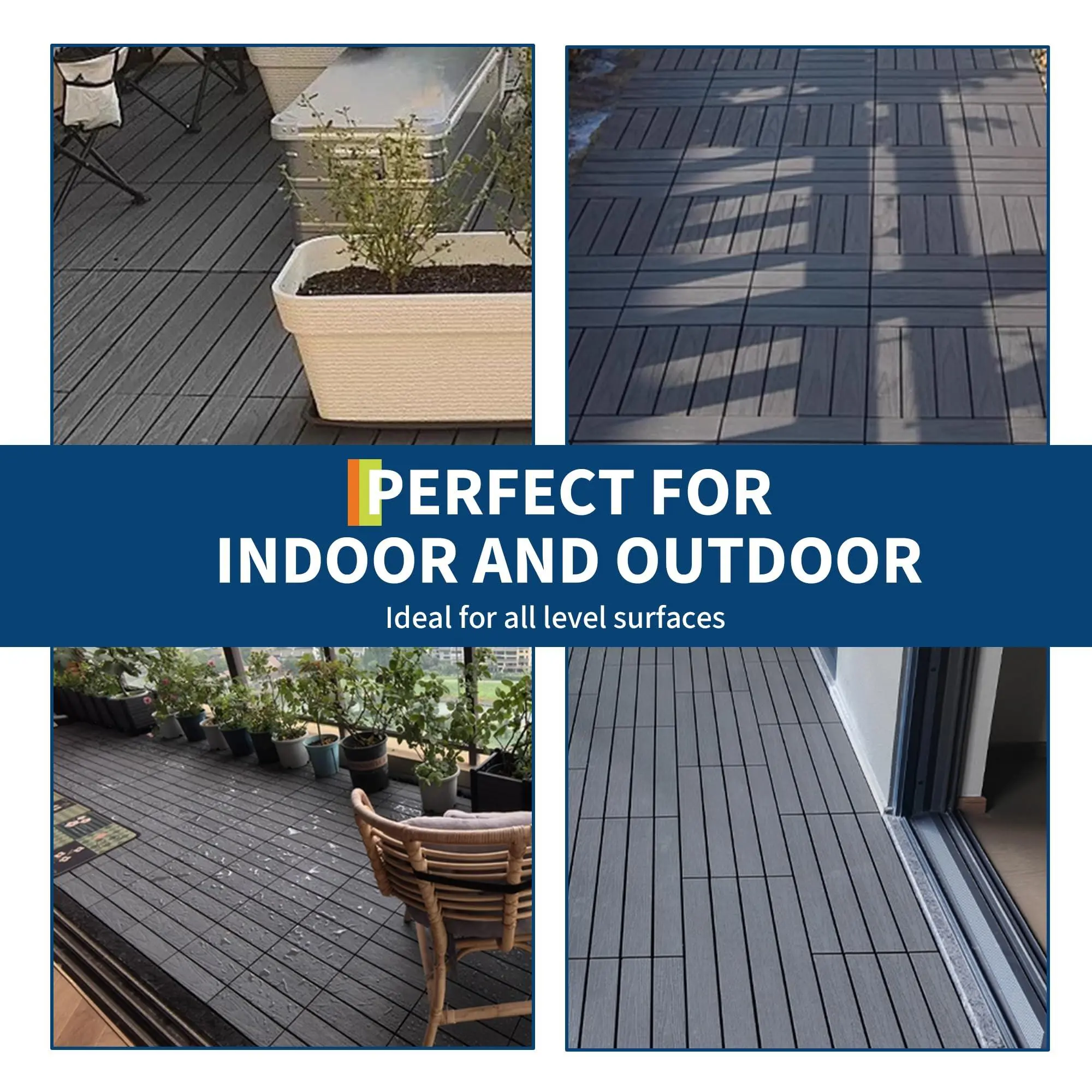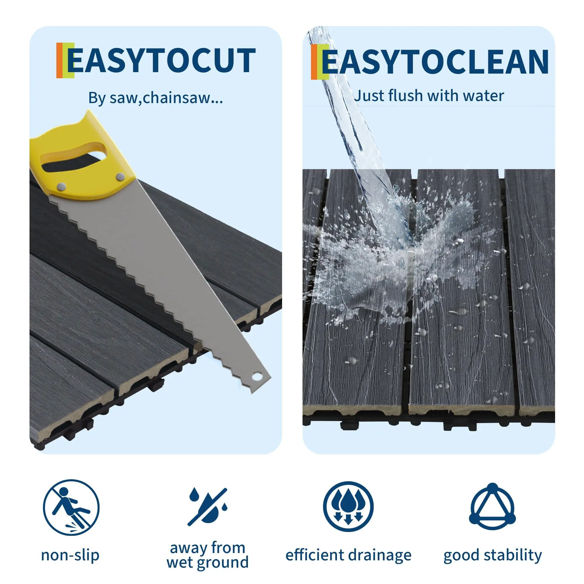 4. SAFE, SLIP-RESISTANT & DURABLE BASE:The wood-textured finish provides superior traction, significantly reducing slip hazards for children, seniors, and pets, making it ideal for high-traffic areas and outdoor gatherings. The crack-resistant plastic interlocking base not only ensures structural integrity but also promotes excellent water drainage and airflow, keeping the surface dry and safe while preventing moisture damage and maintaining stability.