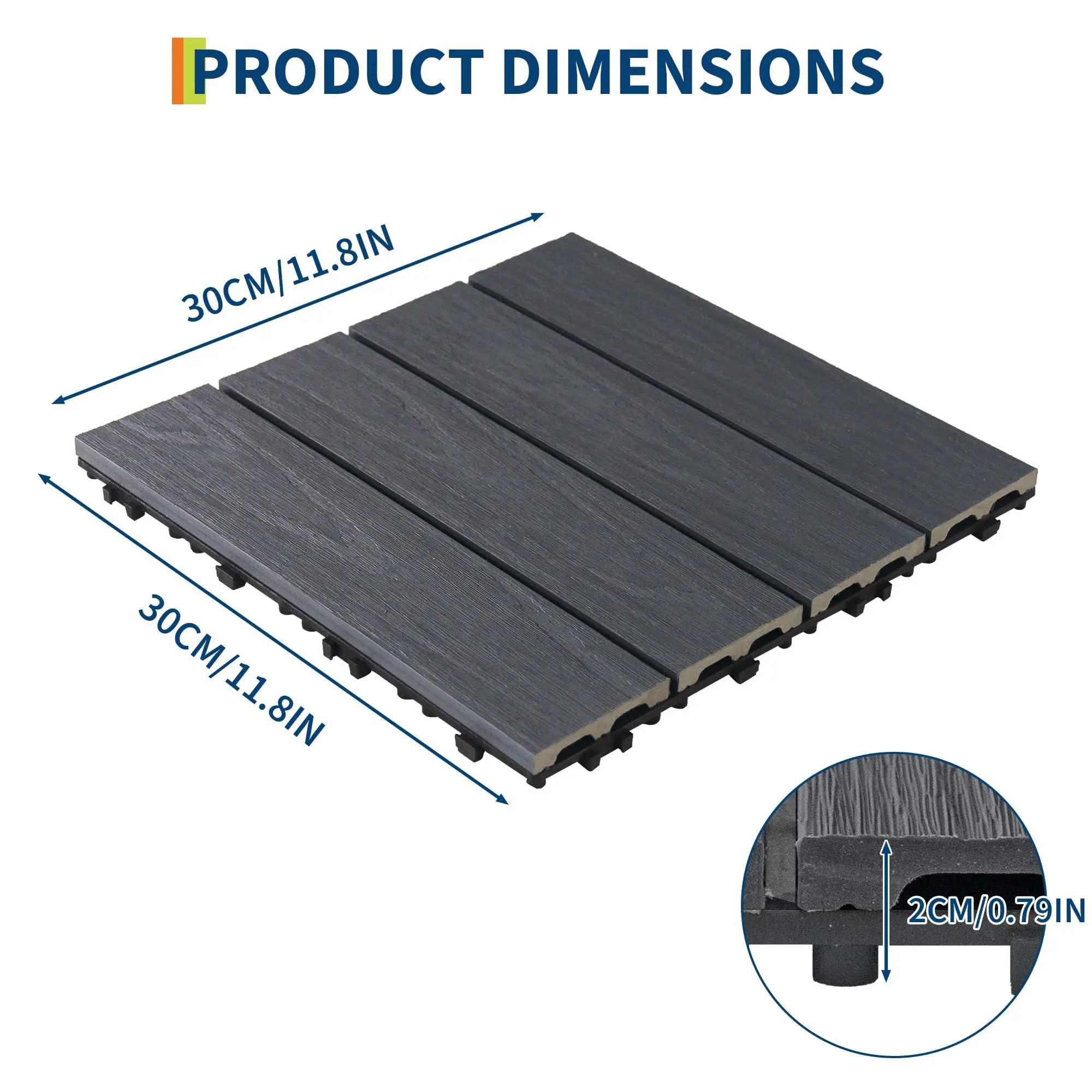 1. PREMIUM COMPOSITE WOOD CONSTRUCTION:Crafted from durable, sustainable composite wood that replicates the beautiful appearance and grain of real wood while being lighter in weight. Reinforced with a high-quality plastic base, these interlocking deck tiles are built to withstand harsh outdoor elements including heavy rain, intense sun, strong wind, and frequent use without cracking, warping, or deforming, ensuring long-lasting performance.