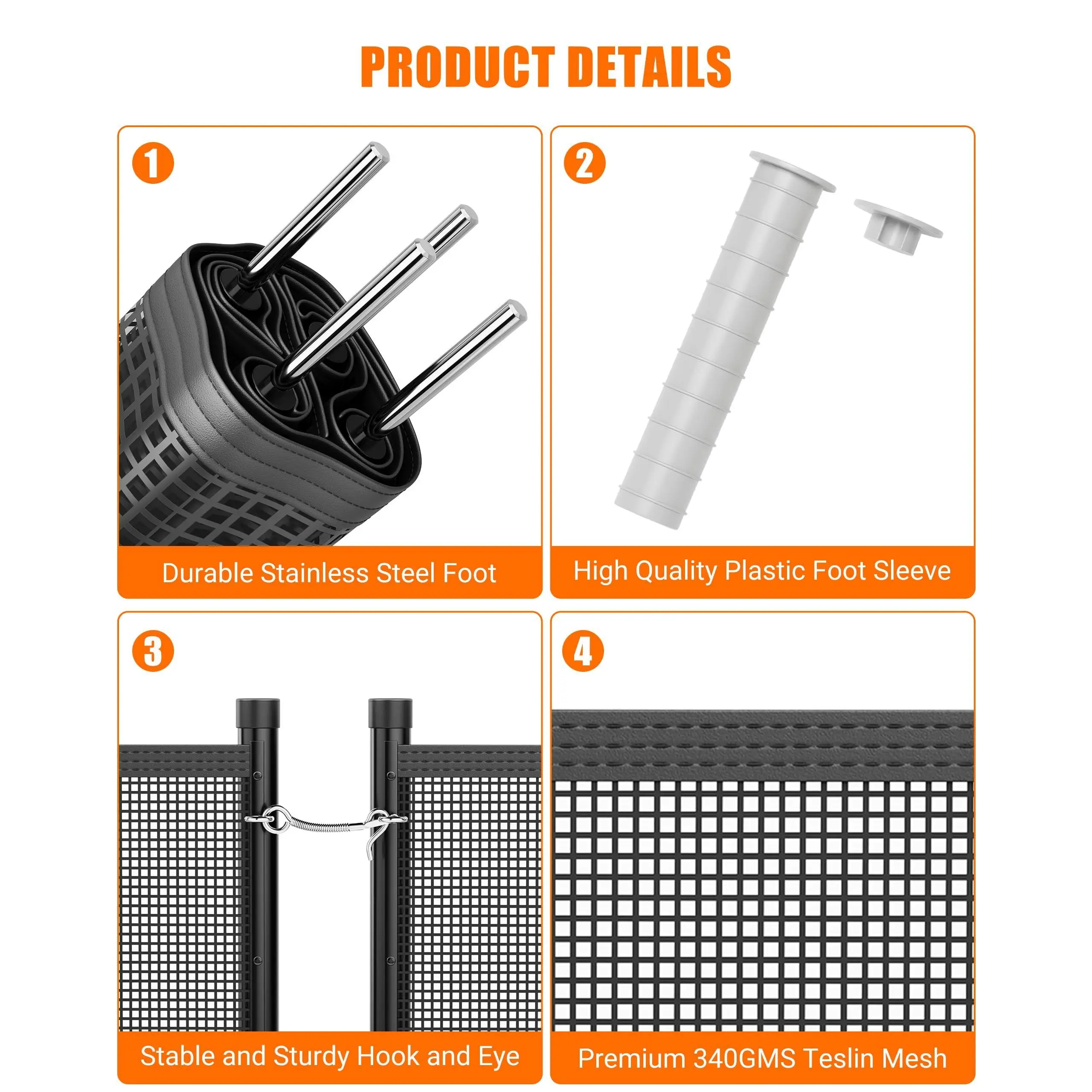 Weatherproof & Unbreakable-Built with rust-resistant stainless steel feet and aluminum frame, this fence withstands harsh weather, wind, and rain. Durable 340gms Teslin PVC mesh resists water, oil, and UV damage.