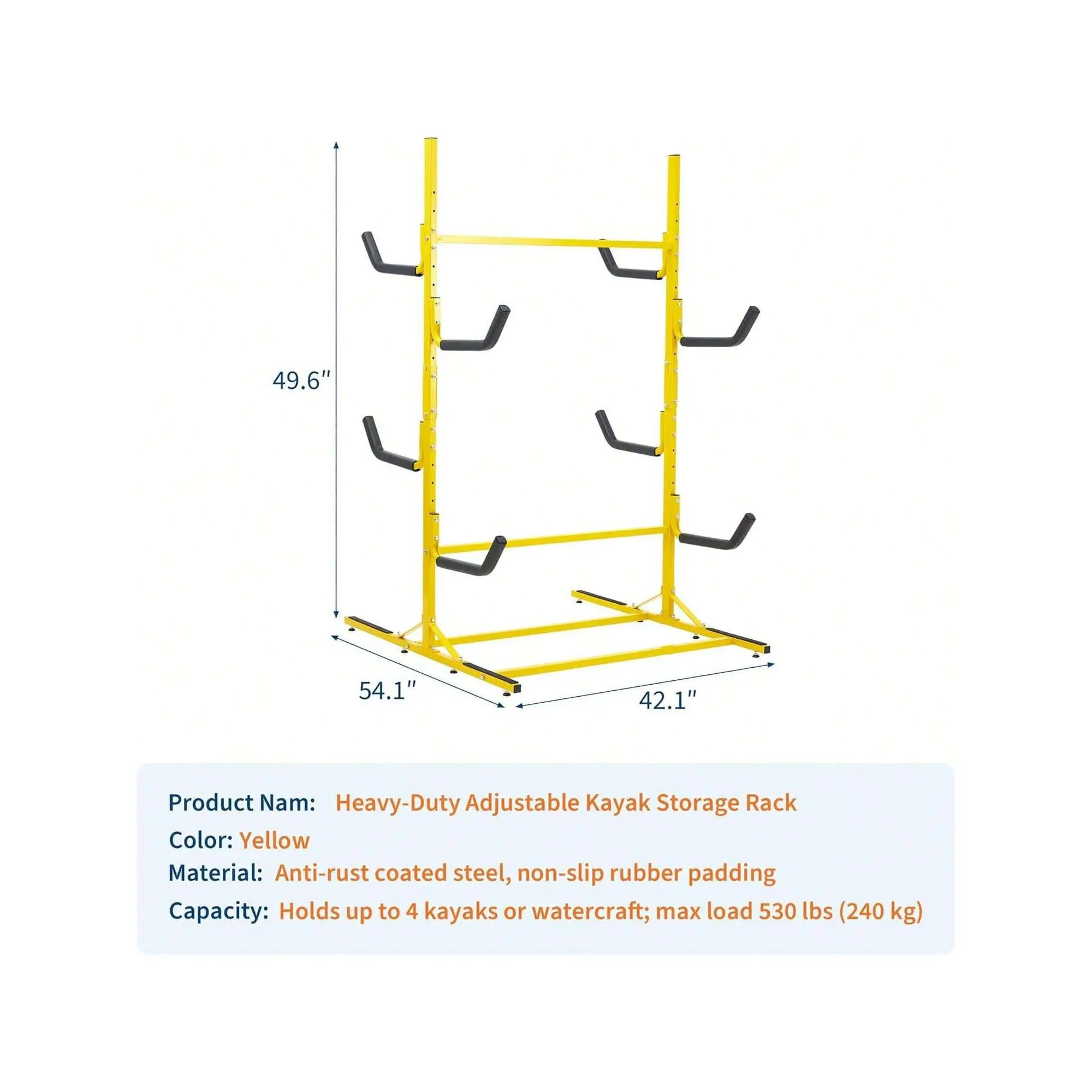 Heavy - Duty Kayak Storage Rack for 4 Kayaks:This freestanding kayak rack is crafted from anti - rust coated steel with non - slip rubber padding. It can hold up to 4 kayaks or watercraft, boasting a max load capacity of 530 lbs (240 kg), providing robust support for your watercraft collection.