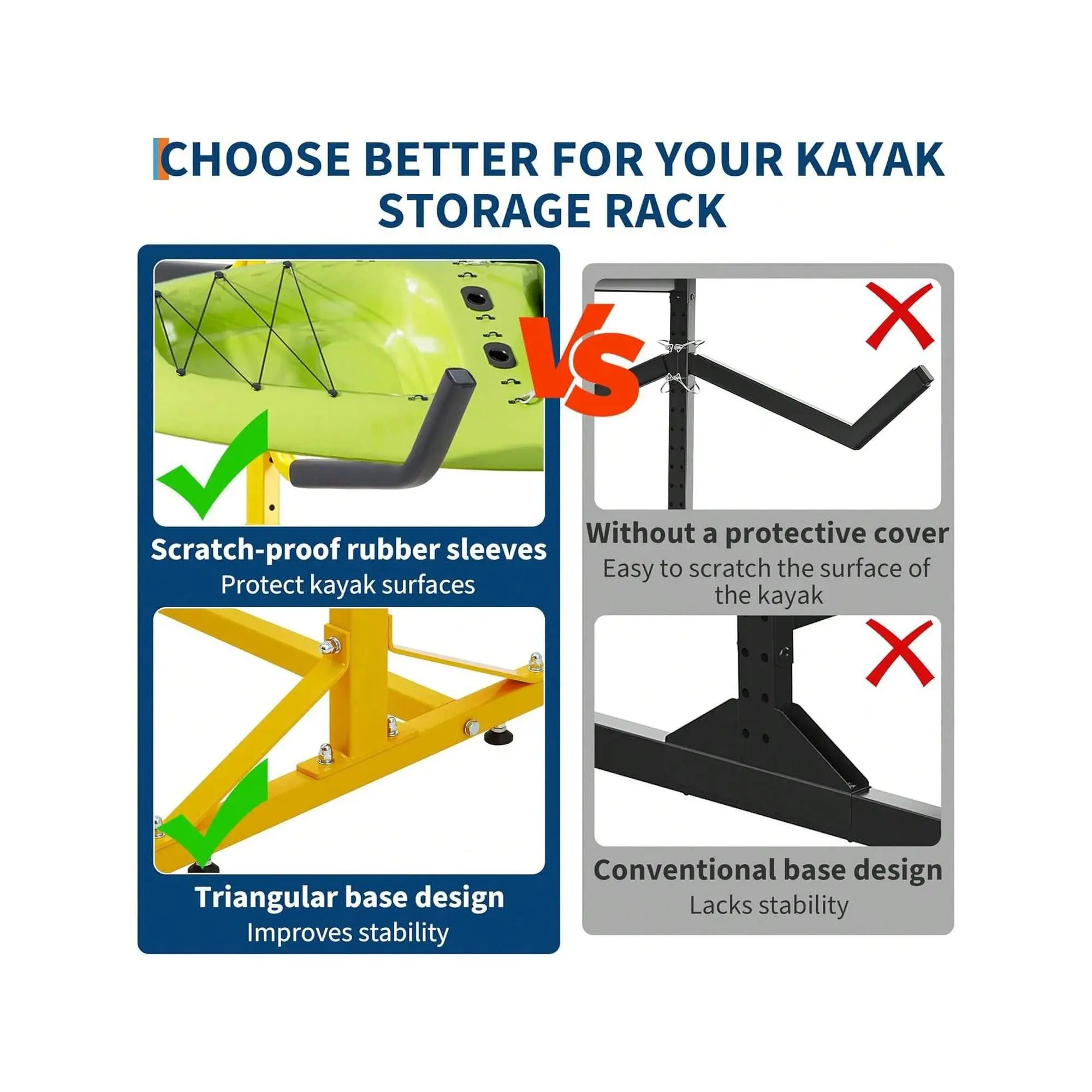 Easy - to - Use Freestanding Kayak Rack:Designed for user convenience, this kayak storage rack combines durability and practicality. Its sturdy construction and thoughtful design elements, like the reinforced structure and protective padding, make it an ideal choice for organizing and safeguarding your watercraft.