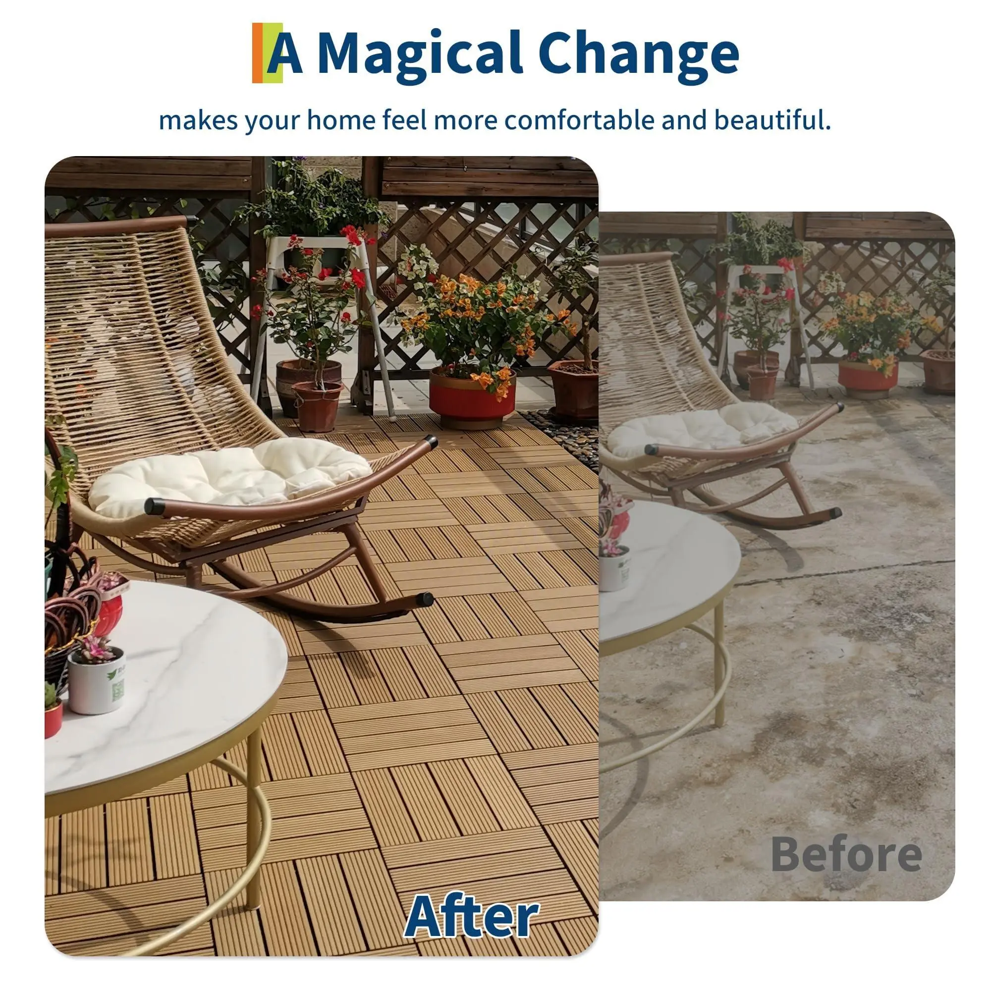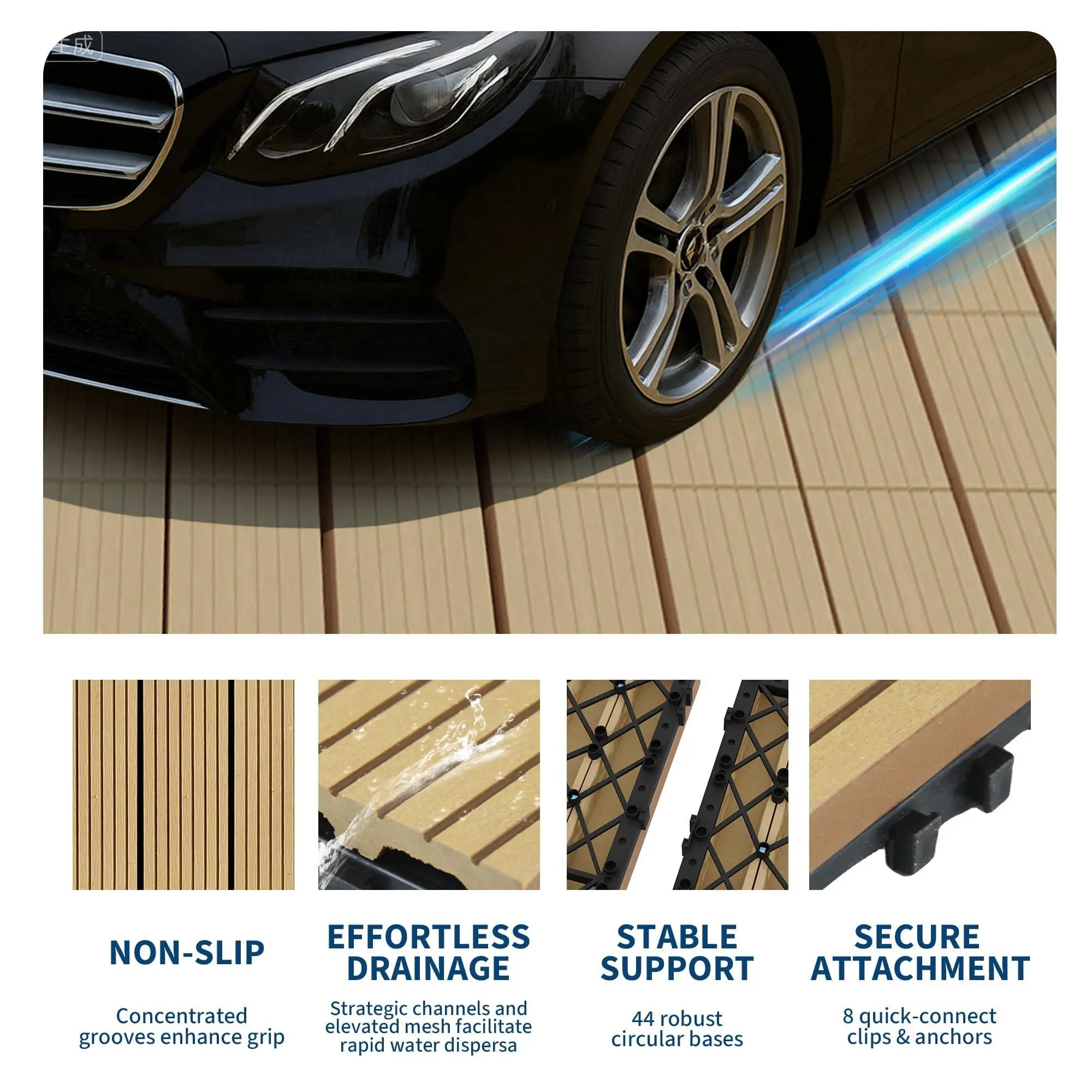 5,【Safe, Anti-Slip & Weather-Resistant]:The textured wood-grain surface provides reliable slip resistance, even when wet, making these tiles a safe choice for pool decks and other high-moisture areas. Built to withstand sun, rain, wind, and heat, they remain durable and stable across seasons, offering a dependable and attractive surface year-round.