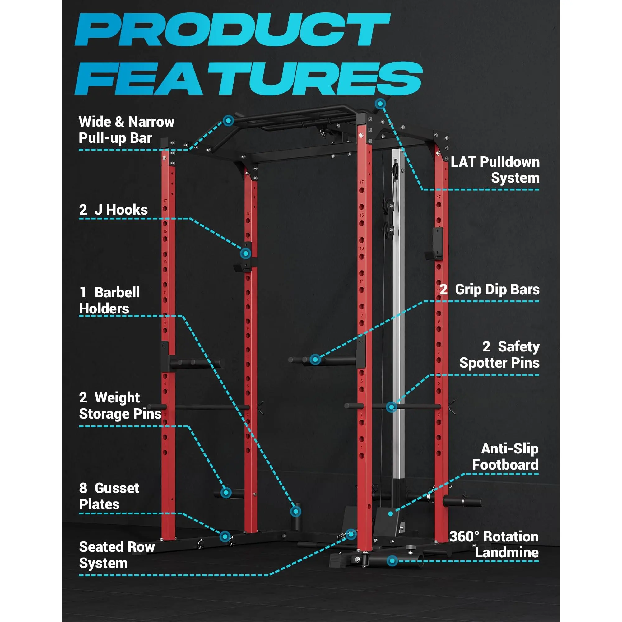 【All in One Home Gym Power Rack】Upgrade your home gym equipment with this multifunctional power cage squat rack. Perform squats, bench press, pull-ups, dips, lat pulldowns, seated rows, landmine rotations, and more—your complete at home gym in one machine.