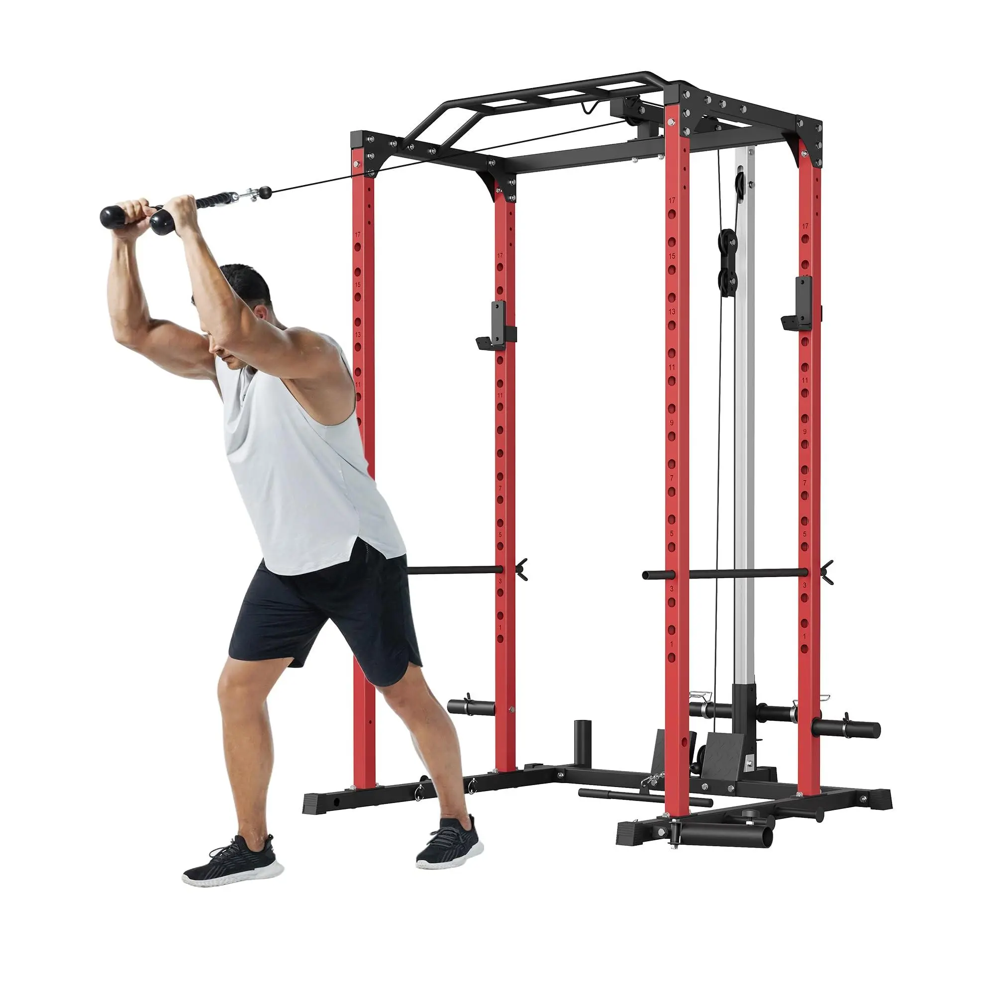【Versatile Workout Station】Features a multi-grip pull up bar, secure J-hooks for barbell racking, dip bars for chest and triceps, and a pulley system for home gym workouts. Perfect for building strength, functional training, and calisthenics equipment exercises.