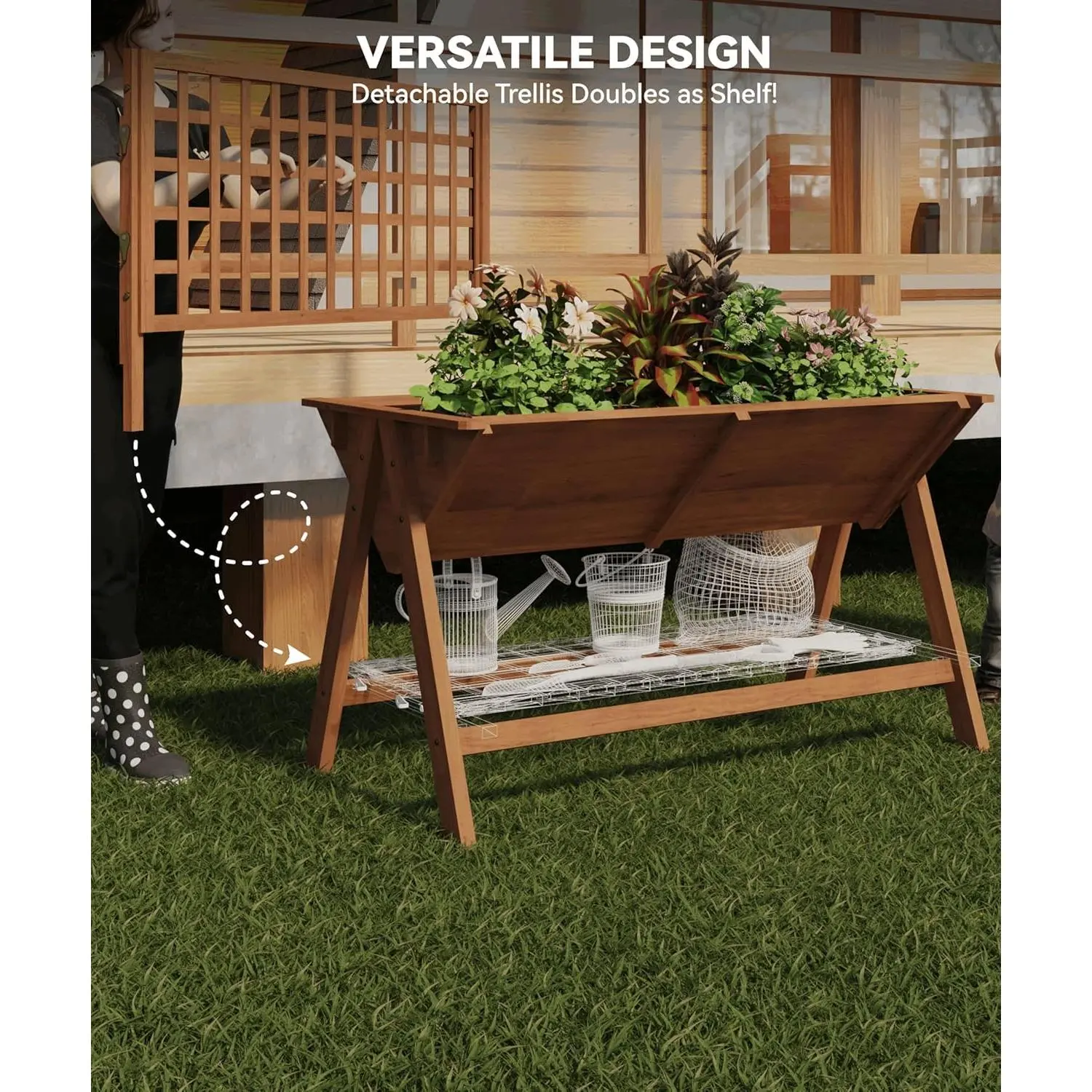 Mobile Raised Garden Bed with Trellis & Storage Shelf – Wooden Planter Box with Legs, Lockable Wheels, Drainage Holes, Protective Liner, Oak