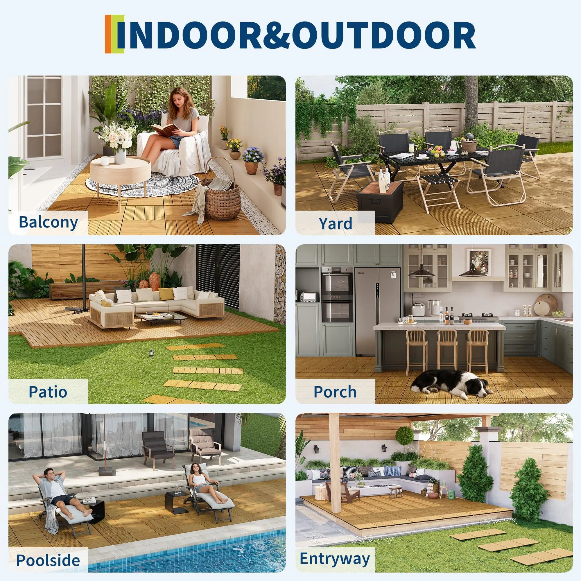 3. VERSATILE INDOOR & OUTDOOR USE:Perfect for upgrading patios, balconies, pool decks, garden paths, and walkways. Also suitable for indoor spaces such as basements, sunrooms, or living areas. Simply lay flat over concrete, tile, existing wood, or pavers for an instant surface refresh. A renter-friendly, non-permanent solution for both outdoor and indoor transformations.