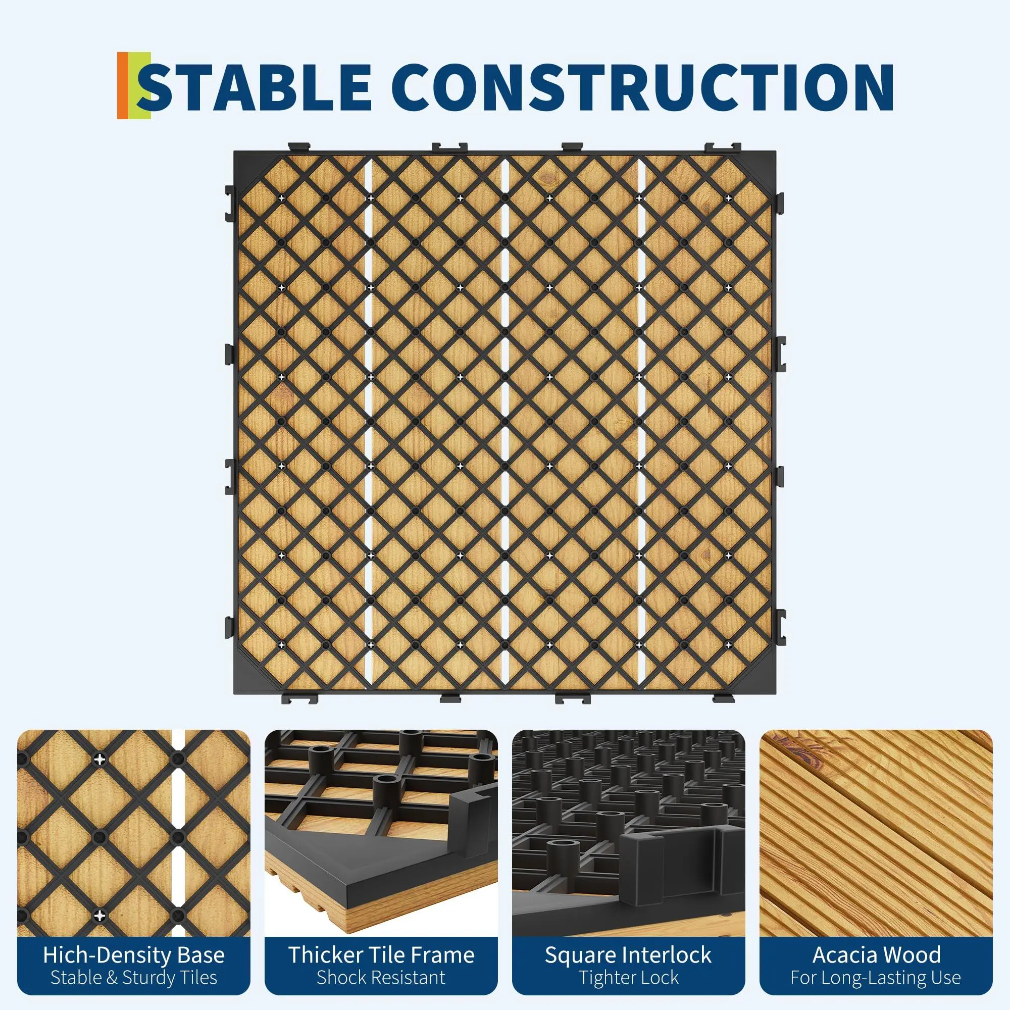 1. PREMIUM ACACIA WOOD CONSTRUCTION:Crafted from durable, sustainable solid acacia wood paired with a reinforced high-impact plastic base. This premium construction is built to withstand harsh weather—including intense sun and heavy rain—along with daily foot traffic. It resists warping, cracking, and fading, while the natural wood finish adds timeless warmth and elegance to patios, balconies, and outdoor living areas.
