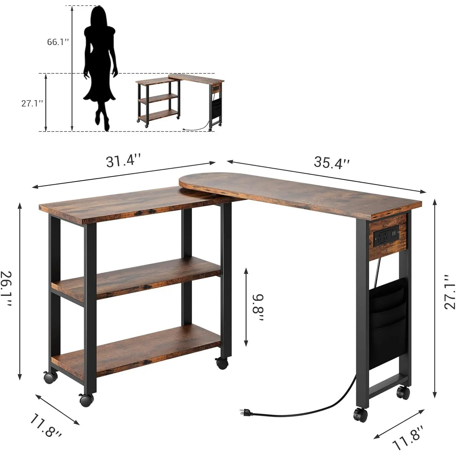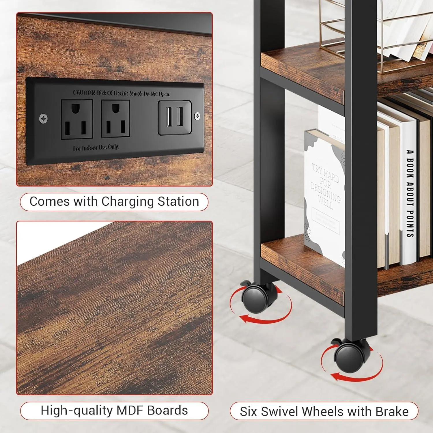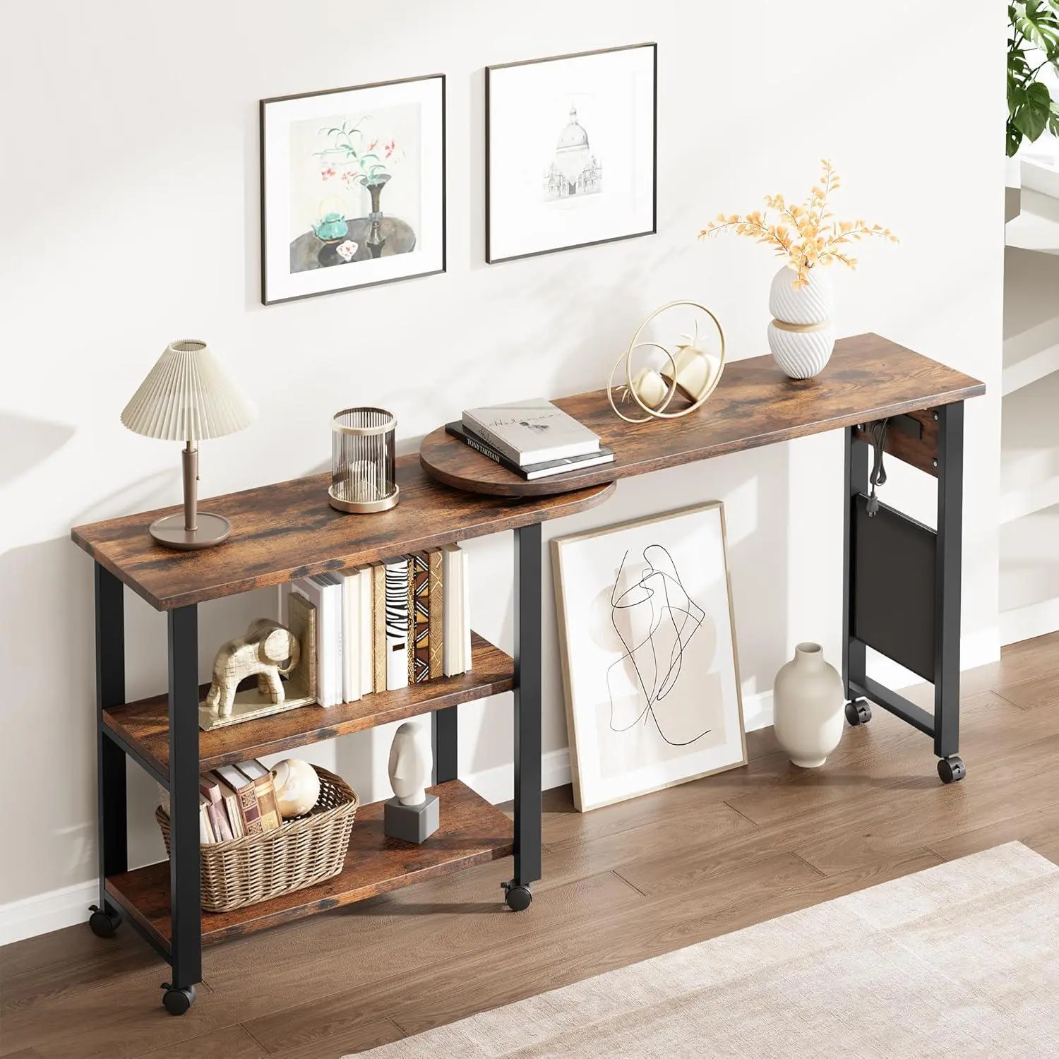 Rotating Sofa Side Table 360 End Table with Charging Station Swivel Side Table with Extra Storage Bag Movable End Table with 6 Swivel Wheels with Brakes for Bedroom Living Room