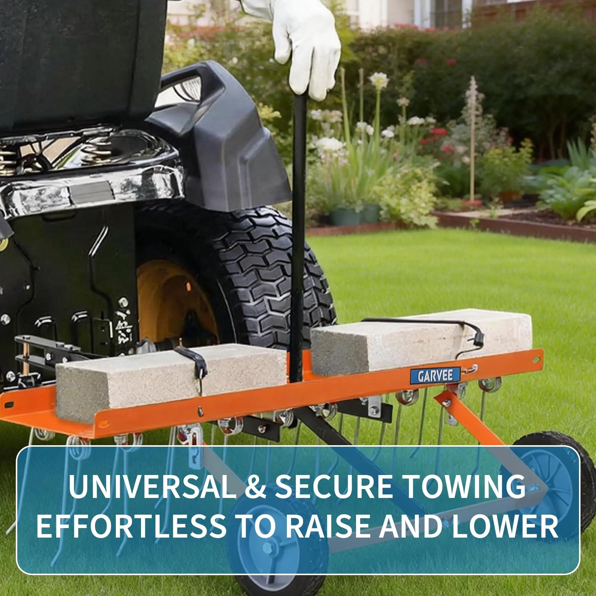 ADJUSTABLE WEIGHT FOR MAXIMUM PENETRATION: The sturdy, all-steel weight tray allows you to add up to 70 lbs of cement blocks (not included) as needed. This adjustable system ensures you achieve the perfect soil penetration depth for any lawn condition,    from soft turf to hard-packed earth.