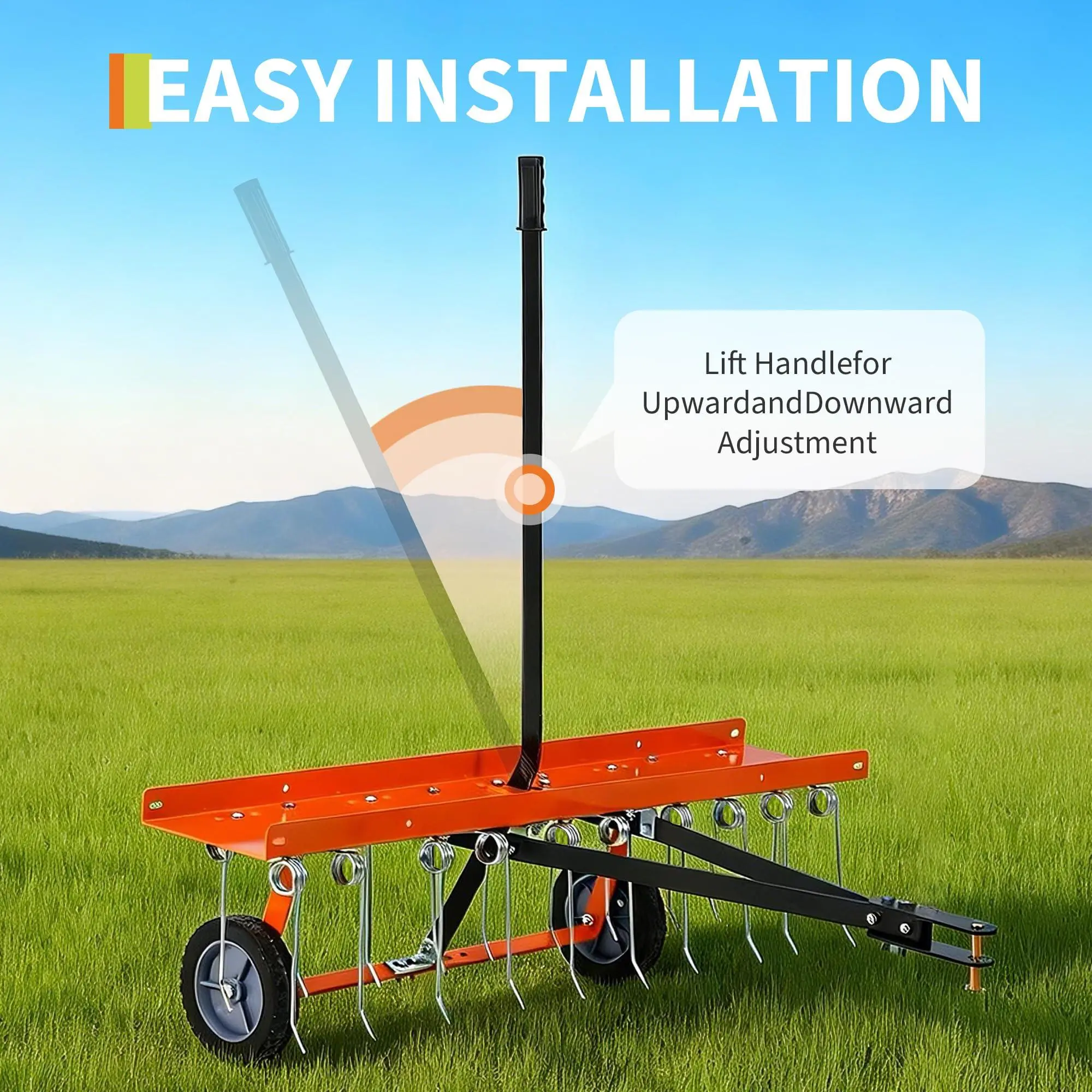 EFFORTLESS SETUP: Arrives with clear instructions for quick, tool-free assembly. A convenient lift handle allows for easy raising and lowering of the tines during transport and operation. Simply hook it up and it's ready to use, saving you time and effort.
