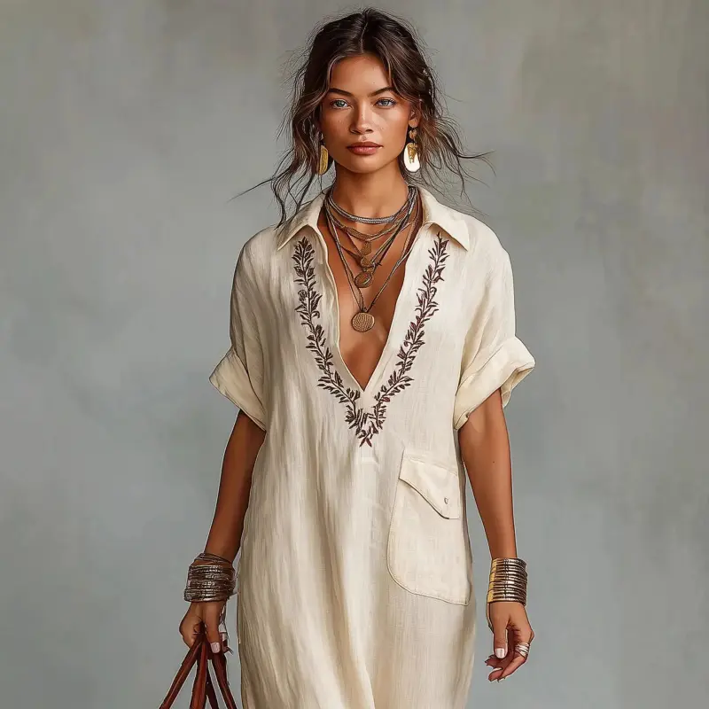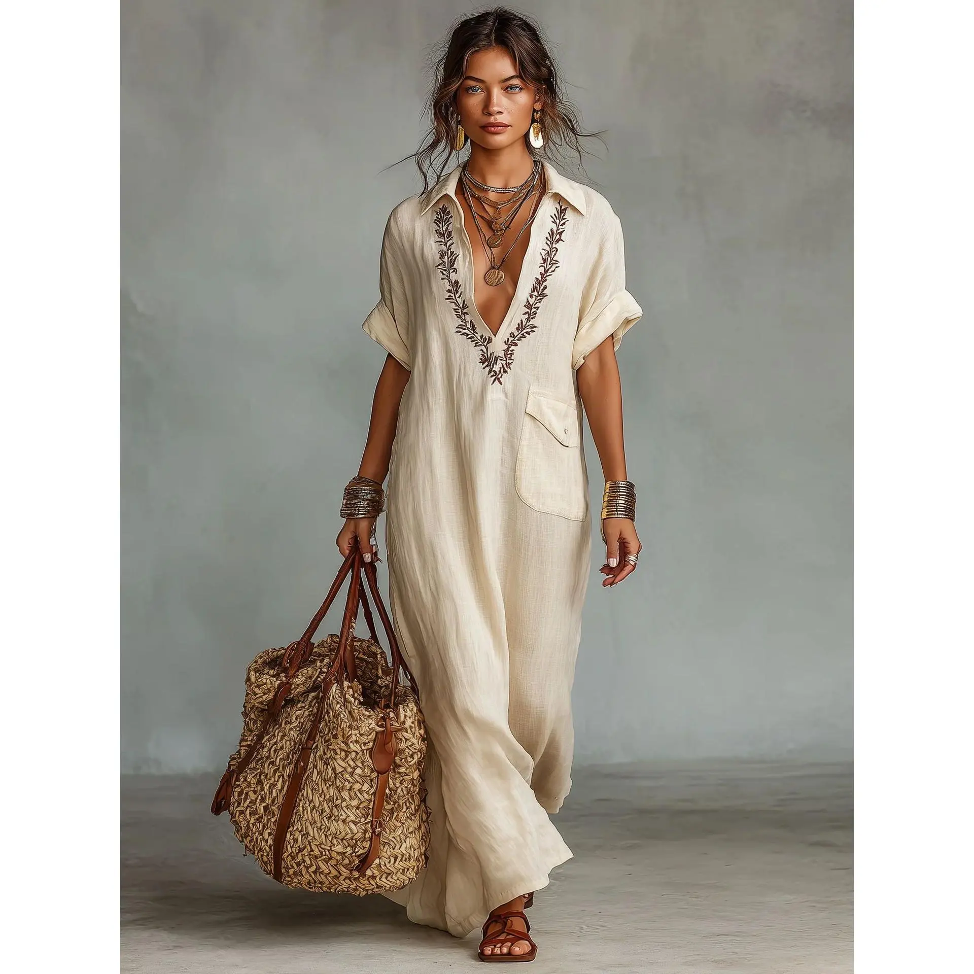 Boho Embroidered Dress - Perfect for Beach, Vacation & Brunch! Casual V-Neck Short Sleeve Pocket Maxi Dress # MaxiDress # Dress # EmbroideredDress # BohoFashion # SummerDress # VNeckDress # WithPocket # Outfit of the Day # WomensFashion