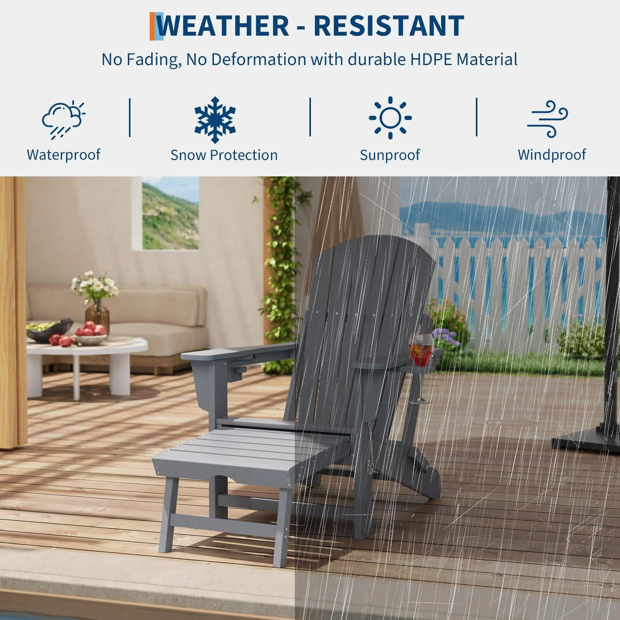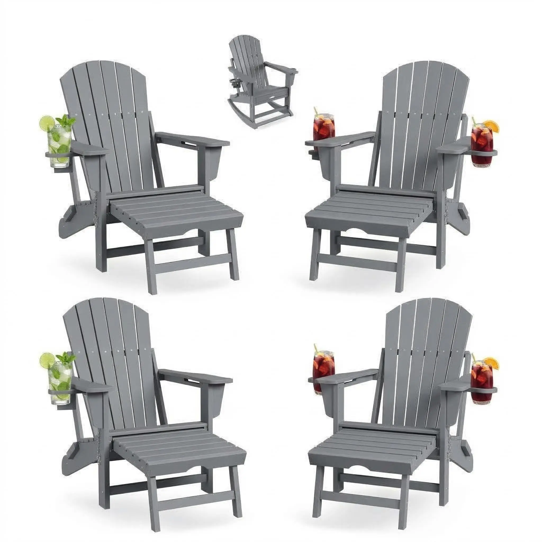 【Complete Outdoor Seating Solution】 This set of 4 chairs transforms your patio, deck, or garden into the ultimate entertainment hub. Each chair features our innovative 4-in-1 design, easily converting between a classic Adirondack chair, a soothing rocking chair (with included removable base), a standalone ottoman, or a full lounger. Perfect for family gatherings, backyard parties, or creating a resort-like atmosphere at home.