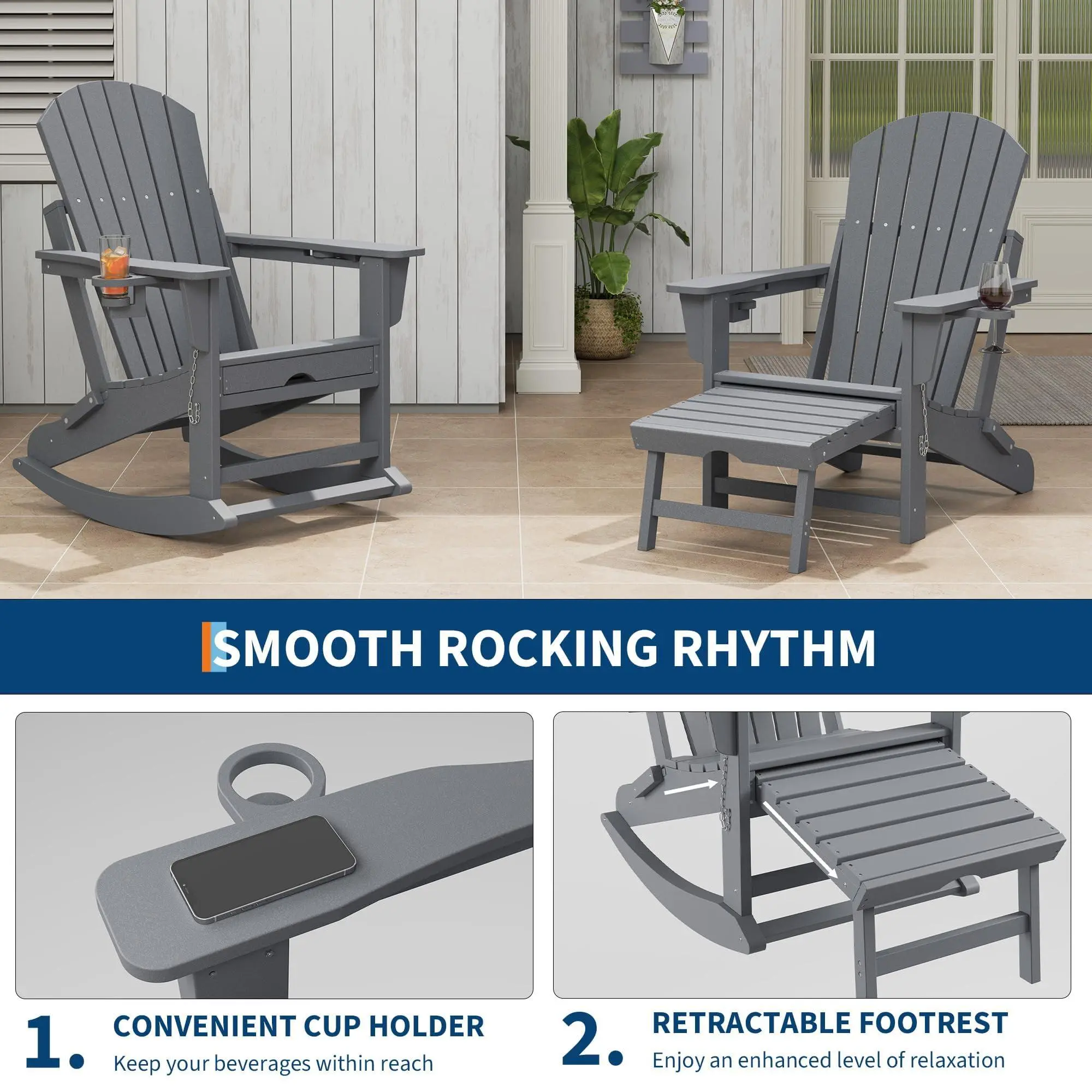 【Removable Rocking Base & Space-Saving Foldability】 Each chair comes with a detachable rocking base for instant versatility—rock gently or remove for stable seating. When the season ends or you need space, all four chairs fold flat for compact, stackable storage. Perfect for garages, sheds, or RV adventures with the whole family.