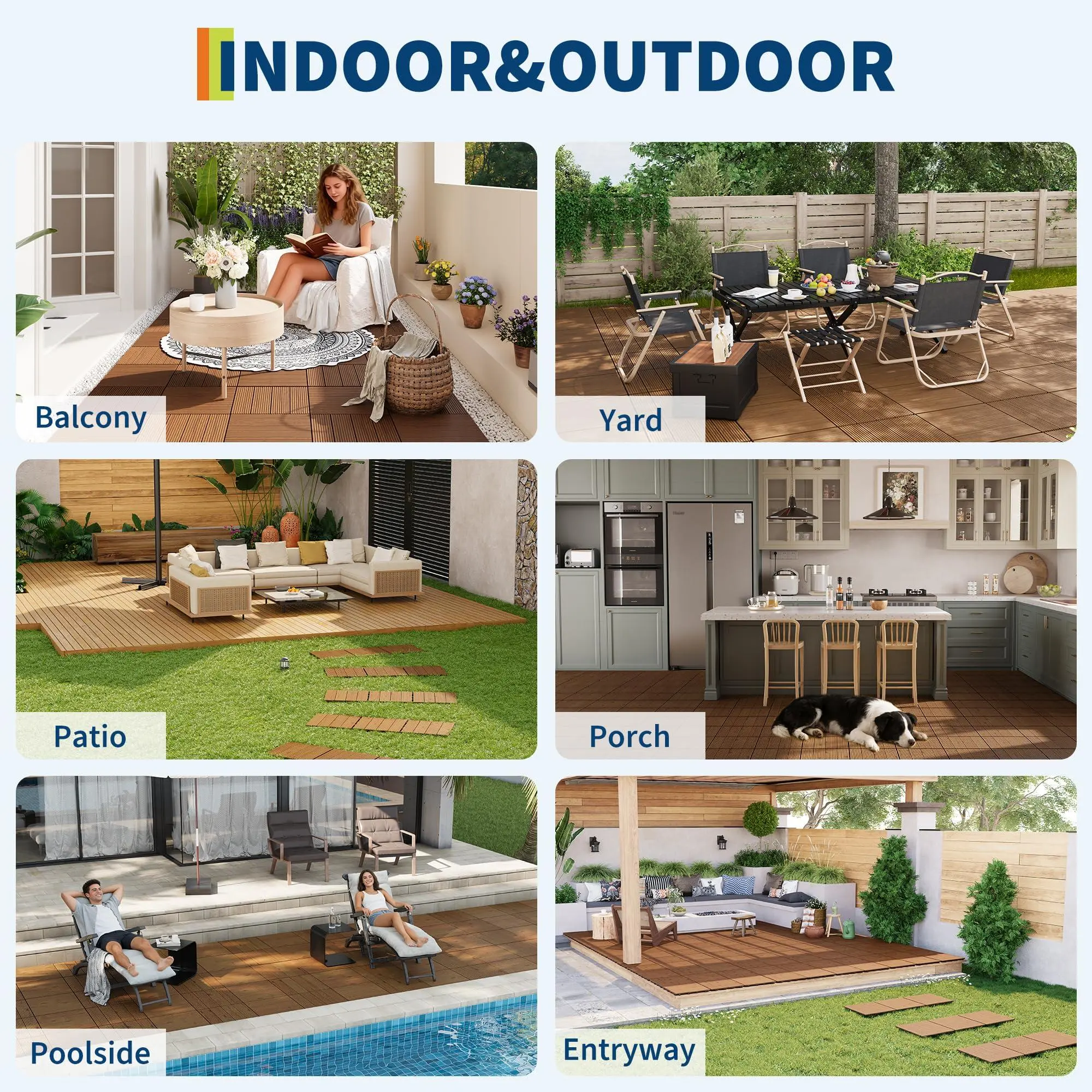 4,LIMITLESS VERSATILITY:Create your dream outdoor oasis anywhere with these designer-inspired interlocking deck tiles. Perfect for balcony flooring, poolside areas, garden pathways, and indoor spaces, they instantly elevate any environment with the rich,    natural warmth of premium Acacia hardwood. These versatile outdoor tiles for patio adapt to various applications while maintaining their elegant appearance and durable performance.