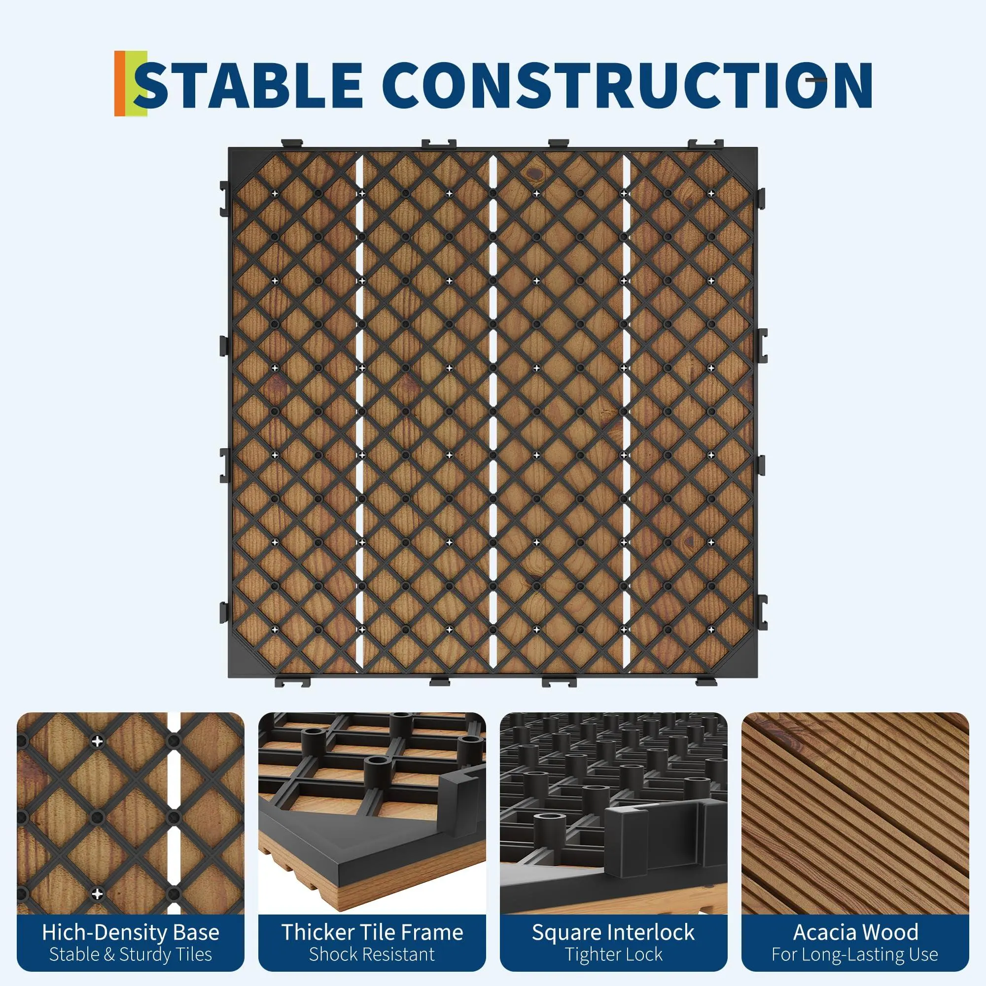 1,PREMIUM QUALITY MATERIALS:Each pack includes 22/33 genuine Acacia wood patio tiles (12"x12") sourced directly from Vietnam, featuring our exclusive Dual-Shield Protection System. This advanced coating technology delivers superior waterproofing and UV    resistance compared to standard single-coated tiles, ensuring long-lasting beauty and durability for perfect outdoor performance. The rich wood grain and natural patterns create an elegant foundation for any space.