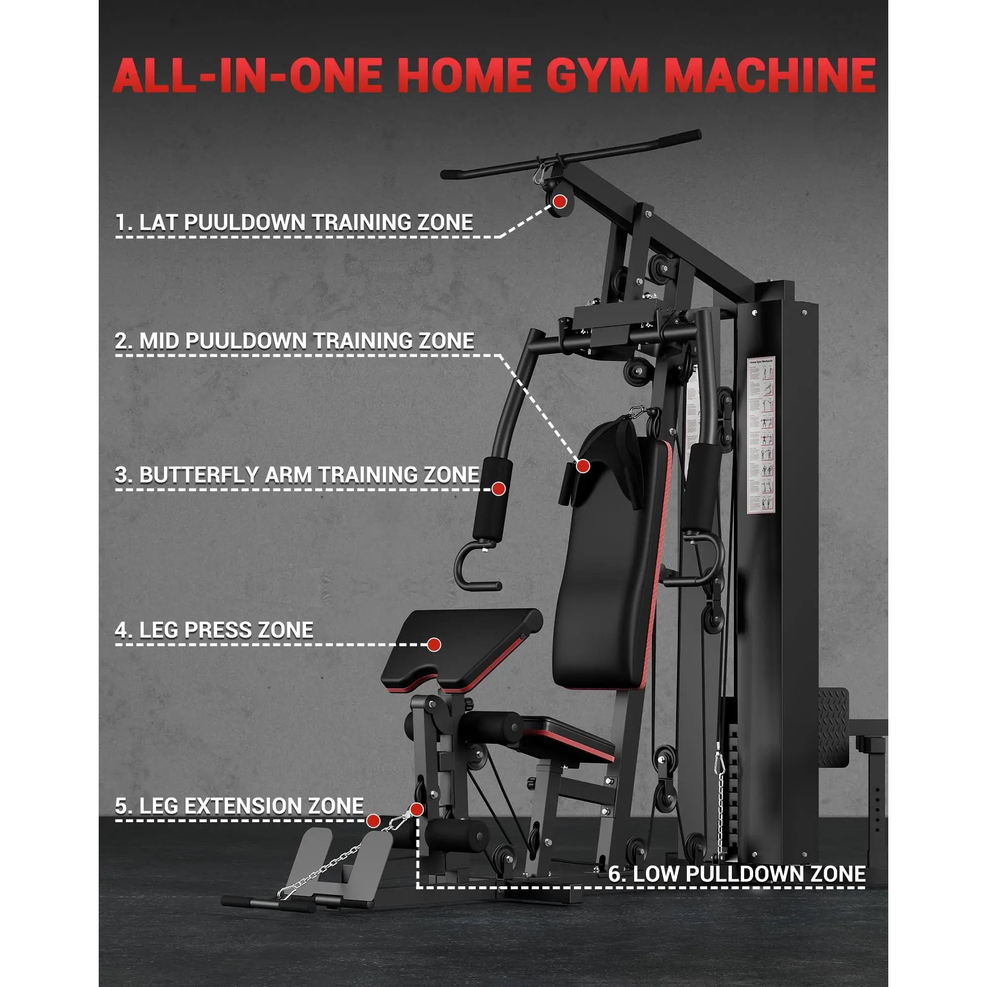 【All in One Home Gym】This multifunctional workout station includes Preacher Curl Pad, Leg Developer, Abdominal Band, Ankle Strap, chest press, butterfly chest, lat pulldown, low row, leg extension, back extension and so on. Equipped with 9+1 weight plates at the same time, with a total weight of 150LBS, you can exercise according to your own needs.