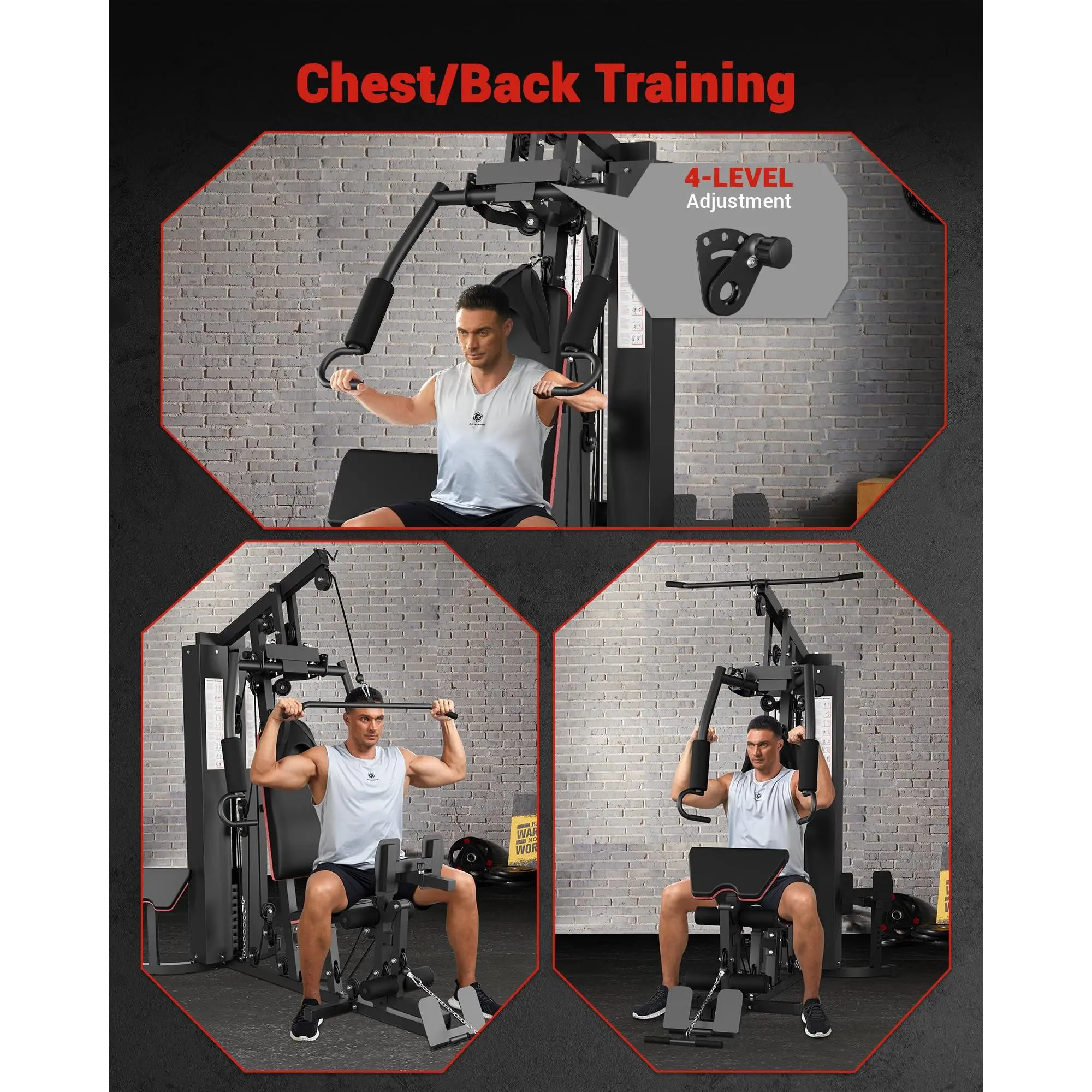 【Adjustable Weight Machines】Our gym station features multiple adjustable settings. The seat cushion has 3 adjustable levels, the arm pad offers 6 levels, the leg pedal provides 6 levels, and the back pad has 5 levels of adjustment.