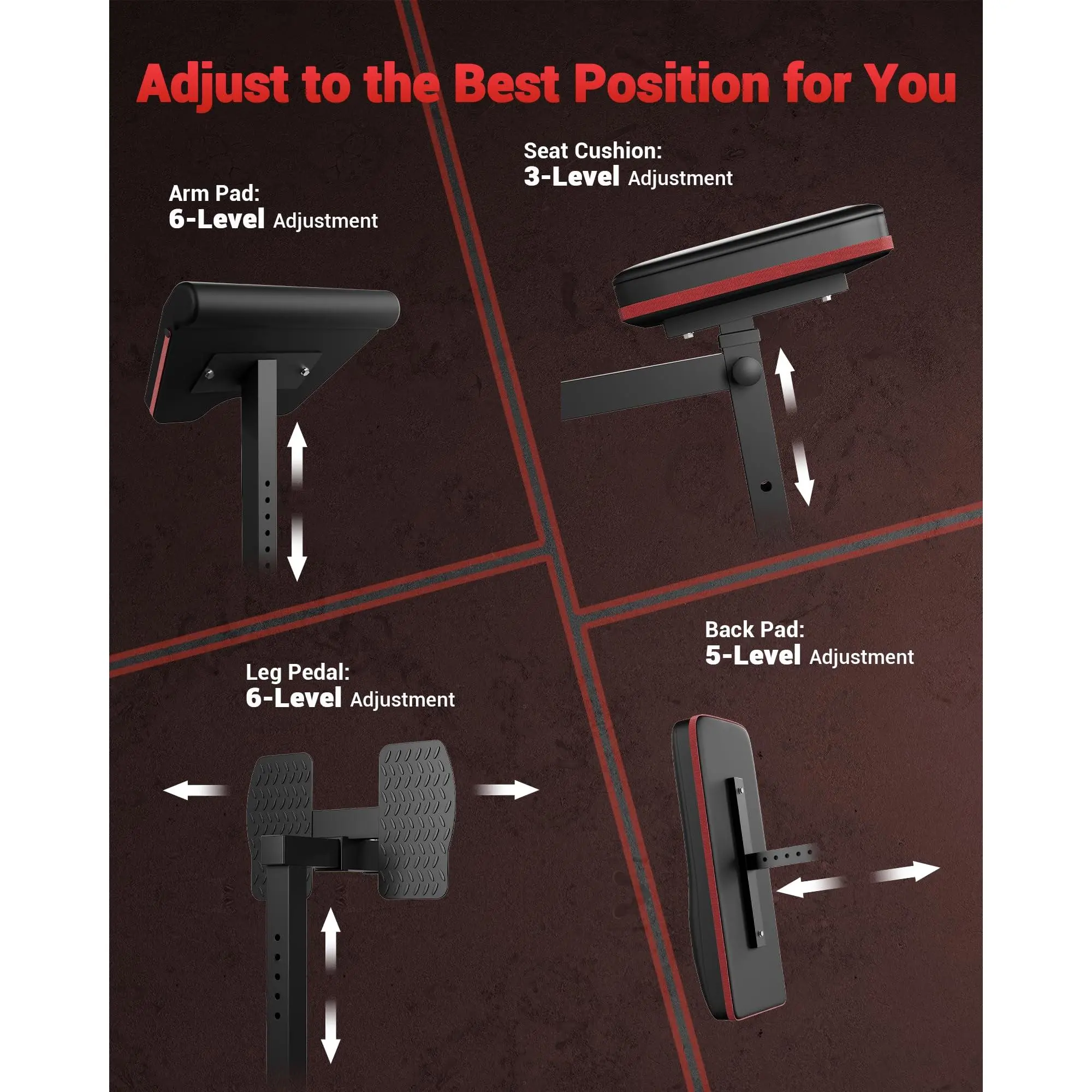 【Adjustable Weight Machines】Our gym station features multiple adjustable settings. The seat cushion has 3 adjustable levels, the arm pad offers 6 levels, the leg pedal provides 6 levels, and the back pad has 5 levels of adjustment.