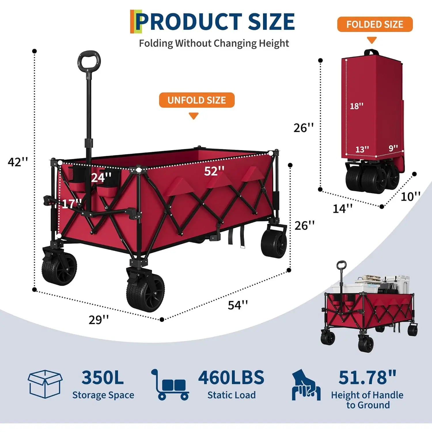 Compact & Foldable Wagon: No assembly needed. Its clever design enables quick and easy setup and folding in just seconds. A handle on the cover allows for smooth movement, making it easy to take anywhere. Folded dimensions (L x W x H): 9 x 13 x 26.8 in. It fits neatly in a closet, garage, or the trunk of any standard car, taking up very little space